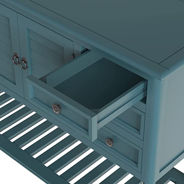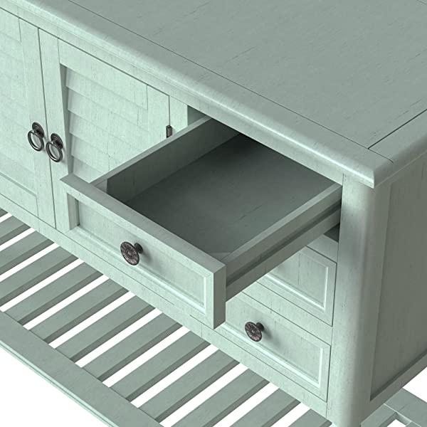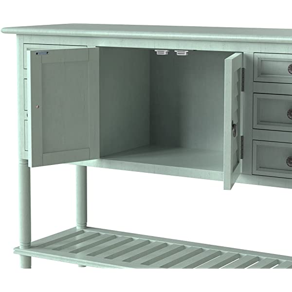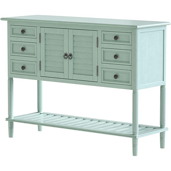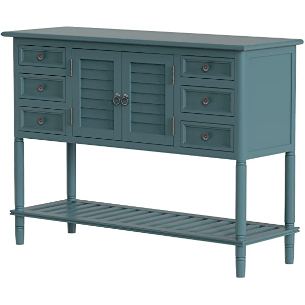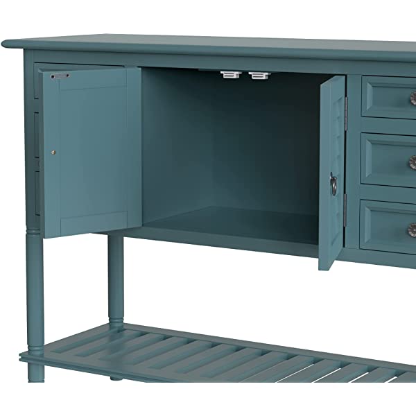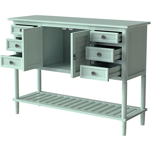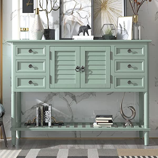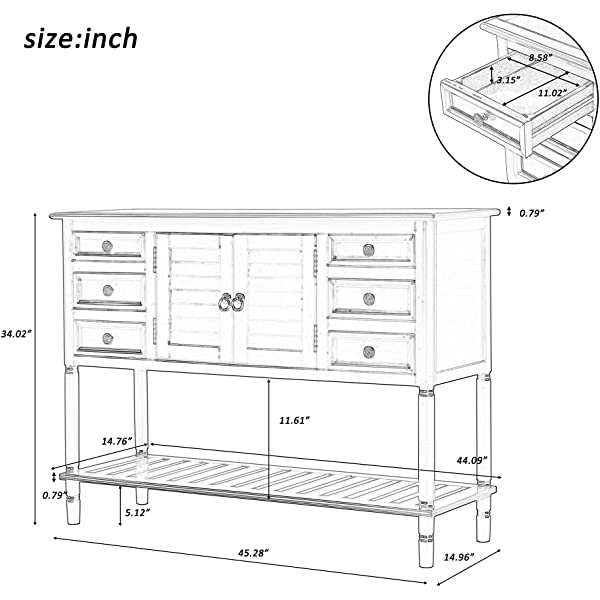 【Easy Assembly】Manufactured for easy assembly, a single person can quickly put this console table with the straight forward step by step instructions with tools included. Large cabinet weight capacity: 27 lbs, table surface weight capacity: 99lbs, Accent drawer weight capacity: 18lbs. 【Eye-catching Versatility】Crafted for versatility, this piece can enhance a variety of spaces and surrounding decors acting as the perfect piece to bring life into any area of your home that needs it most. Great for entry hallways, dining rooms, bedrooms and more. 【Manufactured for Quality】Thick slabs of Pine and MDF wood are expertly crafted for a quality build with solid base legs. Features a veneer reinforced upper surface to prevent wear after prolonged usage. 【Mixture of Modern & Vintage Elements】Aspects of both modern and vintage come together to create this unique piece, featuring farmhouse inspired wood frame detailing on the outer drawers with contrast from the iron handles for heightened appeal. 【Large Storage Space】With built in shelving ranging from the front double doors to the 6 drawers, users will have plenty of space to store their belongings and avoid letting clutter accumulate on the console table.