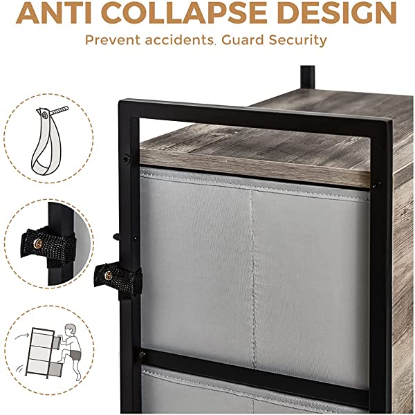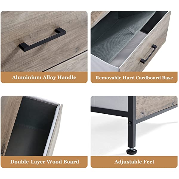 【Fast Set Up】- This dresser can hold weight up to 21.5LBS;Dimensions:38.4 "L x 11.7"W x 24.6"H.7inch; Detailed manual and needed hardwares are provided, set it up within 20 minutes. 【Easy Slide In Out】 - Special workmanship to keep the drawers always at their slots,Super easy to slide in and out but will not bend or fall down. 【Stable&Steady】 - This storage tower unit comes with 4 adjustable feet to enhance the stable for the dresser and the X cross bar adds extra steady to avoid wobbles and tilt. 【Sturdy Structure】 - Water resistant wood top with natural wood texture, pairing with thicker metal frame, provide stability for the dresser, and for a long service life. 【Say Goodbye to Chaos】- This dresser chest is full and there's no place for pajamas,blankets, bit and piece.This dresser tower organize them in 4 spacious fabric drawers, good for the limited space.