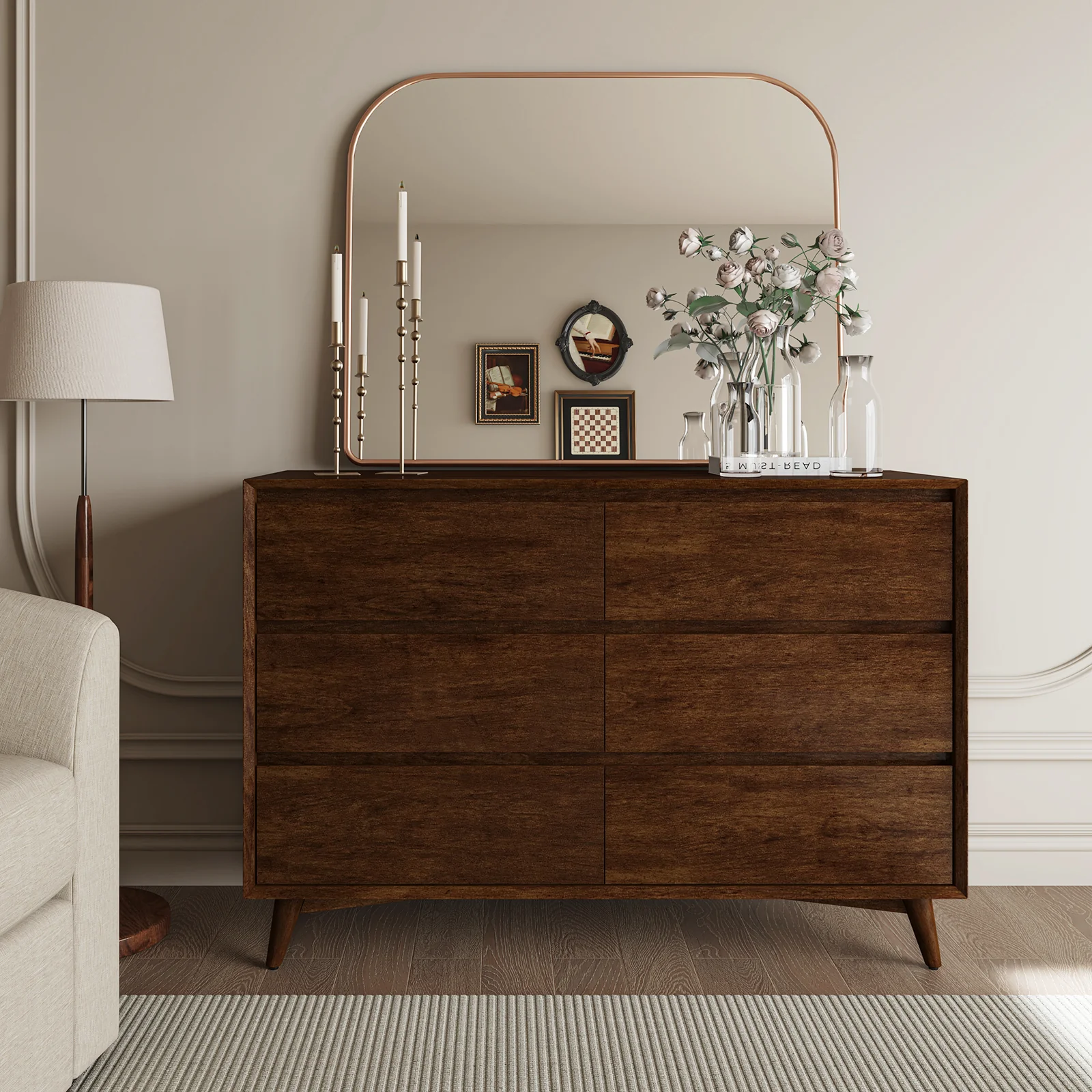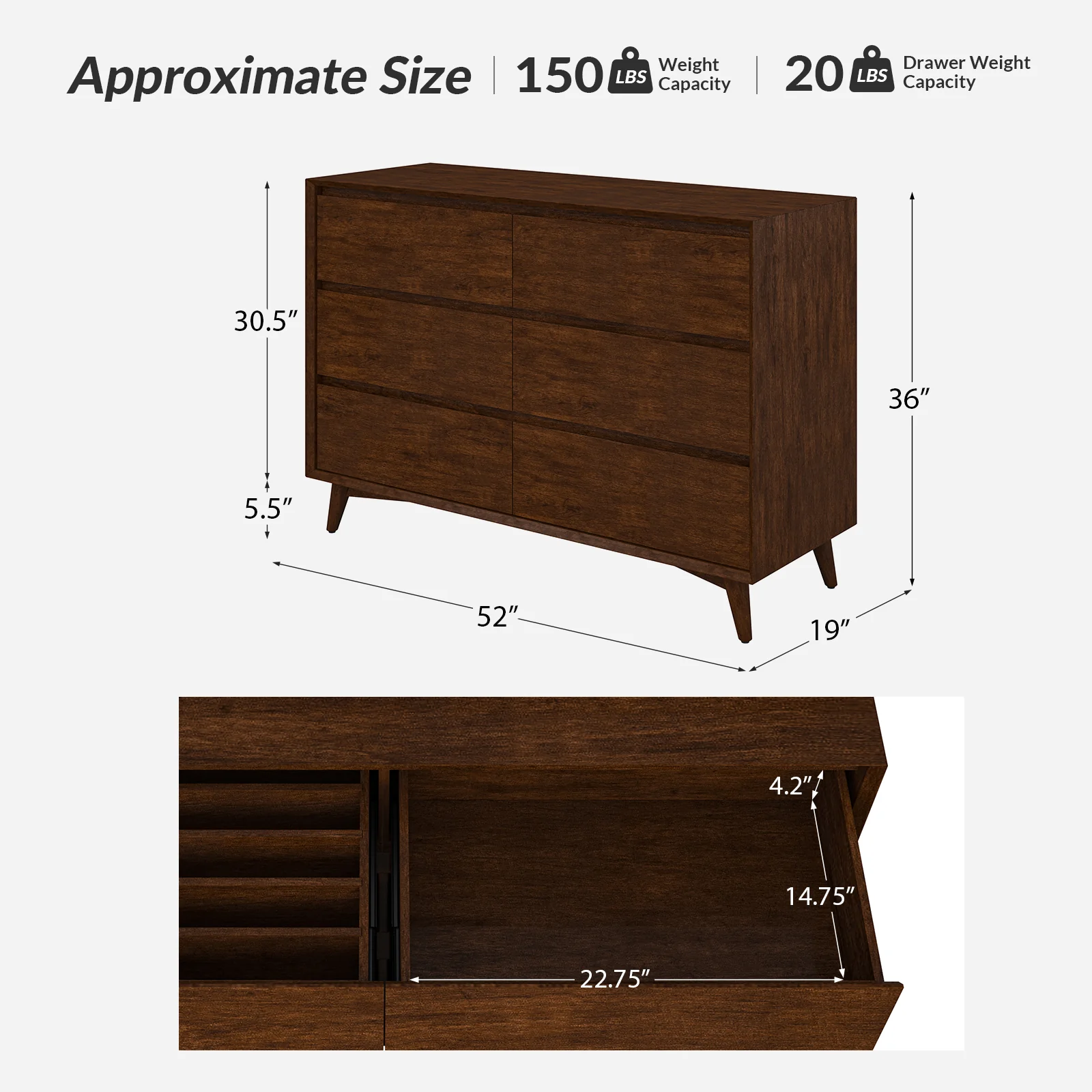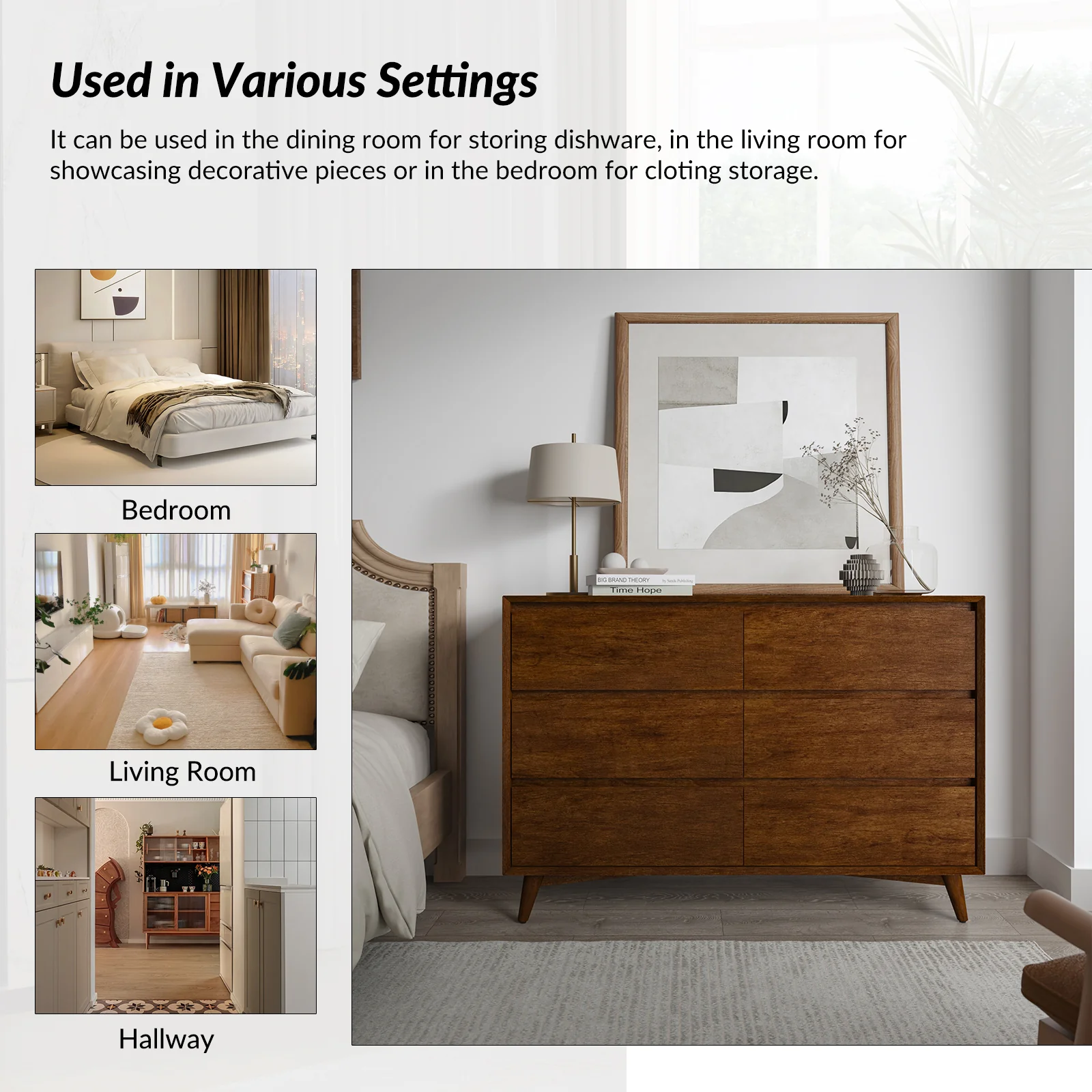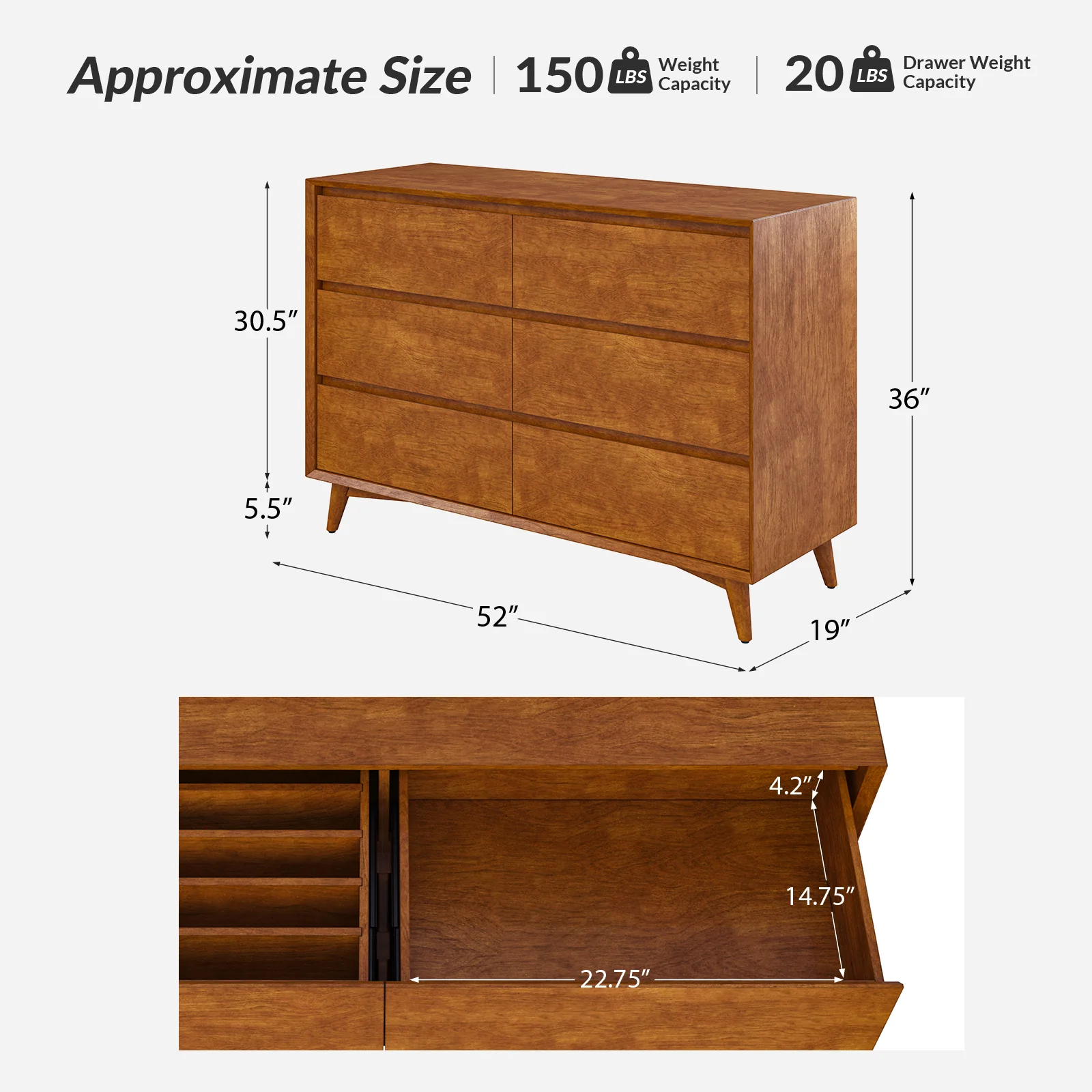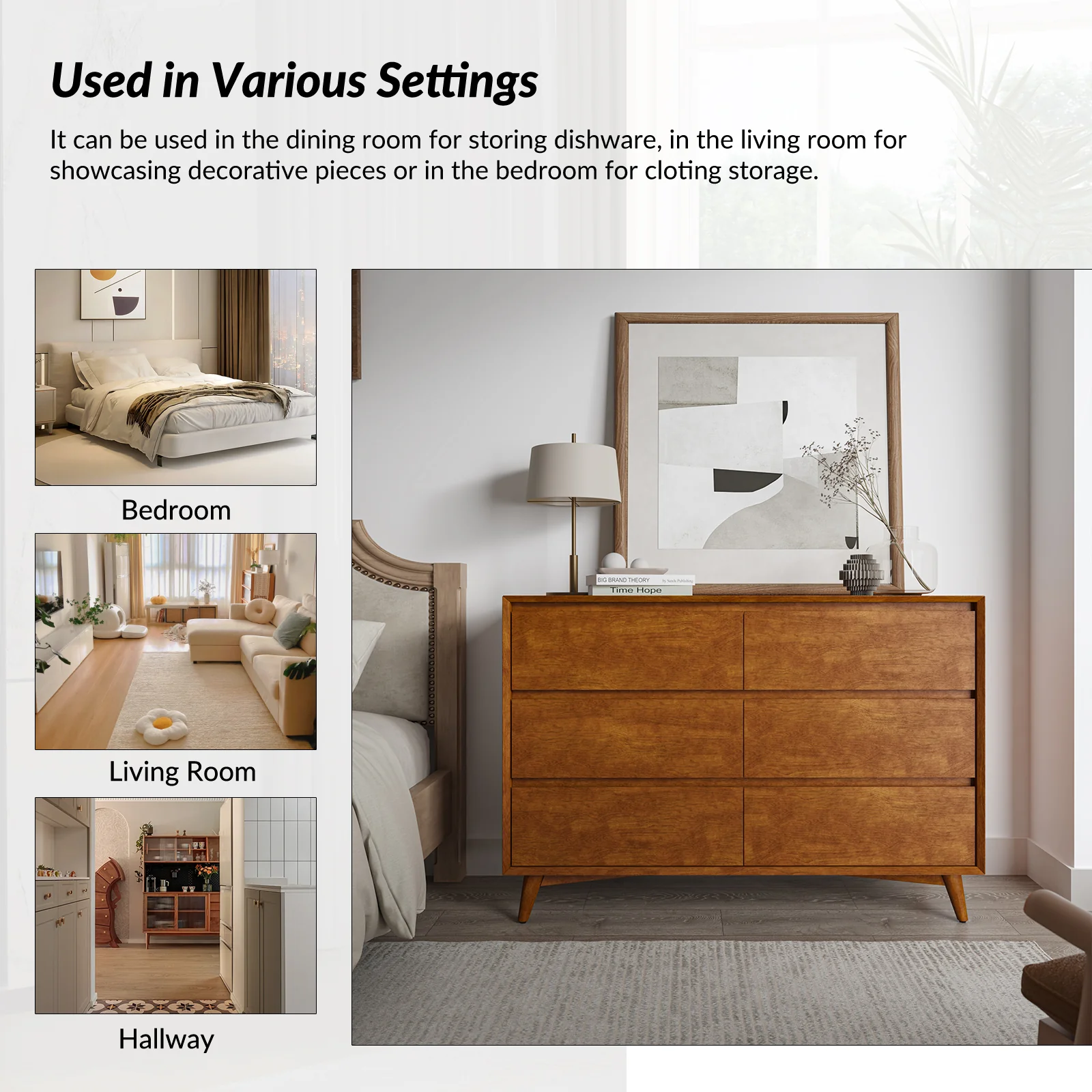 The mid-century 6-drawer nursery dresser embodies sleek sophistication with its timeless design. Crafted with sturdy materials, it offers ample storage space for your nursery essentials while maintaining a minimalist aesthetic. The drawers feature internal partitions, allowing for easy organization of your belongings. The solid wood legs provide stability and durability. Additionally, the adjustable feet ensure stability on uneven surfaces. This nursery dresser seamlessly blends functionality with style, making it a versatile addition to kids bedroom or living area. Enjoy the fusion of practicality and elegance with this tastefully designed piece of furniture.