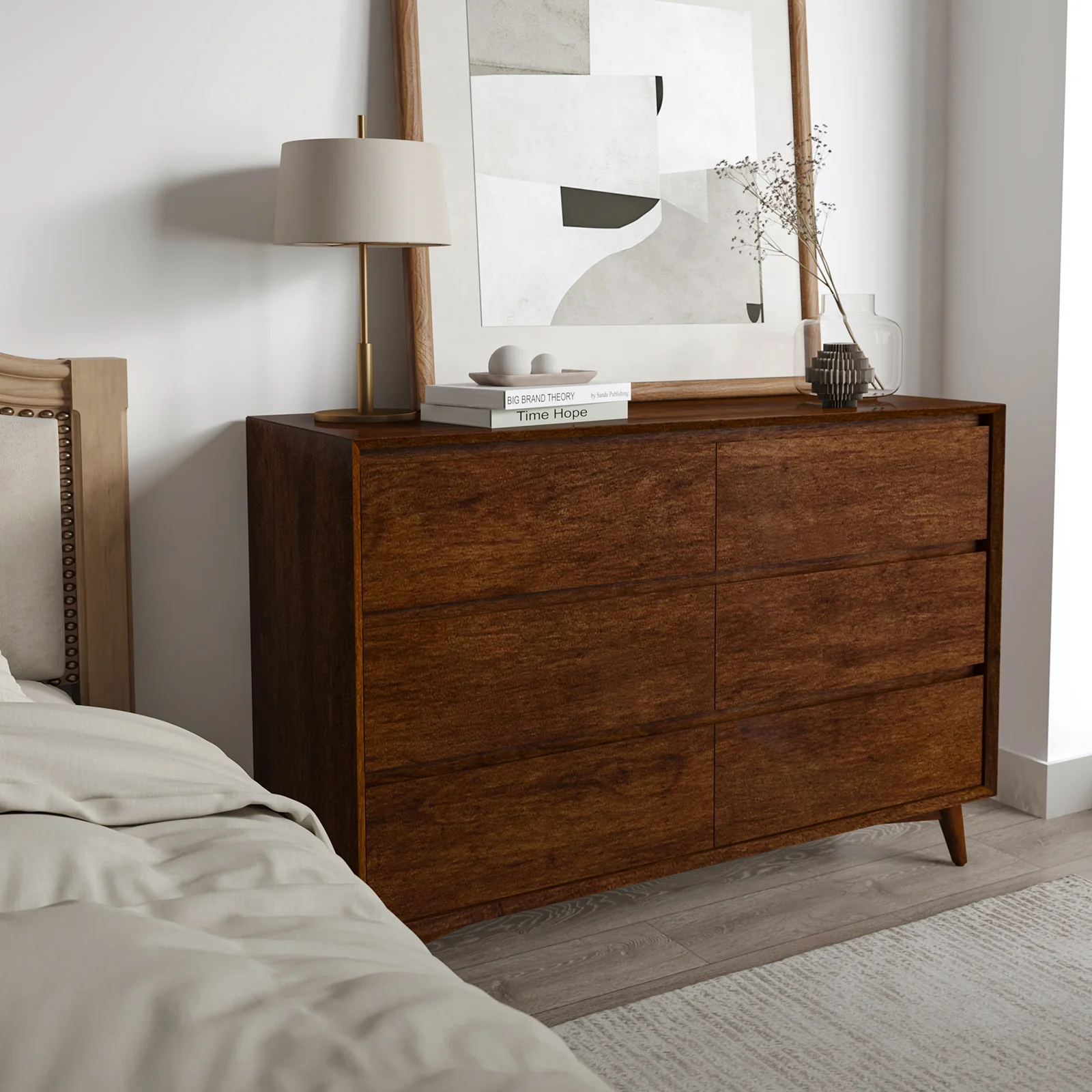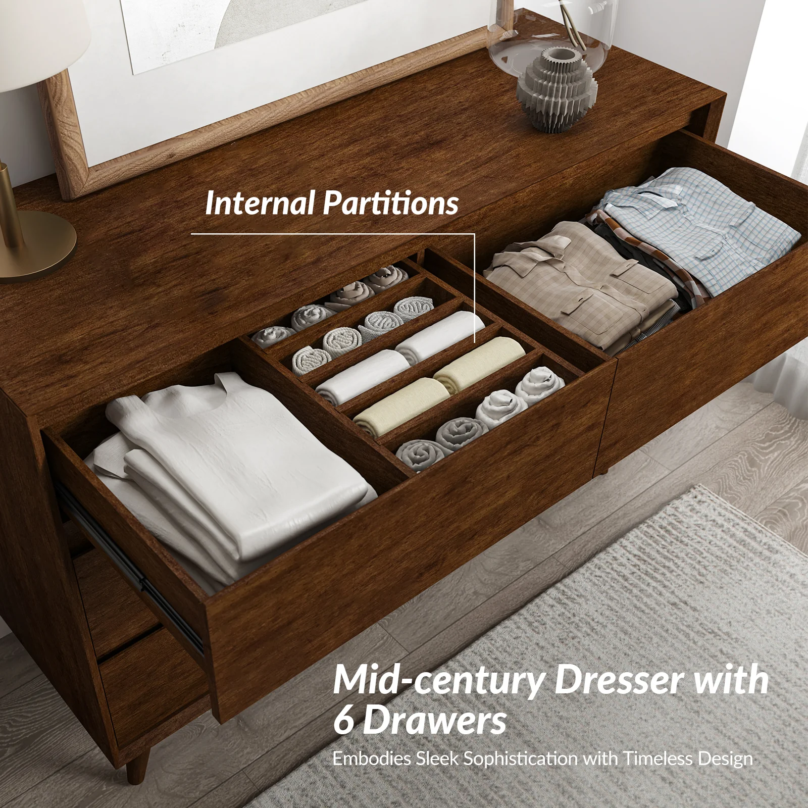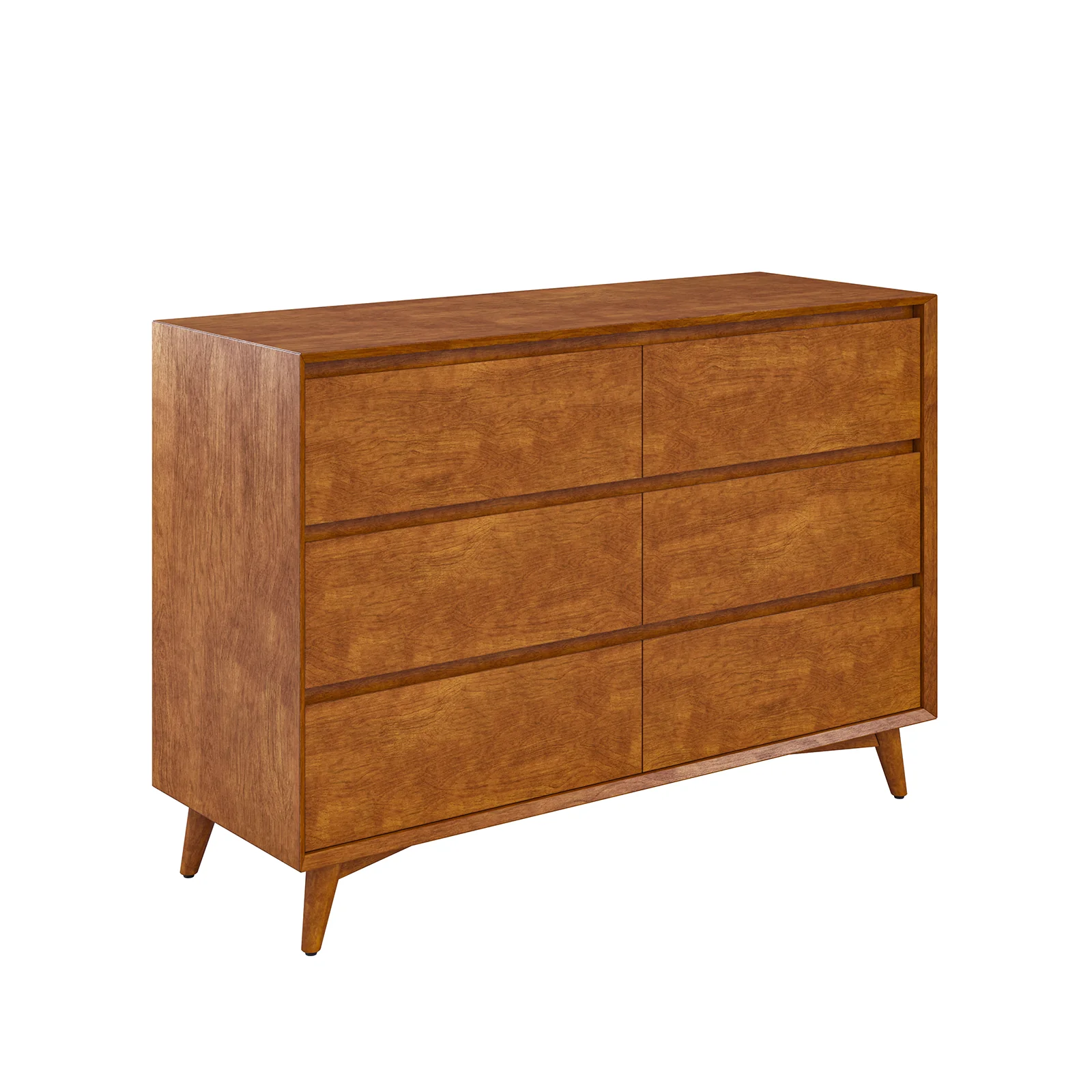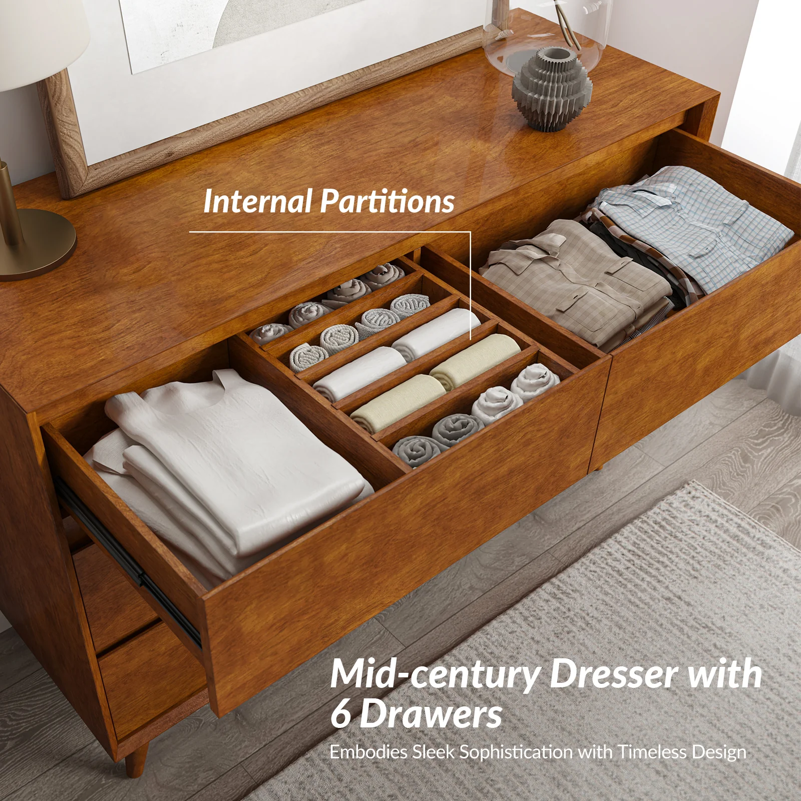 The mid-century 6-drawer nursery dresser embodies sleek sophistication with its timeless design. Crafted with sturdy materials, it offers ample storage space for your nursery essentials while maintaining a minimalist aesthetic. The drawers feature internal partitions, allowing for easy organization of your belongings. The solid wood legs provide stability and durability. Additionally, the adjustable feet ensure stability on uneven surfaces. This nursery dresser seamlessly blends functionality with style, making it a versatile addition to kids bedroom or living area. Enjoy the fusion of practicality and elegance with this tastefully designed piece of furniture.