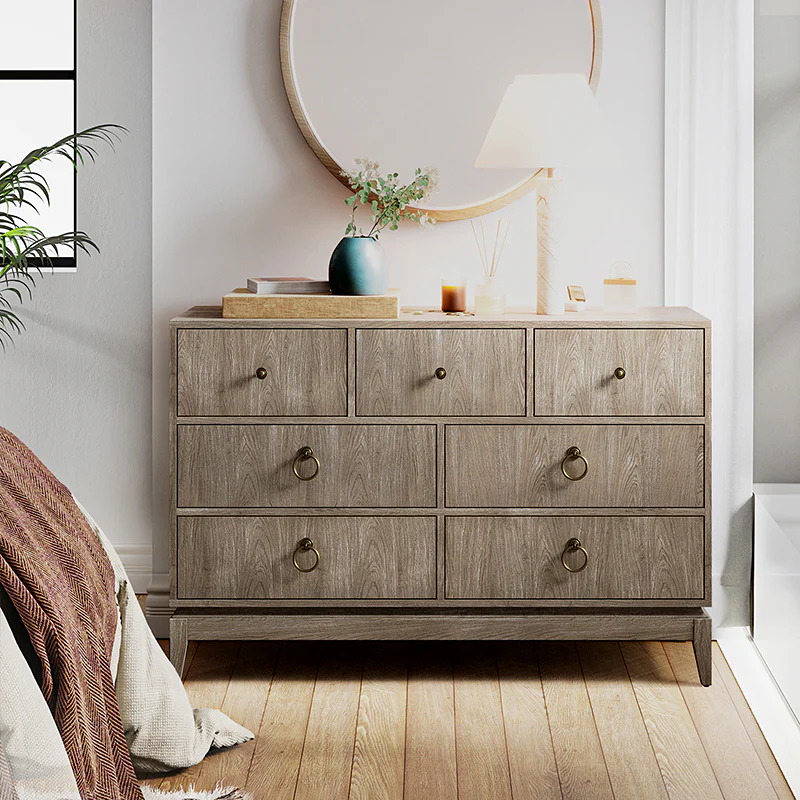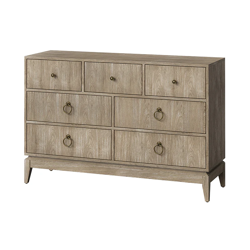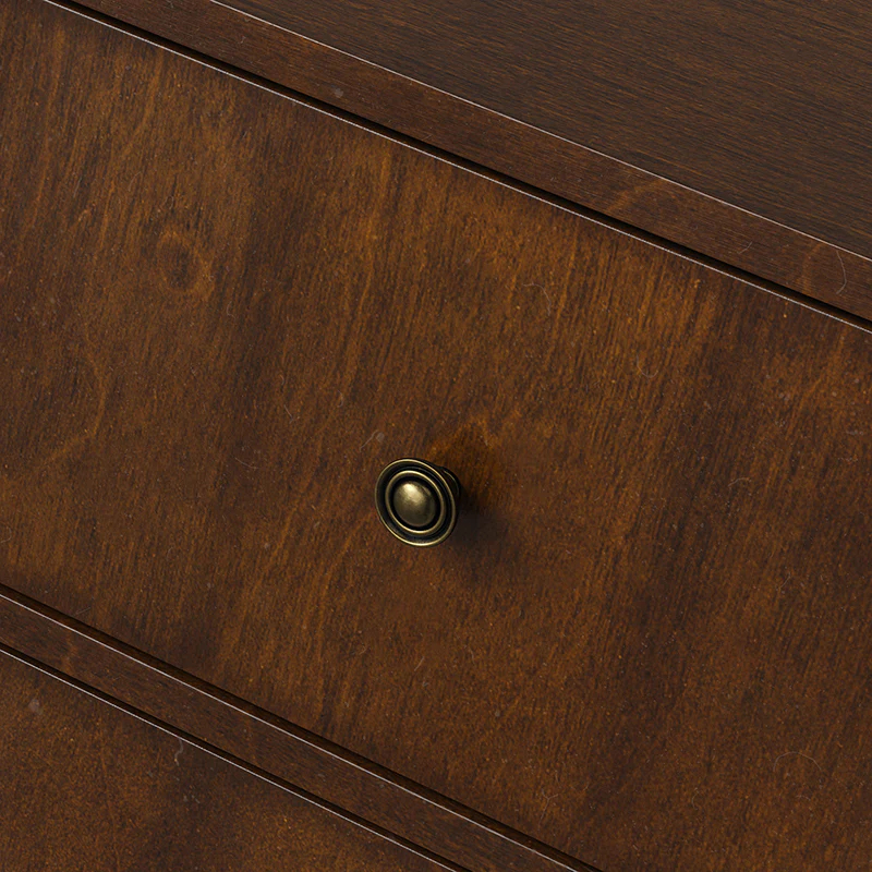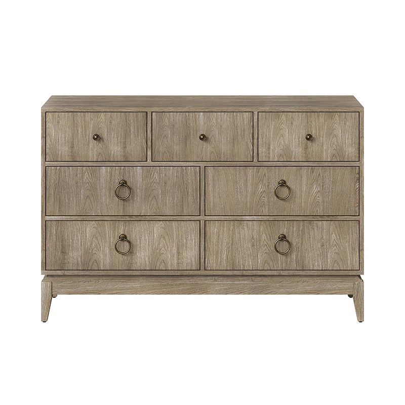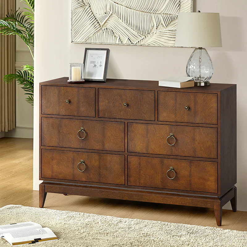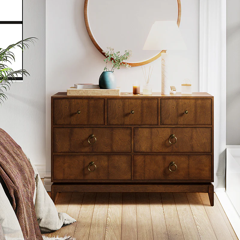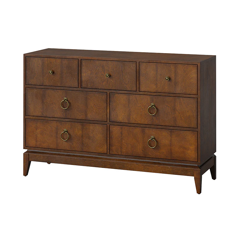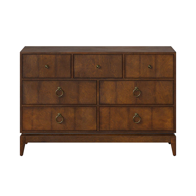 Elegant pieces don't have to be flamboyant or over the top. This contemporary dresser proves that even the simplest designs can be sophisticated and charming. It's right for almost any occasion and makes any space look amazing, especially the bedroom. This is a wood 7-drawer dresser with storage for clothing, bedding, accessories, and more. Large ring decorative hardware pulls on the four standard drawers and small knobs for the three center drawers all in a champagne brass finish. The sleek dark walnut finish accentuates the wood craftsmanship and ensures long-lasting use for this darling piece. Its tapered legs with an acacia solid wood base are very sturdy and can be used for a long time. This 7-drawer dresser designs detail and contemporary styling would be an essential piece in that ultimate classic bedroom.