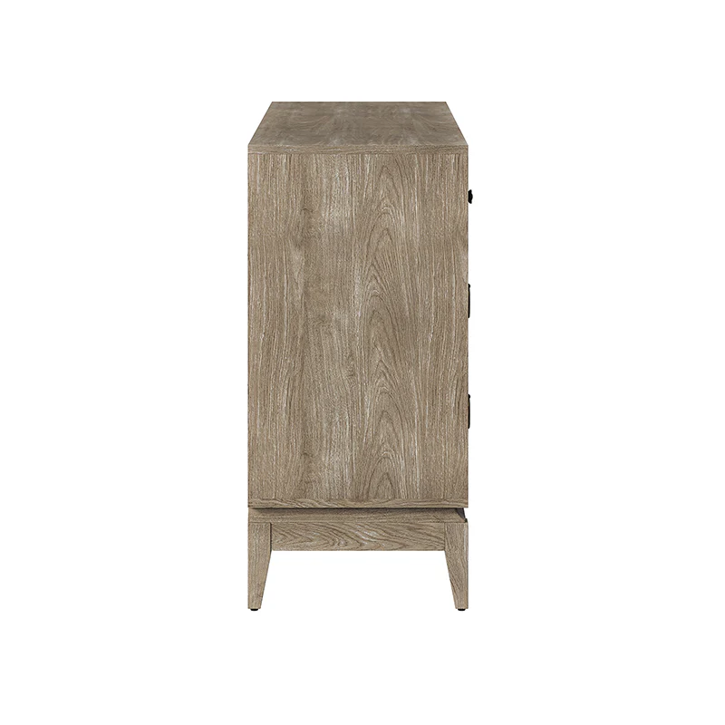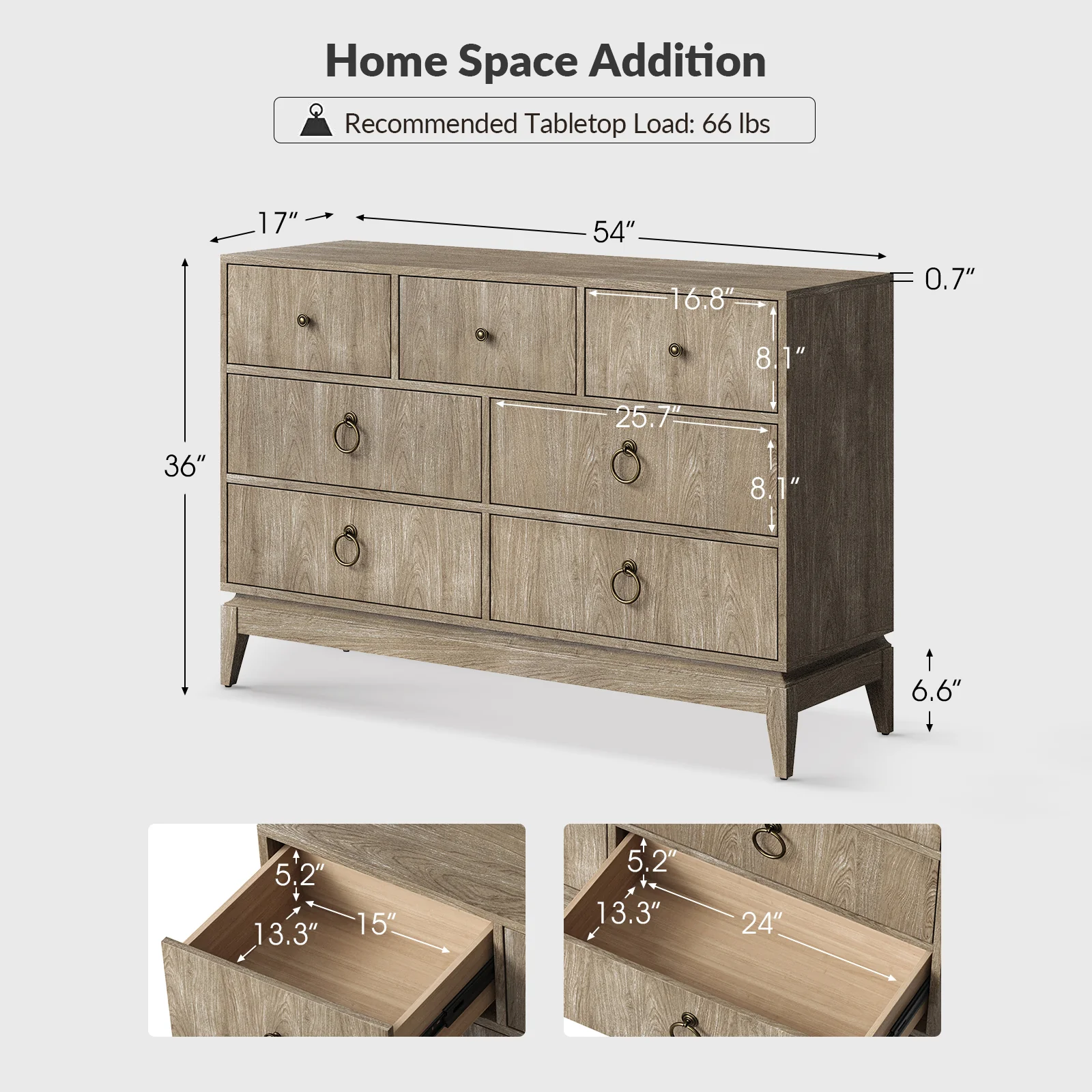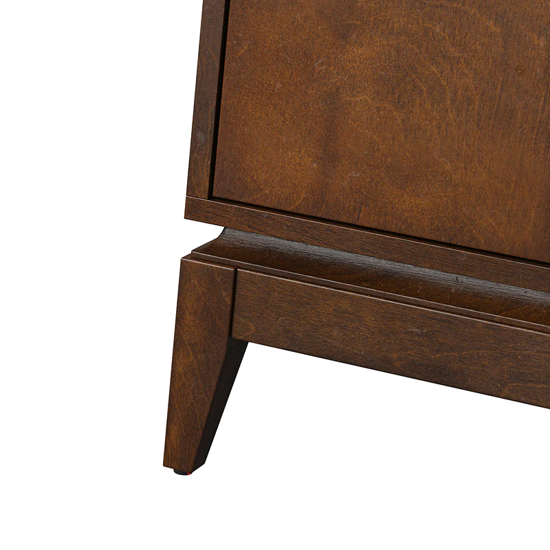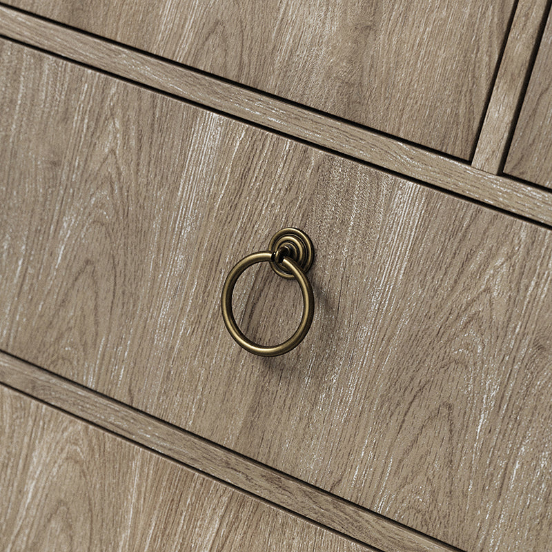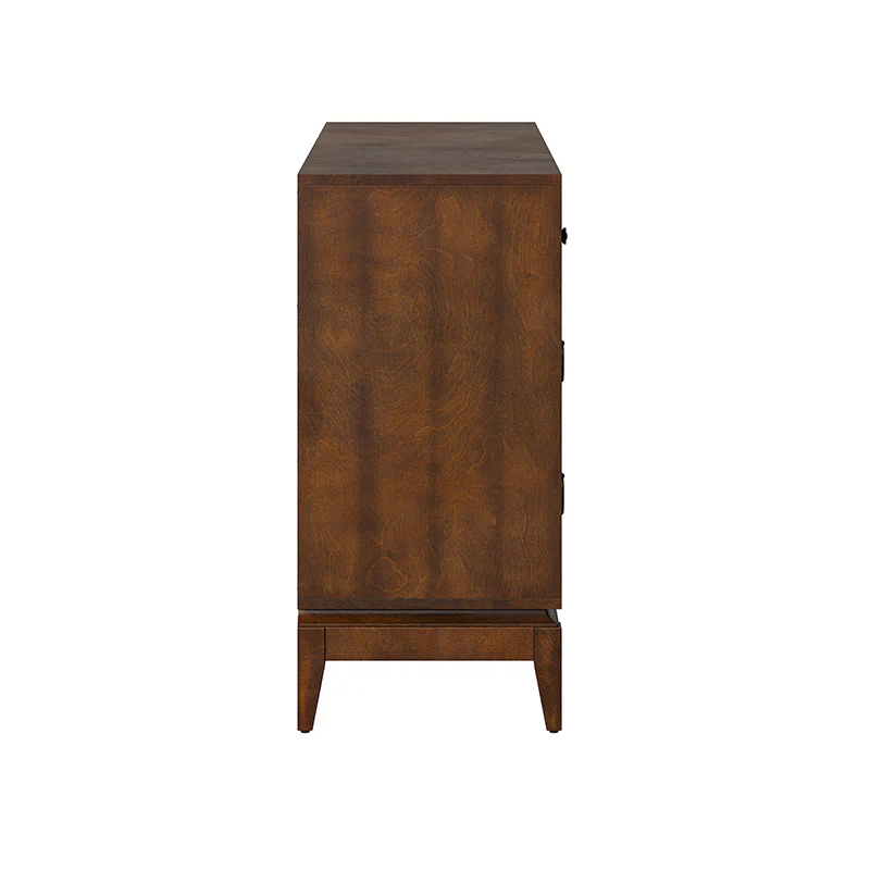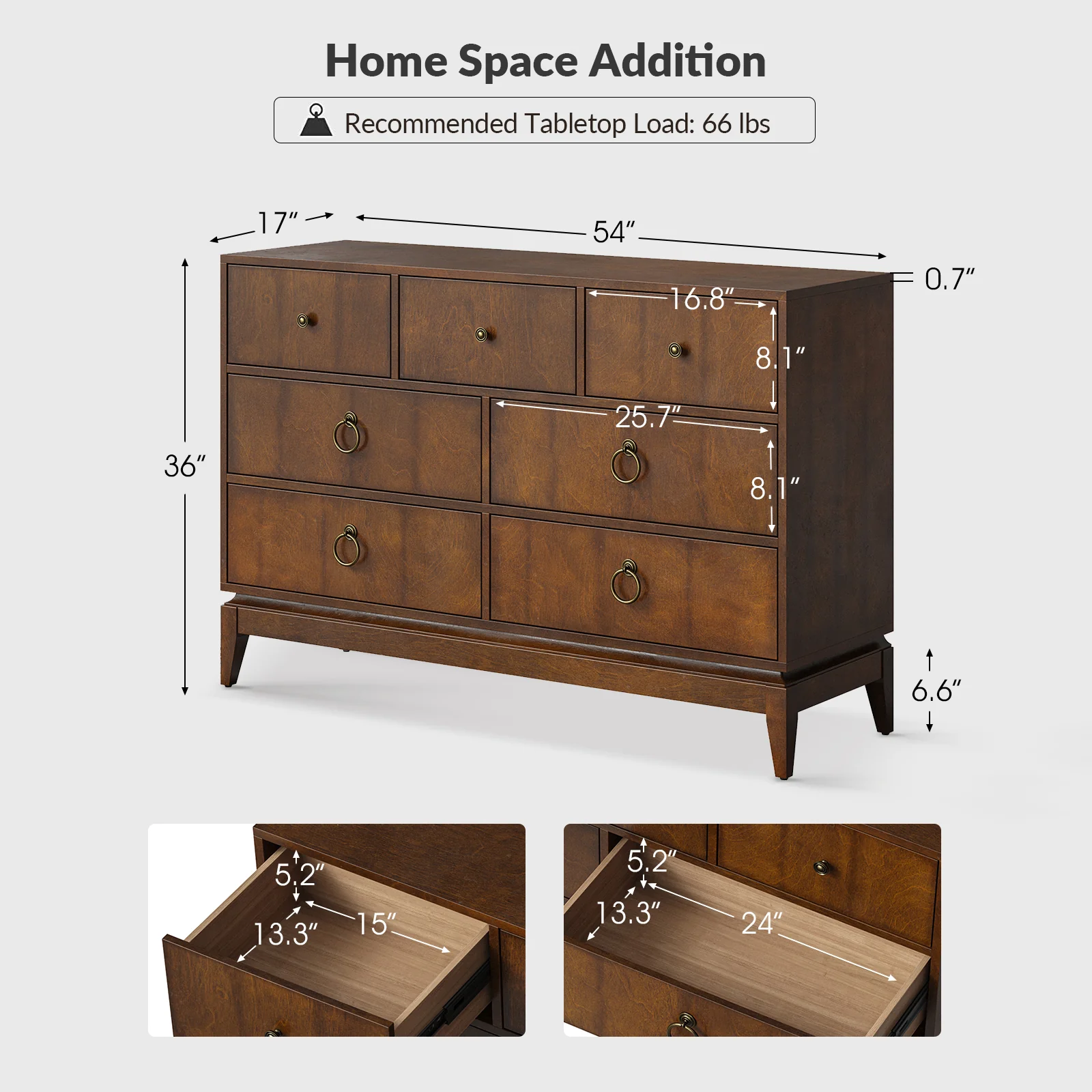 Elegant pieces don't have to be flamboyant or over the top. This contemporary dresser proves that even the simplest designs can be sophisticated and charming. It's right for almost any occasion and makes any space look amazing, especially the bedroom. This is a wood 7-drawer dresser with storage for clothing, bedding, accessories, and more. Large ring decorative hardware pulls on the four standard drawers and small knobs for the three center drawers all in a champagne brass finish. The sleek dark walnut finish accentuates the wood craftsmanship and ensures long-lasting use for this darling piece. Its tapered legs with an acacia solid wood base are very sturdy and can be used for a long time. This 7-drawer dresser designs detail and contemporary styling would be an essential piece in that ultimate classic bedroom.