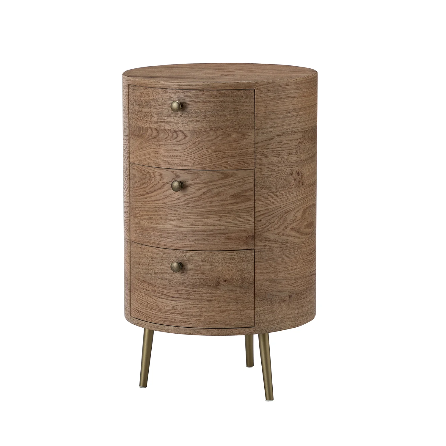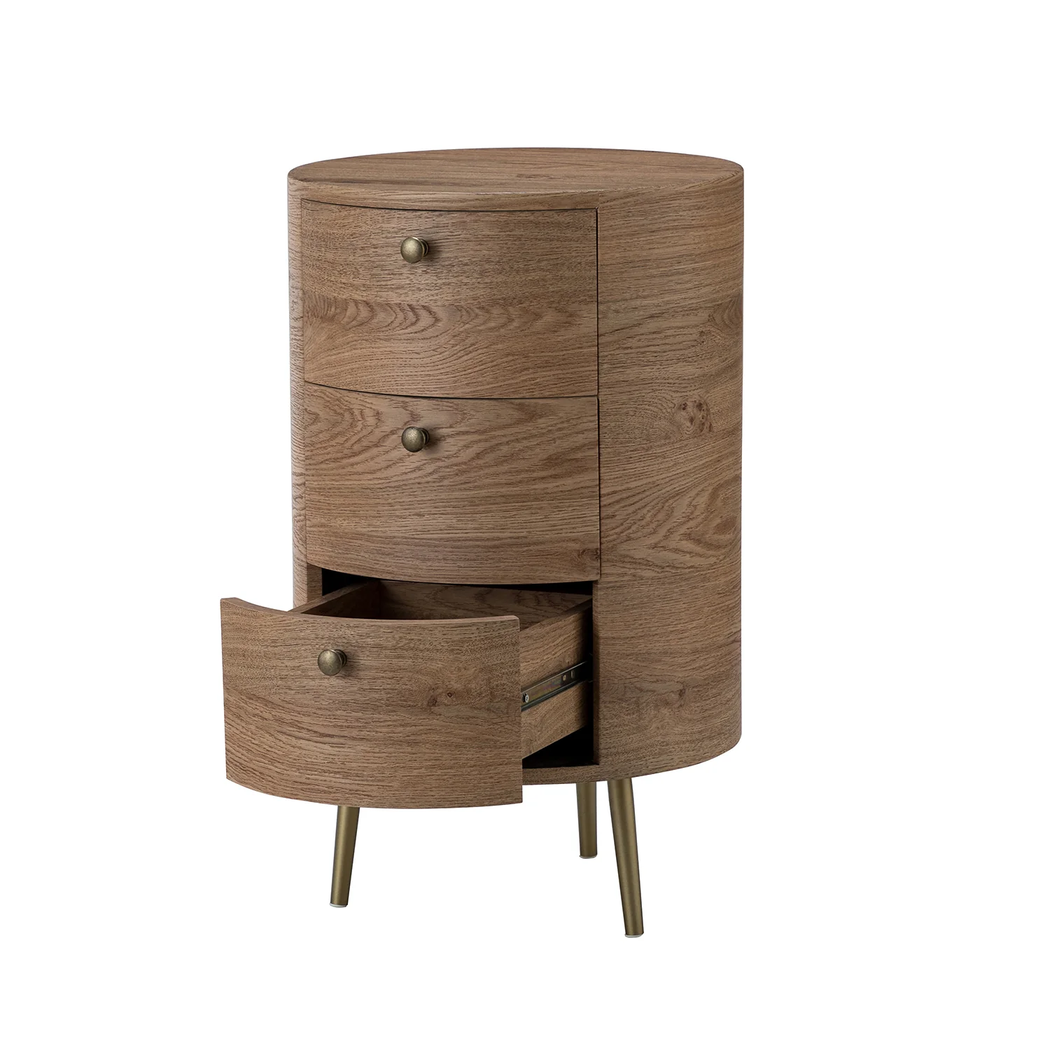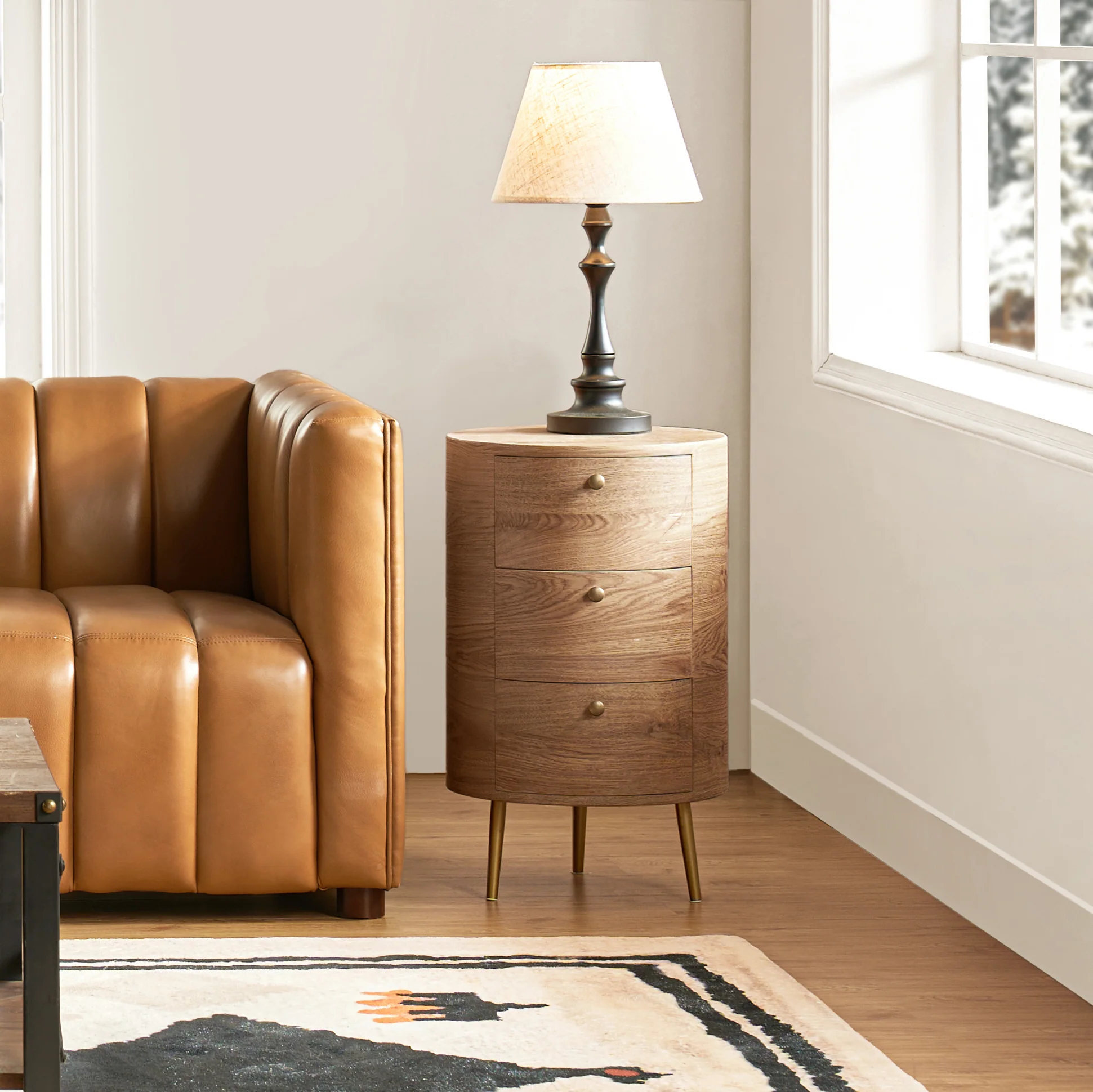 This end table shows off a distinctive cylindrical silhouette and has plenty of space for storage and display. Made from engineered wood, it comes in a melamine finish that works well with a variety of styles and aesthetics. Three drawers provide a few spots to tuck away living room essentials or random odds and ends. Plus, a trio of gold-finished tapered dowel legs mixes glam with mid-century modern to create a striking accent for any room. Full assembly is required, and all tools are included.