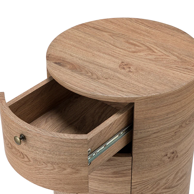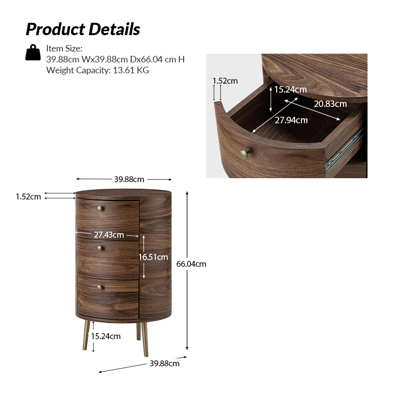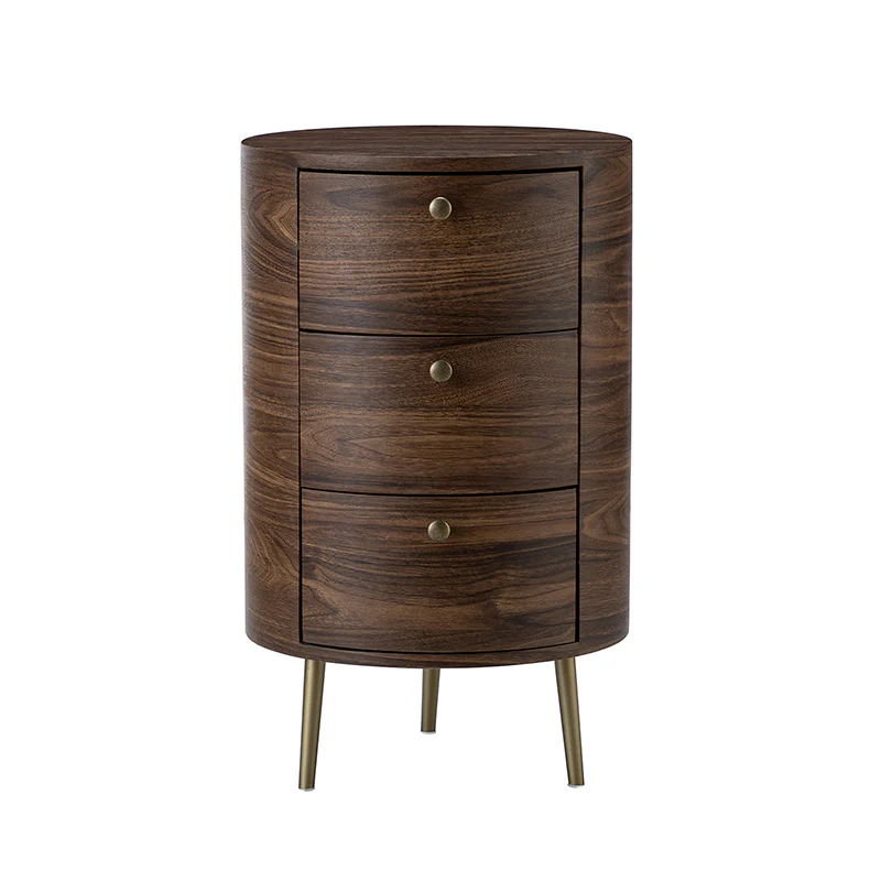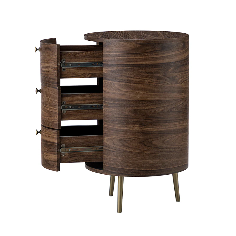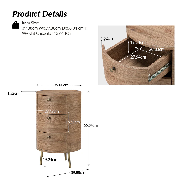 This end table shows off a distinctive cylindrical silhouette and has plenty of space for storage and display. Made from engineered wood, it comes in a melamine finish that works well with a variety of styles and aesthetics. Three drawers provide a few spots to tuck away living room essentials or random odds and ends. Plus, a trio of gold-finished tapered dowel legs mixes glam with mid-century modern to create a striking accent for any room. Full assembly is required, and all tools are included.