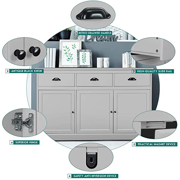Color:White DescriptionDo you want to add extra storage space to your kitchen? Do you like to add a unique charm to your living room? Want to add a practical and elegant shoe cabinet to hallway? Well, it's right to opt for this chic, versatile cabinet. Buffet cabinet using thick MDF and particleboard, the overall structure is firm and not easy to shake. In addition, use of P2 grade plate, environmentally friendly and harmless. The unique buffet has three spacious drawers to facilitate your items, such as napkins, keys and other small items. Two cabinets with adjustable shelves are perfect for storing items of different heights. The simple and elegant style adorns the house while providing ample storage space. This beckoning storage cabinet is never let you down!Features:Sideboard with drawers and cabinets which made of solid MDF and particleboard with high-quality paintThis buffet combines aesthetics and practicality, ample storage space while add charm to your roomClassic white finish adds to the elegant flavor of the product, adding a unique charm to the homeSpacious sideboard top great for home items storage and display.With adjustable shelves to meet your needsThe exquisite drawer handles is easy to useHigh-quality hinge do not rustSolid construction plus thick and eco-friendly P2 grade board, featuring high capacityIdeal for kitchen, dining room, living room and hallwaySimple installation and easy maintenanceSpecification:Color: WhiteMaterial: MDF &Particle BoardDimension: W53.5"xD17"xH34"Drawer dimension: W14.5"xD13.5"xH4.5"Shelf adjustable height:1.5"Item weight:50.5lbsBoard capacity:22lbsDrawer capacity:7lbsPackage Include:1x Sideboard1x ManualNote: This cabinet you received is in two boxes.