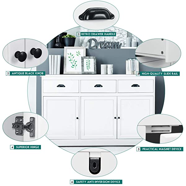 〖Easy to Keep Clean and Assemble〗: The drawers and cabinets with handles are comfortable grip and easier pullout. Besides, this table need simple assembly and the instructed included. You can use it after simple installation. 〖Spacious Tabletop & Ample Stprage Space〗: This table desktop is made of MDF with melamine cover , large and smooth top surface not only allows placing more items and perfect to touch but easy to clean and maintain . 〖Versatile Usage Meet Your Demands〗: Because it is stylish and practical, so it doesn't matter where you put it. This table can be put in the entryway to be used to shoe cabinet ,the drawers can storage the key and small items ,the chest can storage the shoes. Besides, it can be used as cupboard for storage kitchen accessories. Of course, it can also be used as a display table to place crafts and plants. 〖Long-Lasting Cabinet Frame〗: This console table is made of solid MDF material with melamine cover which is sturdy and durable. In addition, the design shape of the foot increases stability. 〖Modern Buffet Sideboard & Storage Cabinet〗: This sideboard table features 3 drawers and 3 doors with white finish create instant charm in your home. The lovely white finish and stylish design add a sense of elegance. And, it is perfectly decor your house.