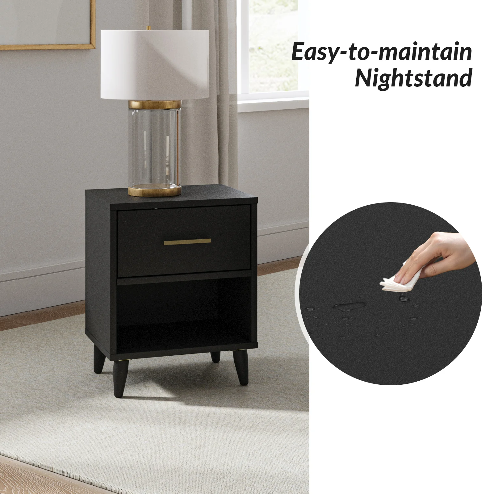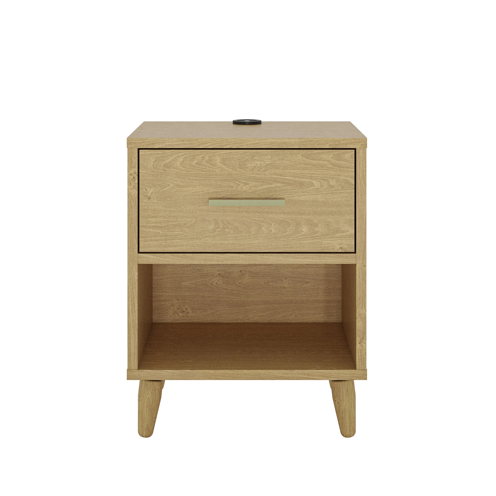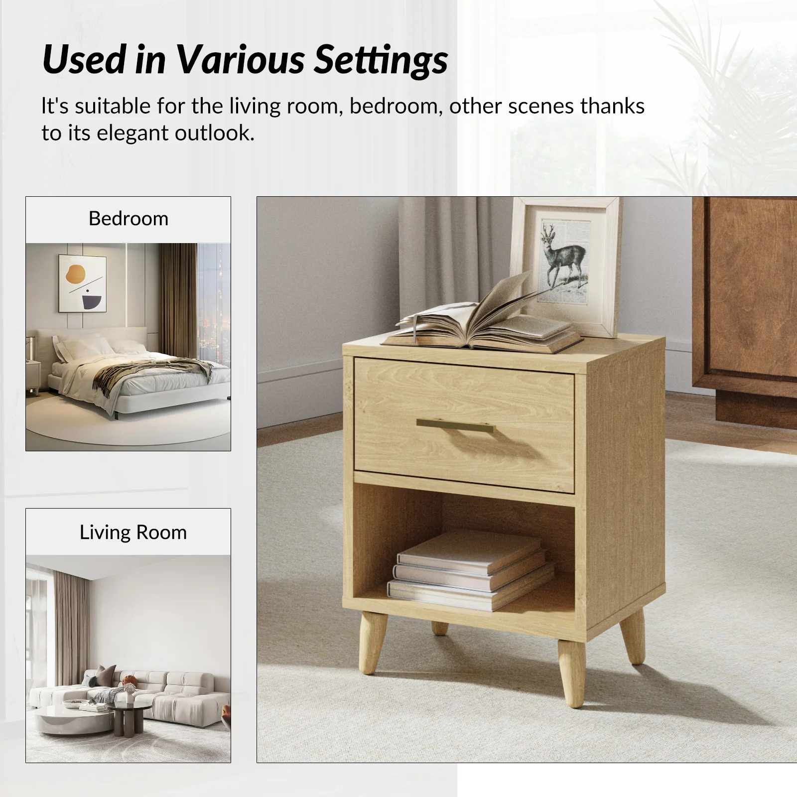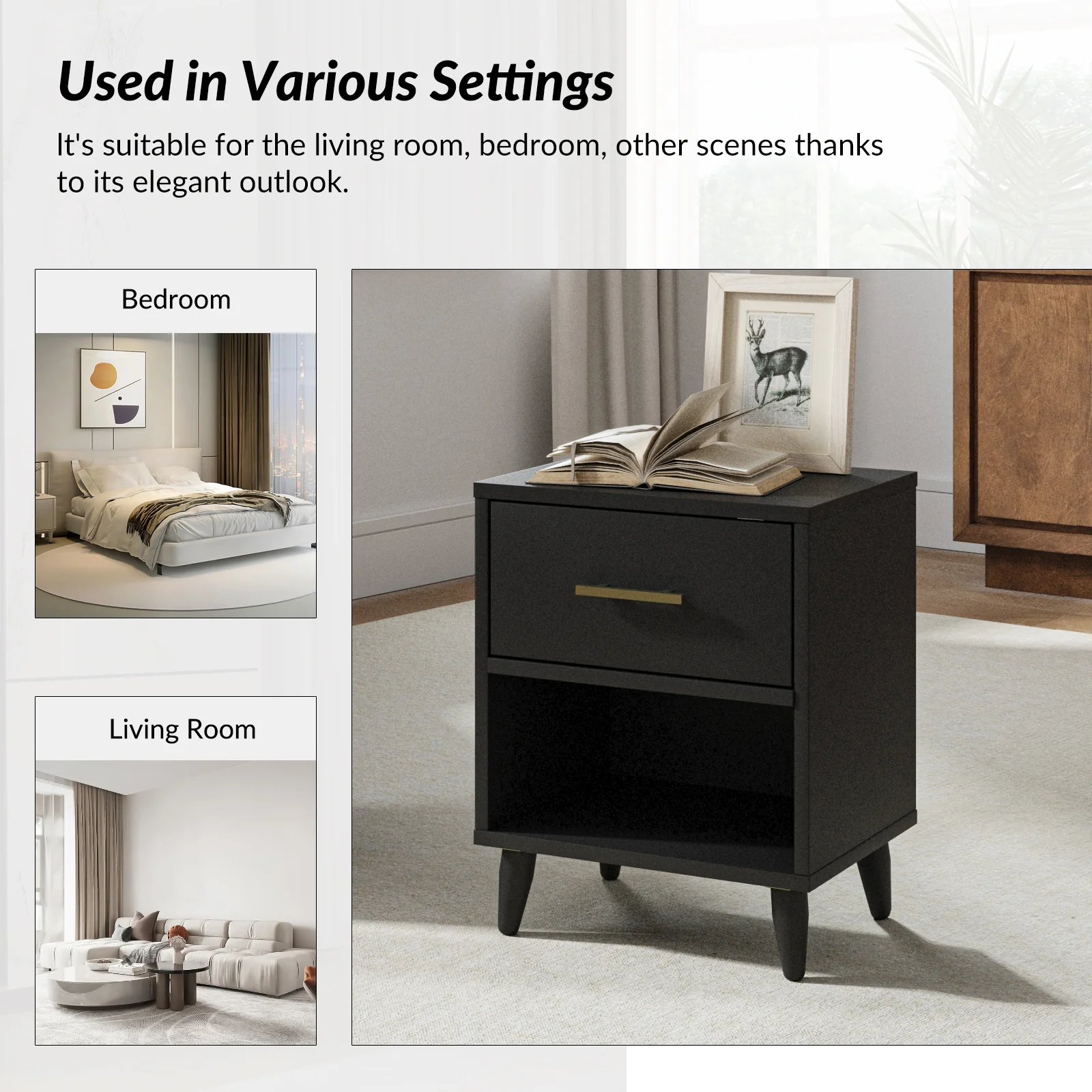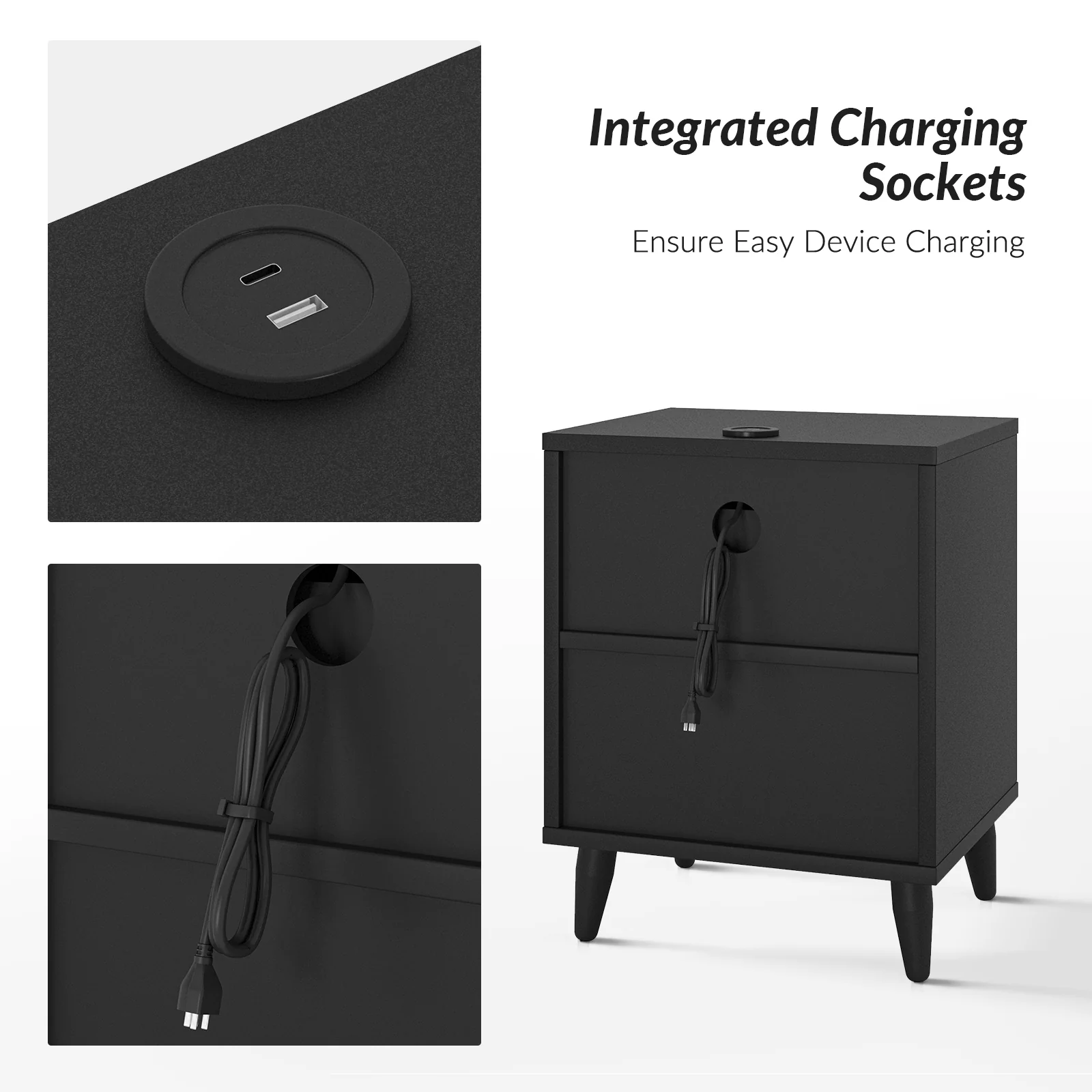 This contemporary nightstand set of 2 effortlessly combines style with practicality. Its complemented by a surface that's resistant to water, scratches, and stains, suitable for maintaining a sleek appearance over time with minimal effort. The drawer features a modern handle design for easy access and adds to the nightstands' overall aesthetic appeal. Equipped with an integrated charging socket, this nightstand set offers convenience for charging devices conveniently within arm's reach. The flared legs not only enhance its stability but also lend a chic, modern look to any bedroom decor. Whether used for storing bedside essentials or showcasing decorative items, this nightstand set is a versatile piece that enhances both functionality and style in your living space.