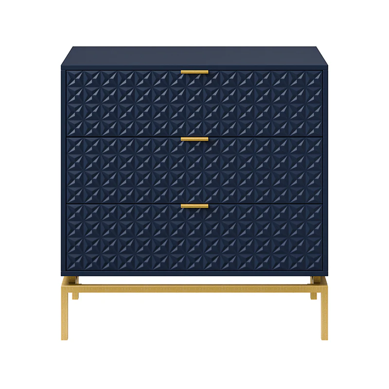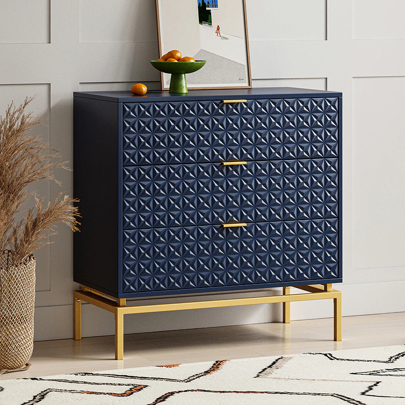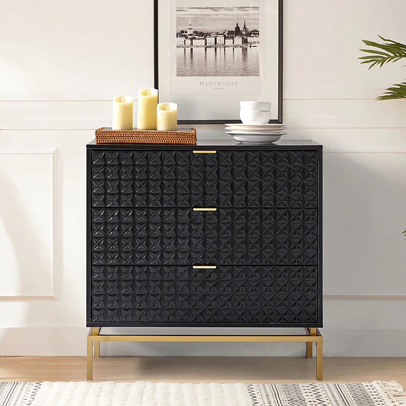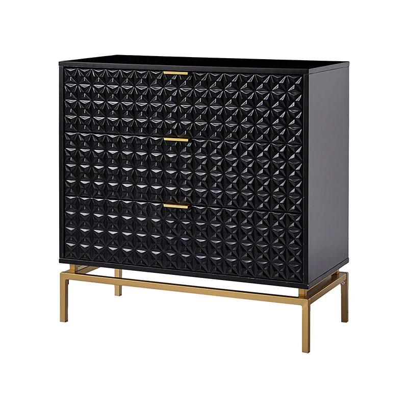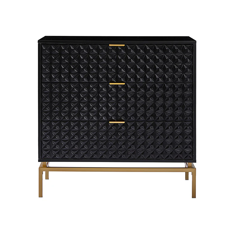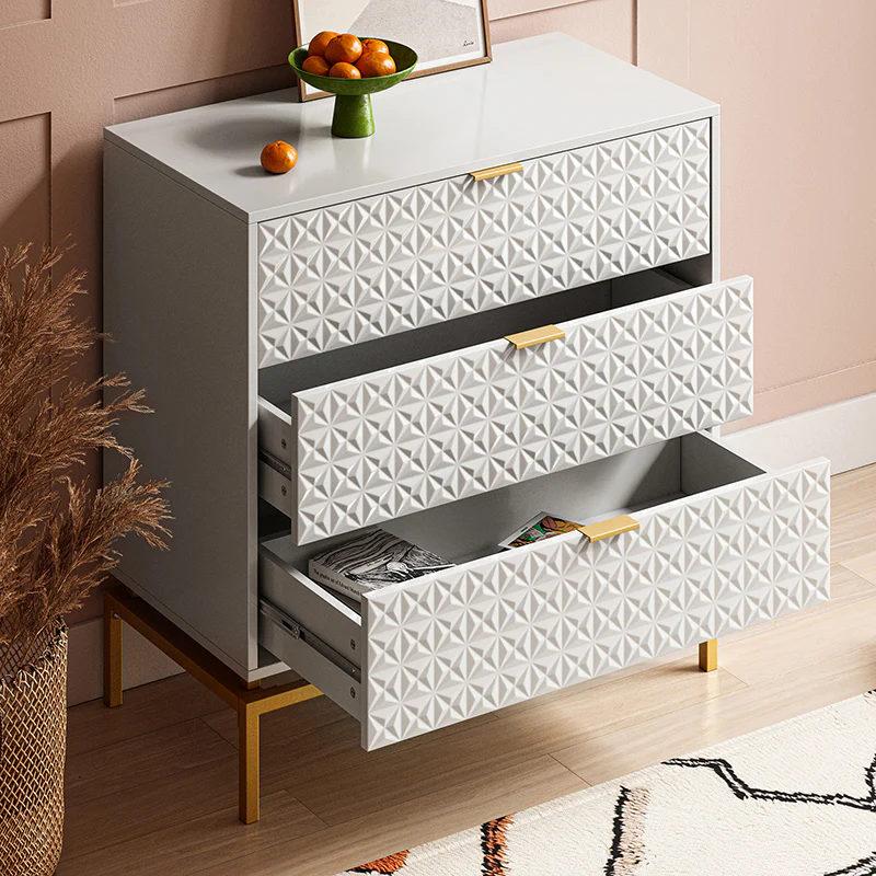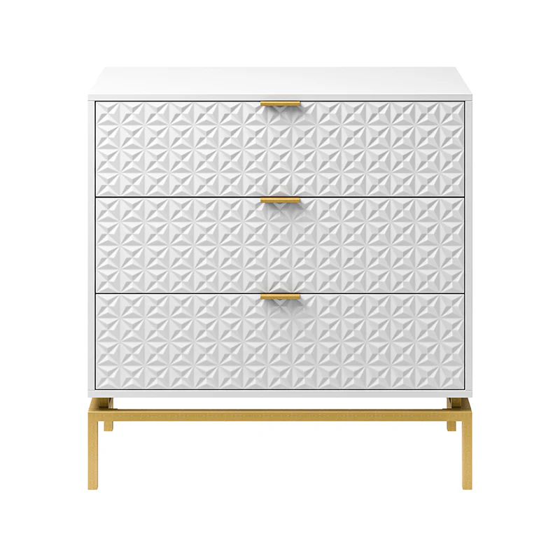 Helping you easily tuck away and organize bedside essentials, this mid-century storage cabinet is designed for the hallway, living room or storage space. Featuring attractive embossed patterns, 3 drawers equipped with ball-bearing slides and a safety stop mechanism that allows you to pull them out with ease. Supported by a metal base, the modern storage cabinet uses golden metal legs, which match the golden handles to create a charming appearance. Except for a clean-lined silhouette, it features 3 drawers to access your items with ease and works with other collection pieces to build out your dream home. Behind each drawer, you will discover ample space for bonus storage. Waterproof, scratch-resistant, and stain-repellent, this wood cabinet is inclined to recall the pared-down designs of the mid-century and is exquisitely designed for your living spaces.