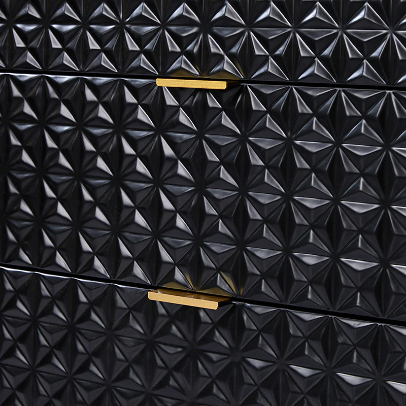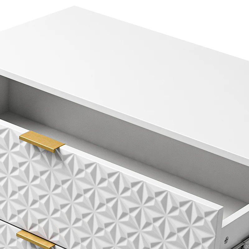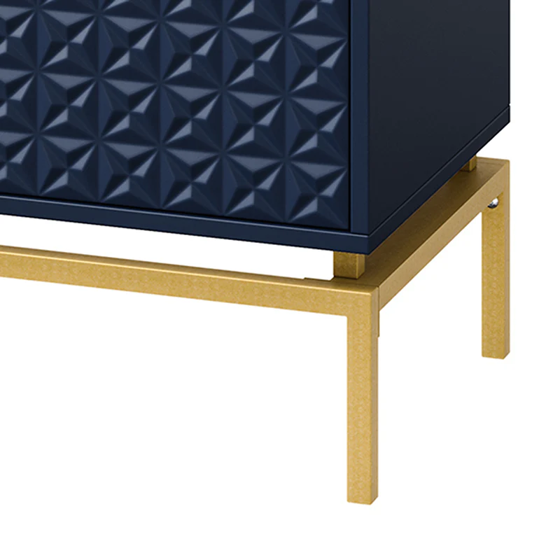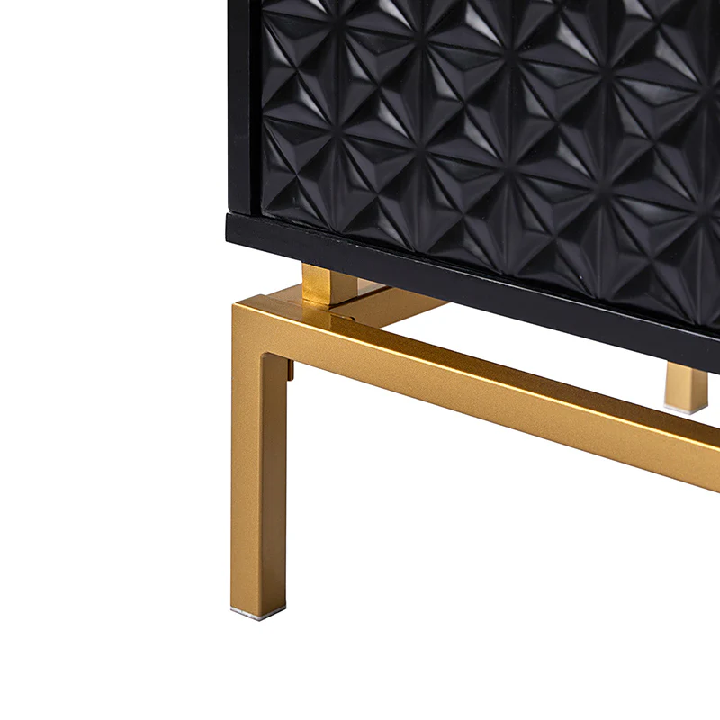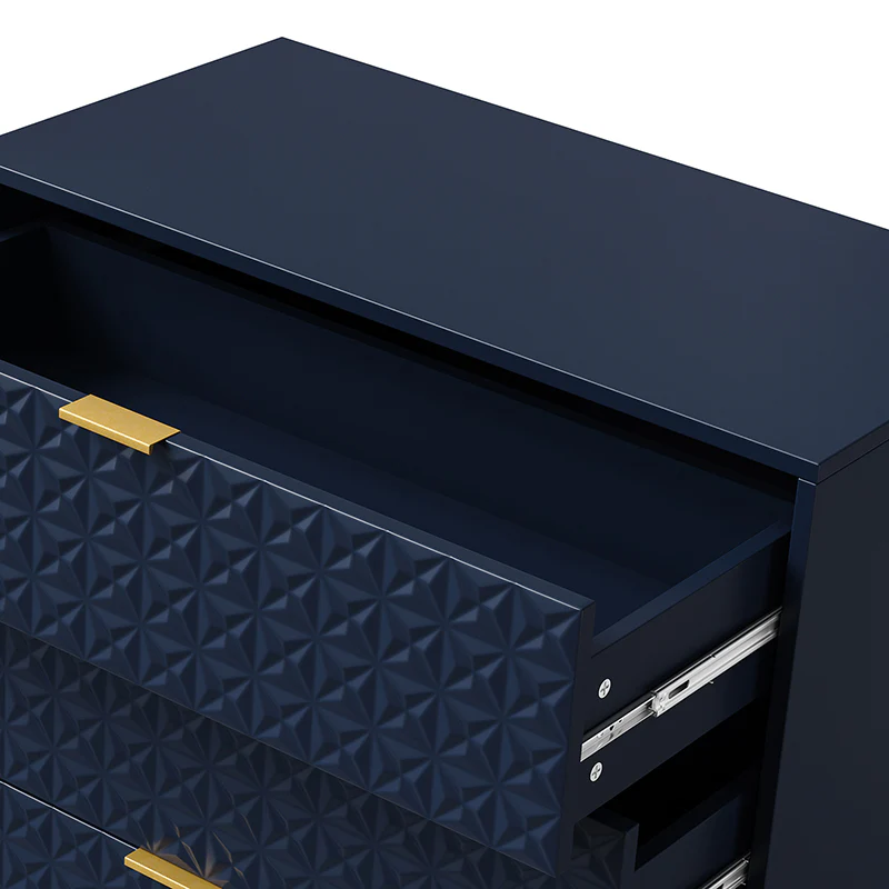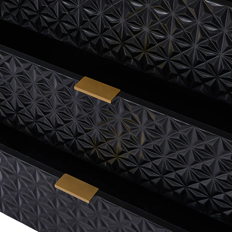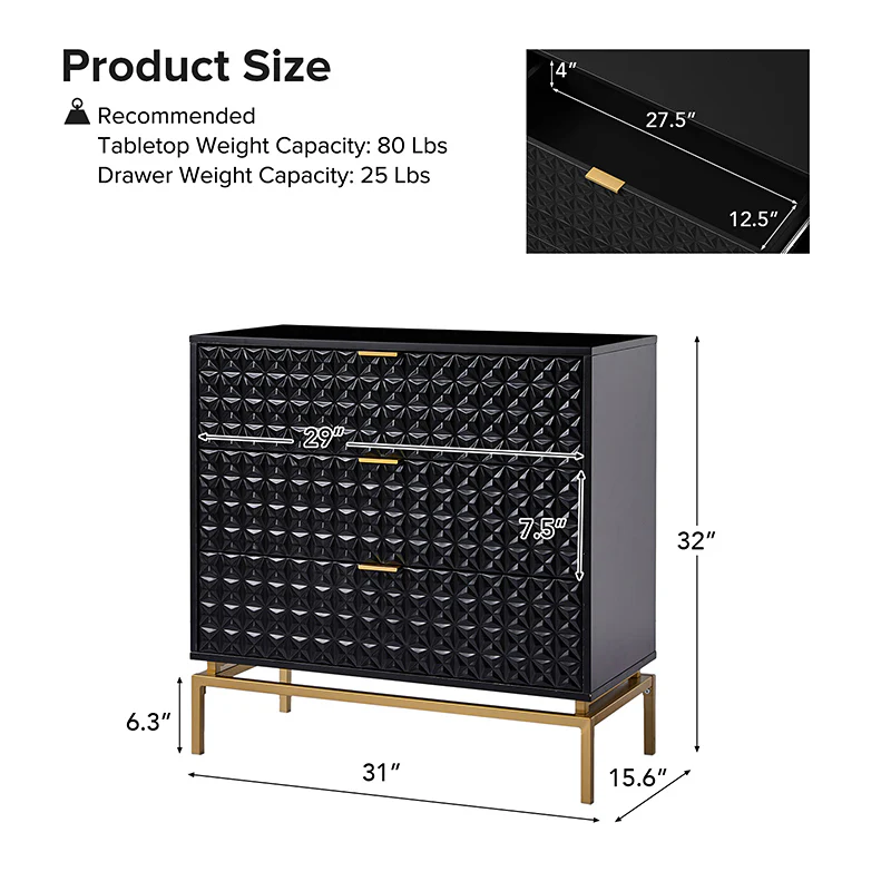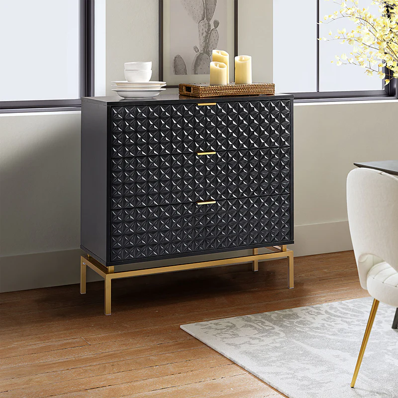 Helping you easily tuck away and organize bedside essentials, this mid-century storage cabinet is designed for the hallway, living room or storage space. Featuring attractive embossed patterns, 3 drawers equipped with ball-bearing slides and a safety stop mechanism that allows you to pull them out with ease. Supported by a metal base, the modern storage cabinet uses golden metal legs, which match the golden handles to create a charming appearance. Except for a clean-lined silhouette, it features 3 drawers to access your items with ease and works with other collection pieces to build out your dream home. Behind each drawer, you will discover ample space for bonus storage. Waterproof, scratch-resistant, and stain-repellent, this wood cabinet is inclined to recall the pared-down designs of the mid-century and is exquisitely designed for your living spaces.