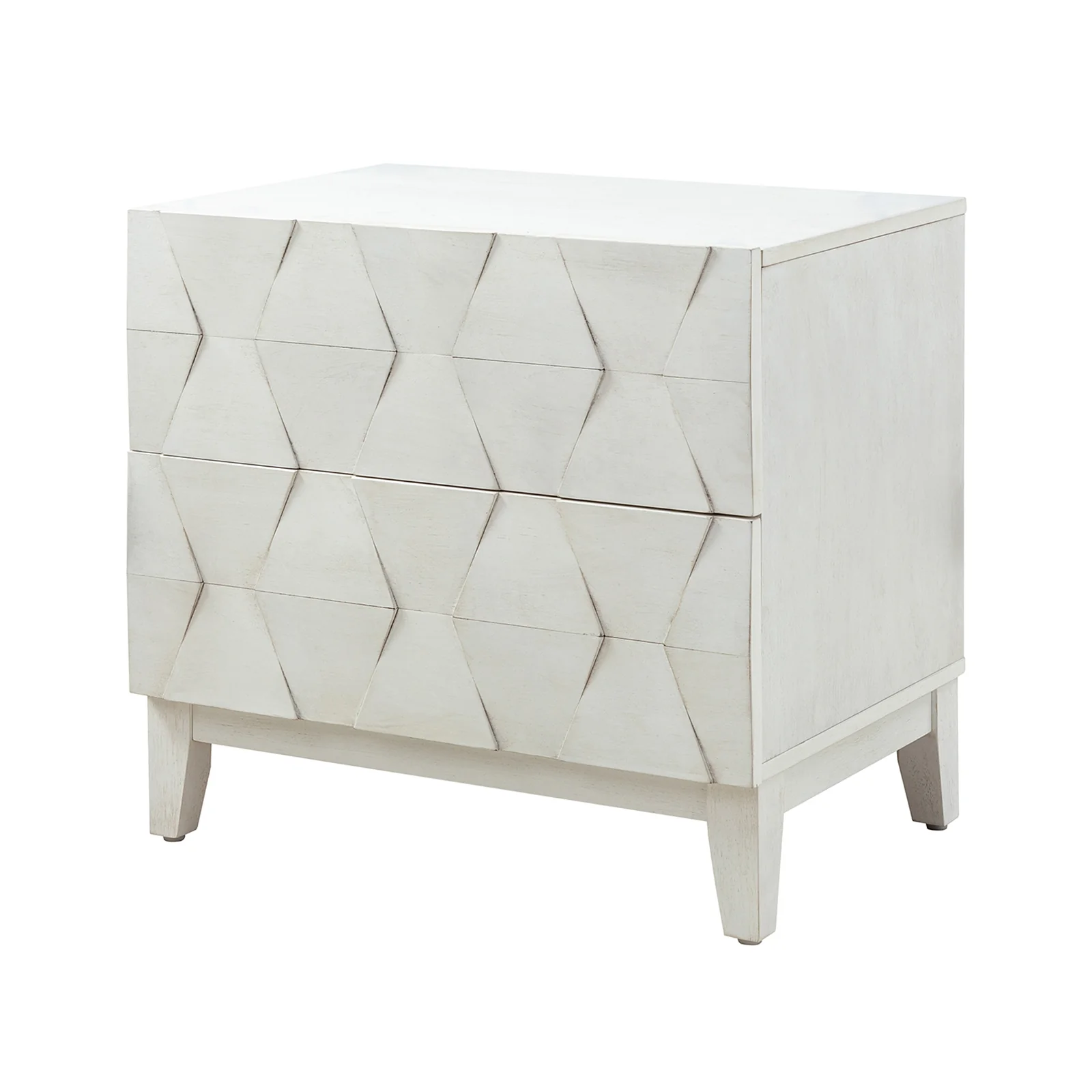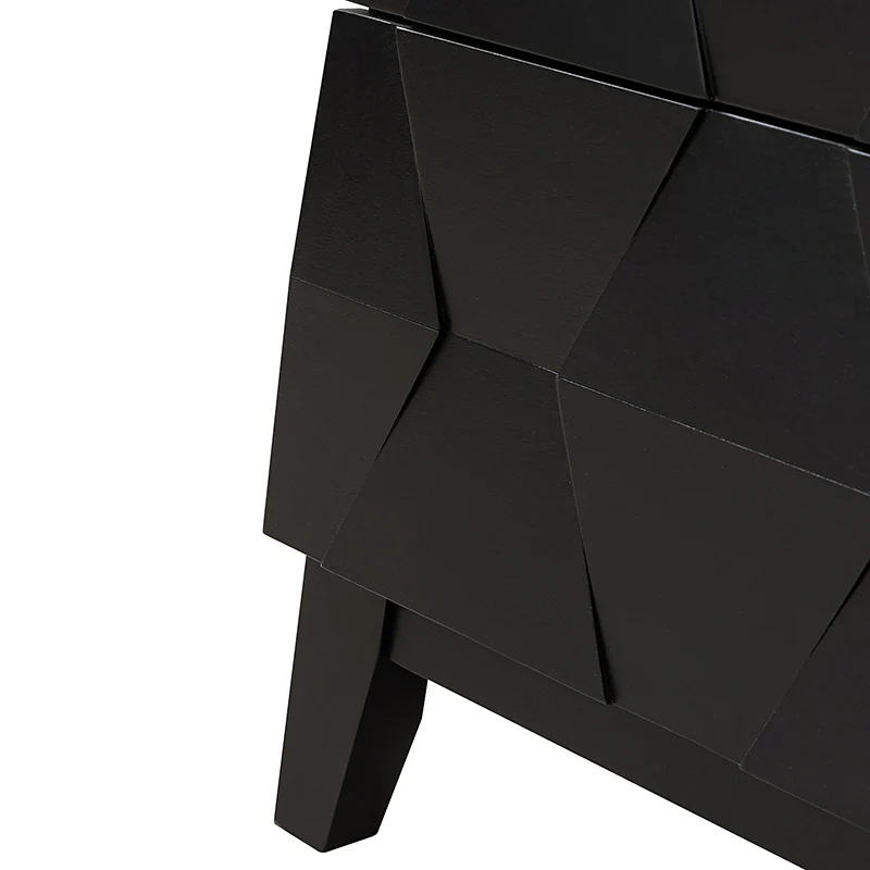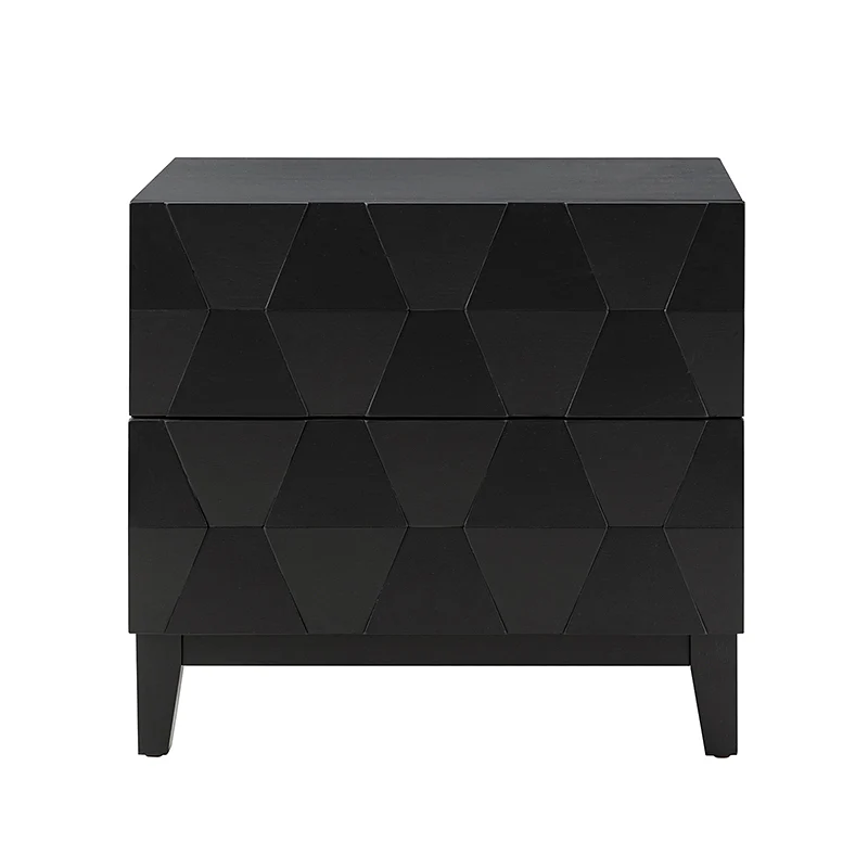 Introducing the sleek and highly functional contemporary nightstand with a built-in charging station. Crafted from solid and engineered wood, this exquisite piece stands gracefully on tapered legs. Its door fronts feature captivating hexagonal embellishments, adding a subtle visual texture and dimension to its design. Furthermore, the nightstand boasts a thoughtfully designed back panel equipped with an outlet and discreet wire hiding space, enabling effortless connectivity to power for charging your smartphones, tablets, or smartwatches as you rest. This mid-century modern and modern nightstand effortlessly integrates into your bedroom, living room, study, or even office, seamlessly harmonizing with your interior style for a truly refined aesthetic.