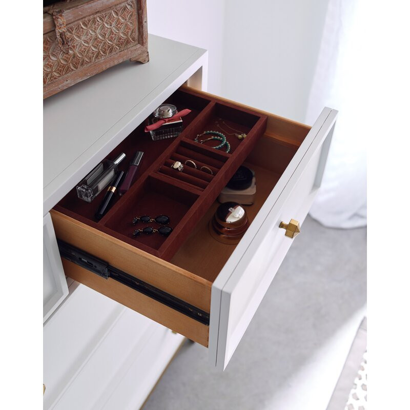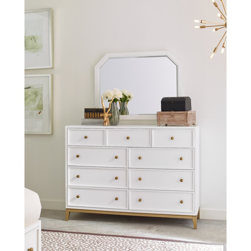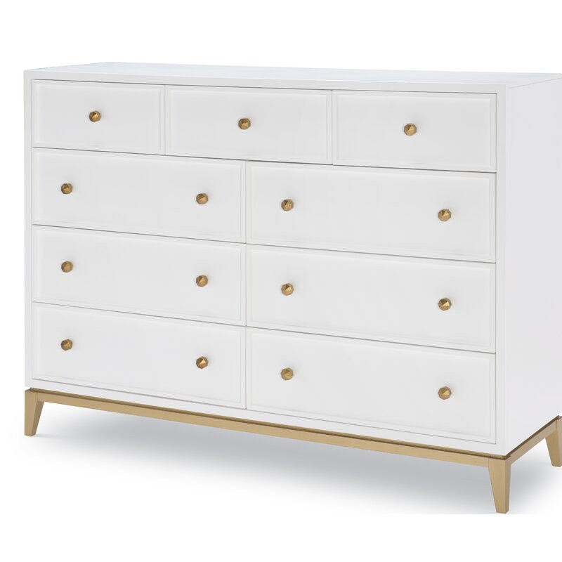 This 9-drawer double dresser features flared gold legs and clean lines for a chic look in your bedroom. The frame is made from solid and engineered wood with a crisp white finish. All 9 soft-closing dovetailed drawers roll out on metal ball-bearing glides, giving you plenty of space for storing away your wardrobe and linens. Plus, some of the drawers are felt-lined, so they're ideal for protecting delicates. Best of all, this piece arrives fully assembled, so all you have to do is put that laundry away. A wall anchor is included for added safety.