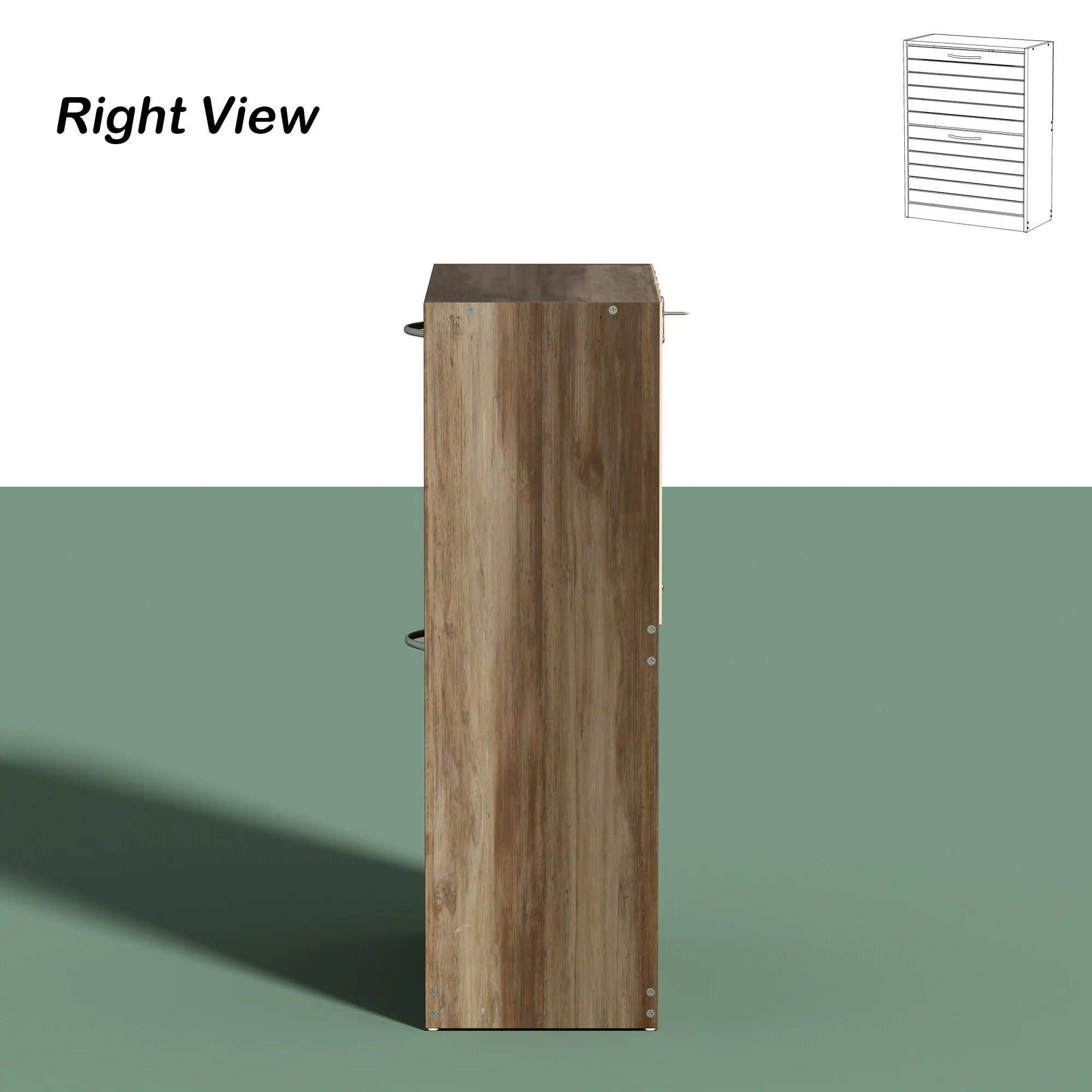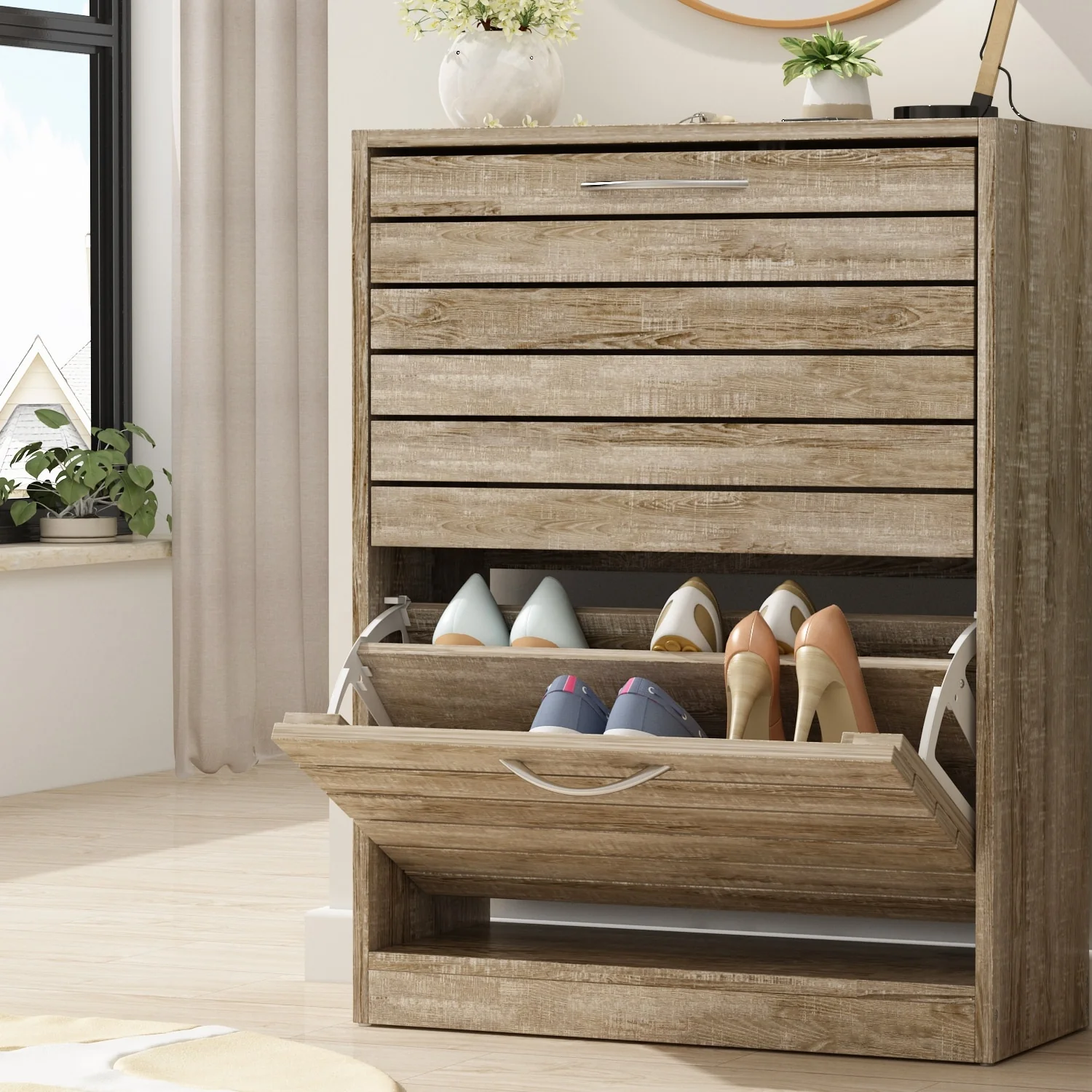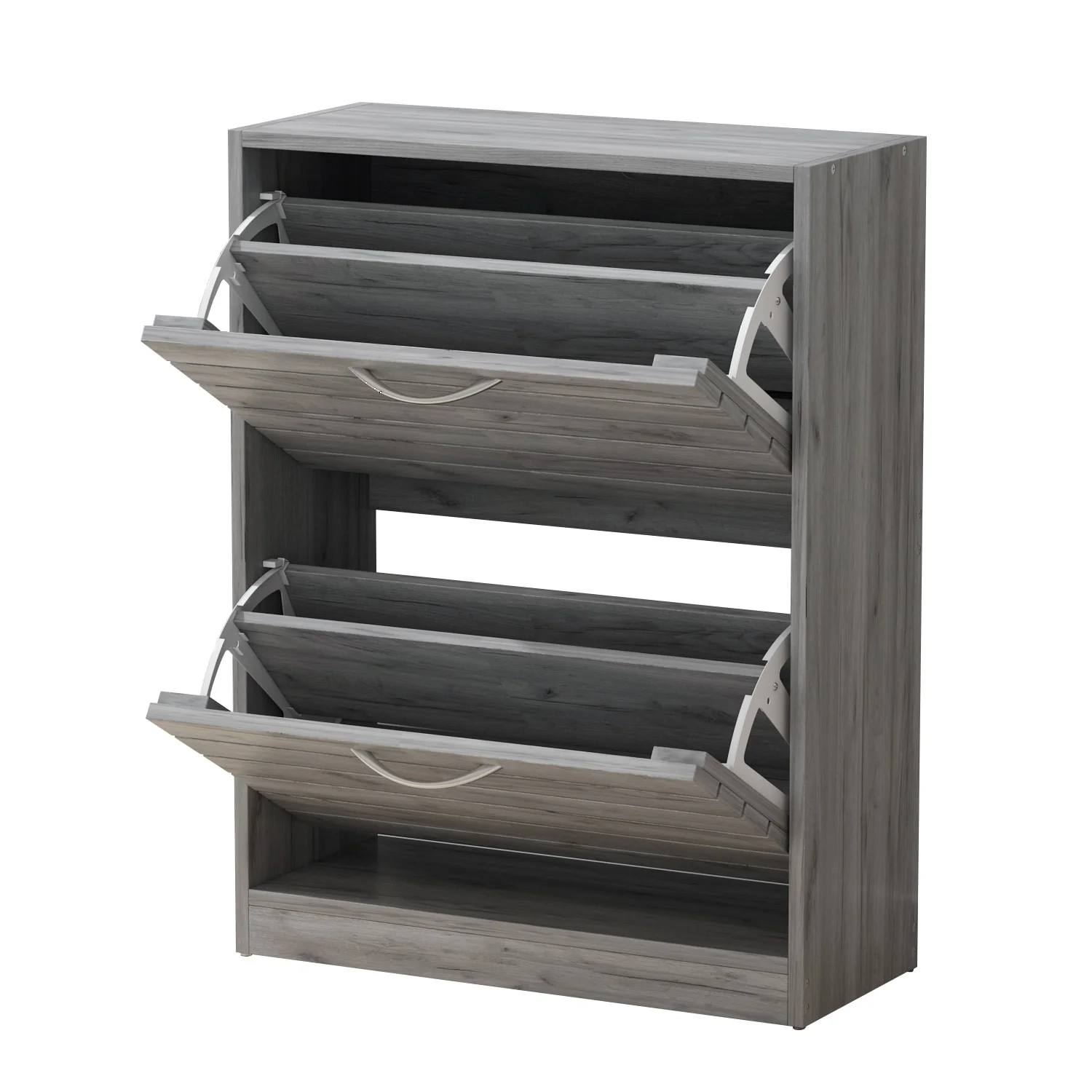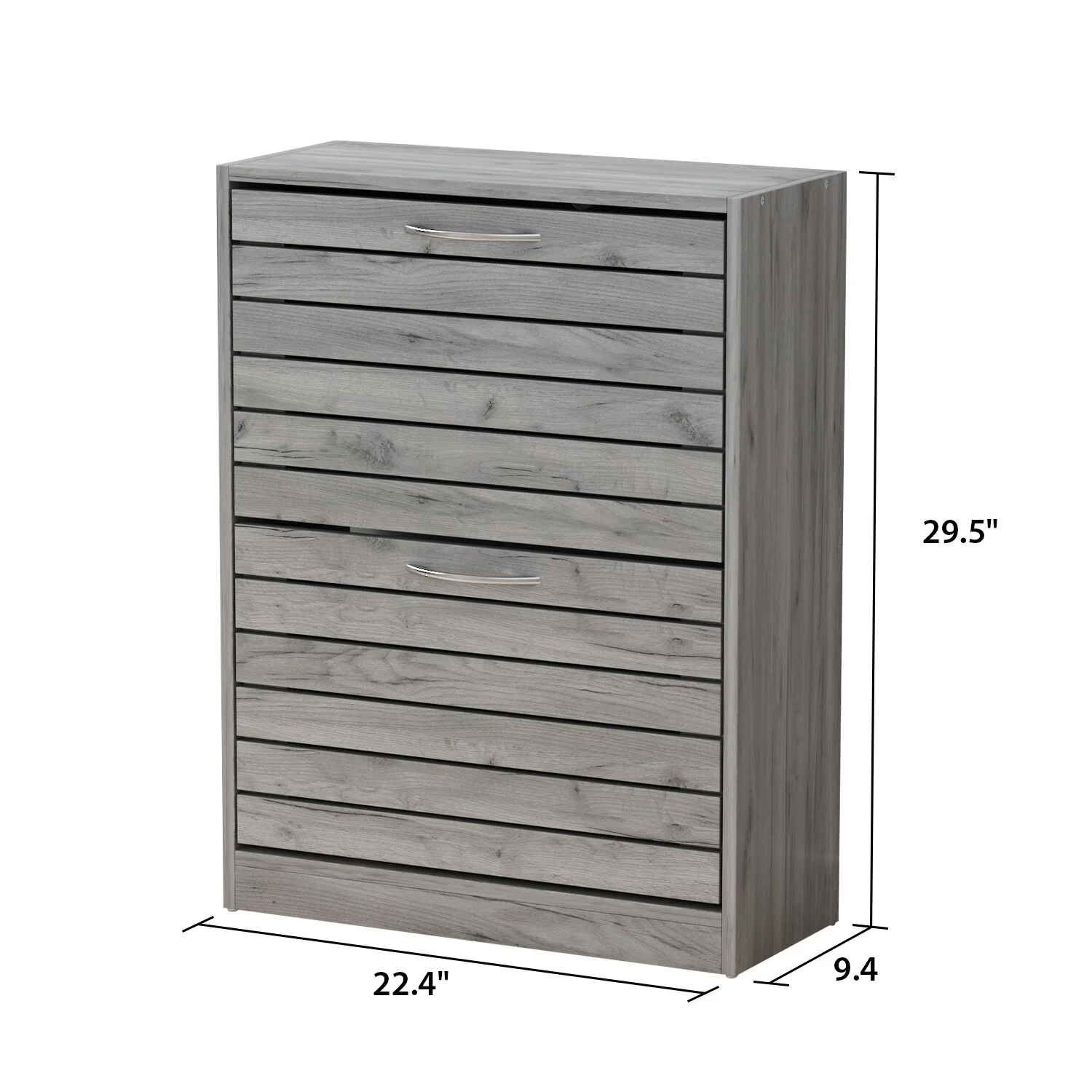 Keep your shoe collection organized and easily accessible with this modern shoe storage cabinet. Its tipping bucket design provides ample storage space with two drawers, each containing two shelves for hiding away your shoes. The metal handles are durable and easy to use, while the medium-density fiberboard construction ensures longevity. This shoe cabinet is perfect for narrow spaces in the bedroom, hallway, or corridor and can even be used to store small objects on its spacious platform.