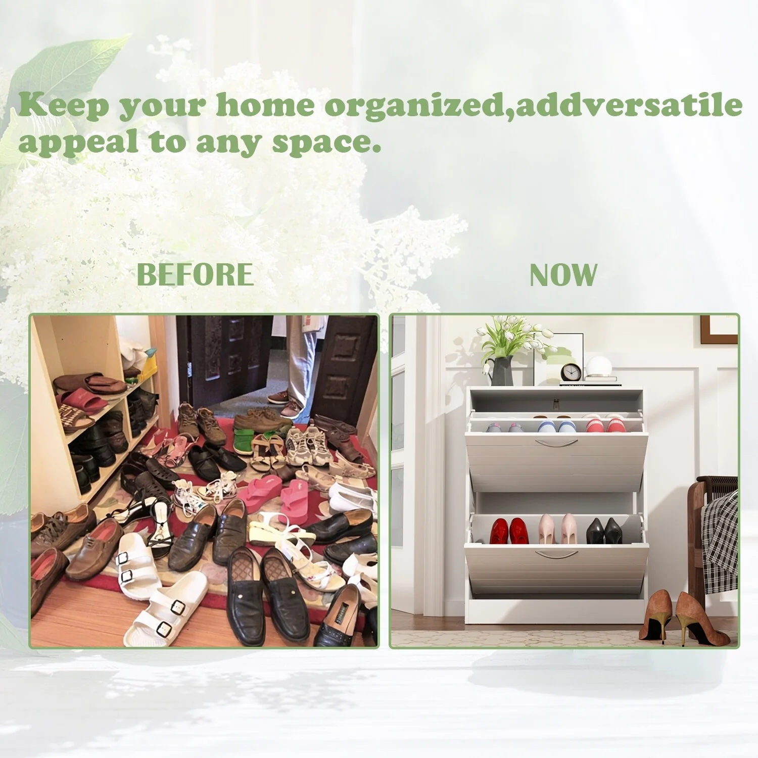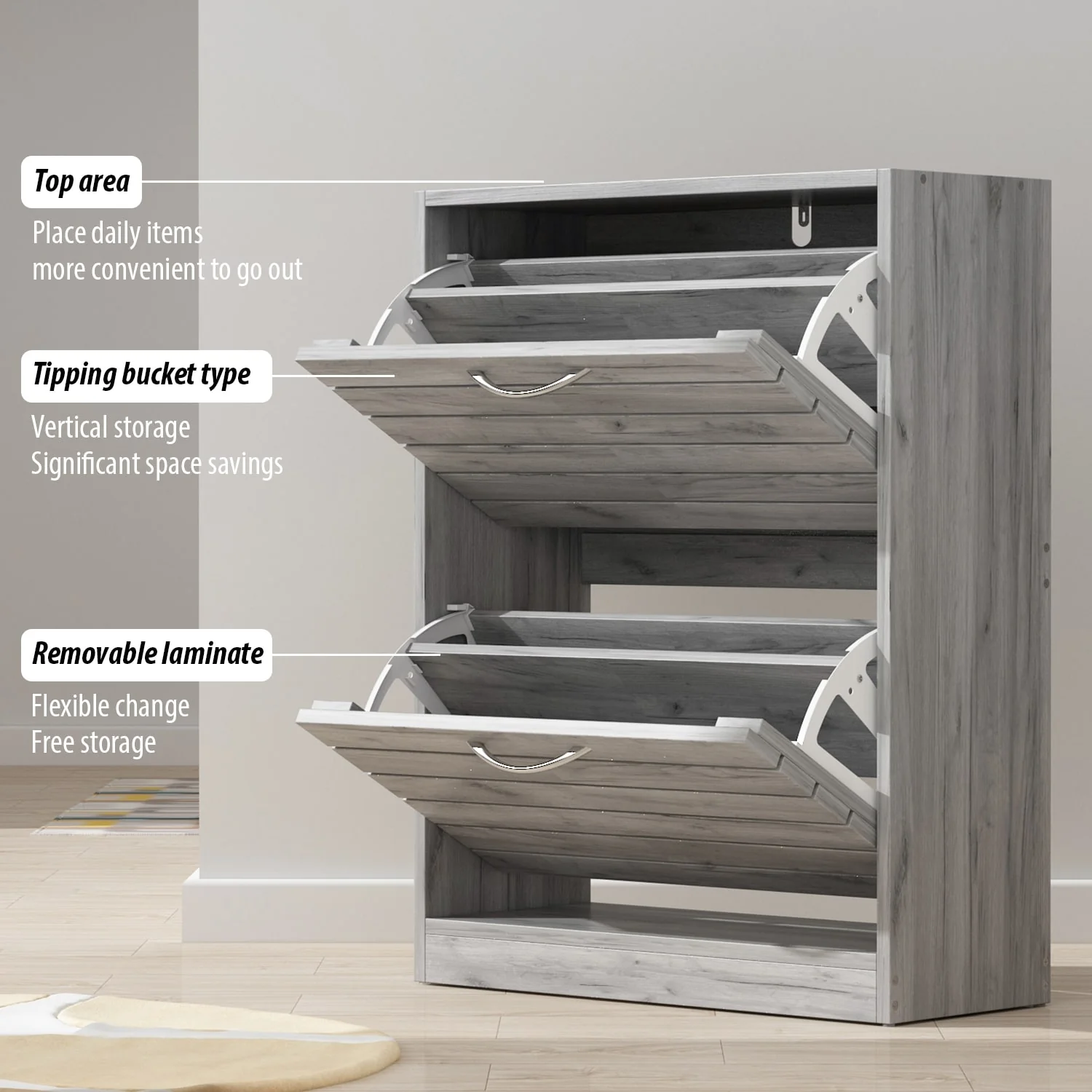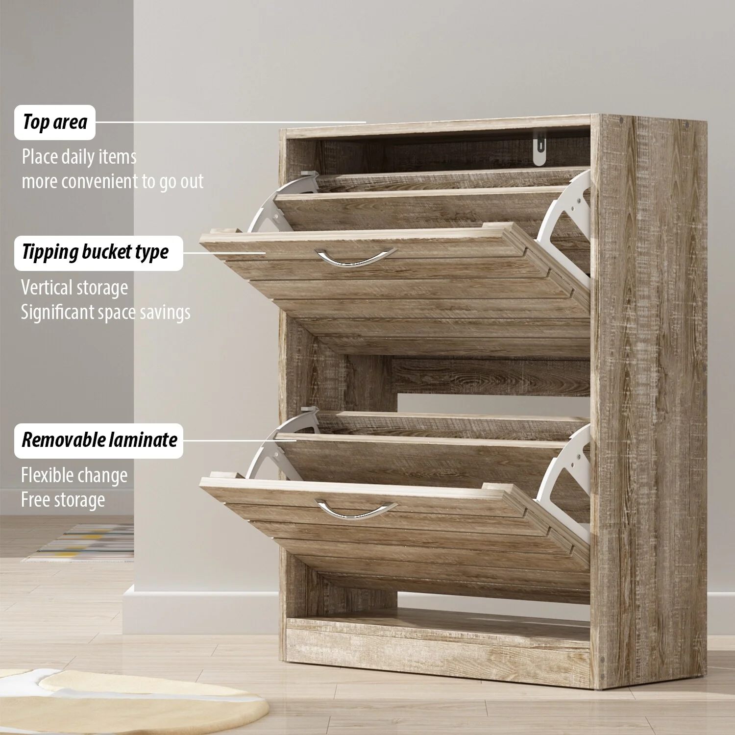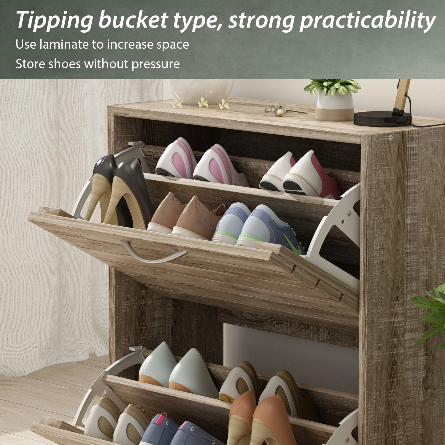 - Tipping bucket design with spacious storage compartment for multiple pairs of shoes