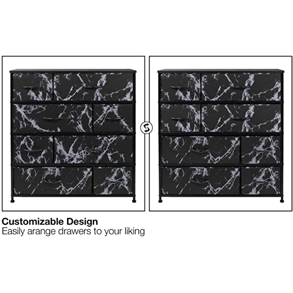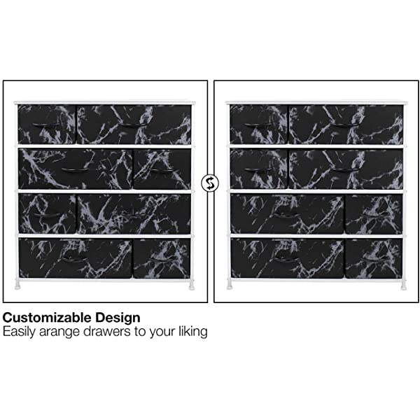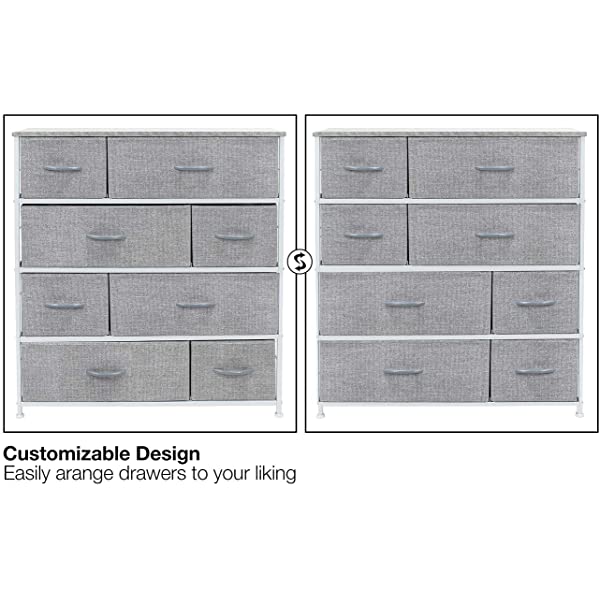 SMART & STYLISH DESIGN — Made with strong steel frame and durable MDF wood top with smooth finish — Drawers made of breathable, non-woven fabric — Wipe clean — Minimal assembly required — Hardware and instructions INCLUDED — Measures approximately 34” L x 11.5” W x 36” H. REMOVABLE & FOLDABLE DRAWERS — Soft fabric drawers with reinforced base — Easy pull handle for quiet opening and closing — Removable Drawers fold flat for easy storage when not in use — Entire unit is portable, lightweight, and easy to relocate to different spaces — Each drawer approx. 8.25” deep. FOR HOME, OFFICE, DORM — Suitable for bedroom, living room dresser, guest room, closet, nursery, hallway, college dorm, small apartment solutions, etc — Can be used as dressers for bedroom, storage cube dresser, 5 drawer dresser, small closet dresser, storage chest, living room dresser, sofa end tables, office supply storage, kids nightstand, or baby nursery table — Complements most décor whether traditional, rustic, or modern. DISPLAY & DE-CLUTTER — Wood top provides hard surface for displaying lamps, alarm clocks, books, eyeglasses, charging station, and more — Drawers great for storing clothes, blankets, linens, baby clothes, lingerie, purses, scarves, socks, accessories, gadgets, toiletries, cosmetics, hair/beauty products, paperwork, toys, knitting supplies, and household clutter. 8-DRAWER DRESSER (WHITE) — Style meets function with our dresser chest, complete with a wood surface and storage drawers — Pairs beautifully with the Sorbus Foldable Furniture Collection.