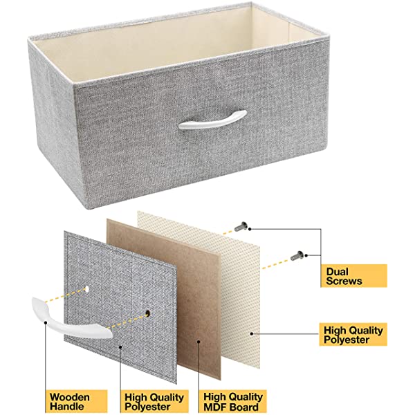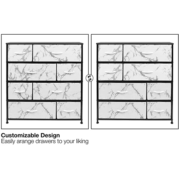 SMART & STYLISH DESIGN — Made with strong steel frame and durable MDF wood top with smooth finish — Drawers made of breathable, non-woven fabric — Wipe clean — Minimal assembly required — Hardware and instructions INCLUDED — Measures approximately 34” L x 11.5” W x 36” H. REMOVABLE & FOLDABLE DRAWERS — Soft fabric drawers with reinforced base — Easy pull handle for quiet opening and closing — Removable Drawers fold flat for easy storage when not in use — Entire unit is portable, lightweight, and easy to relocate to different spaces — Each drawer approx. 8.25” deep. FOR HOME, OFFICE, DORM — Suitable for bedroom, living room dresser, guest room, closet, nursery, hallway, college dorm, small apartment solutions, etc — Can be used as dressers for bedroom, storage cube dresser, 5 drawer dresser, small closet dresser, storage chest, living room dresser, sofa end tables, office supply storage, kids nightstand, or baby nursery table — Complements most décor whether traditional, rustic, or modern. DISPLAY & DE-CLUTTER — Wood top provides hard surface for displaying lamps, alarm clocks, books, eyeglasses, charging station, and more — Drawers great for storing clothes, blankets, linens, baby clothes, lingerie, purses, scarves, socks, accessories, gadgets, toiletries, cosmetics, hair/beauty products, paperwork, toys, knitting supplies, and household clutter. 8-DRAWER DRESSER (BLACK) — Style meets function with our dresser chest, complete with a wood surface and storage drawers — Pairs beautifully with the Sorbus Foldable Furniture Collection.