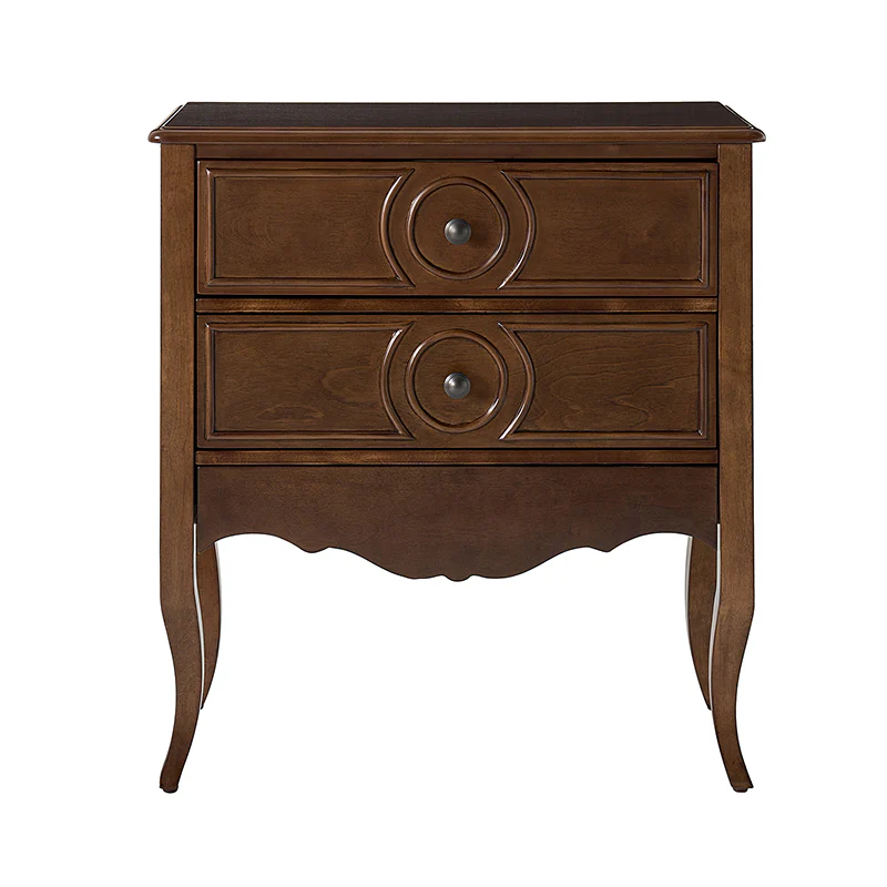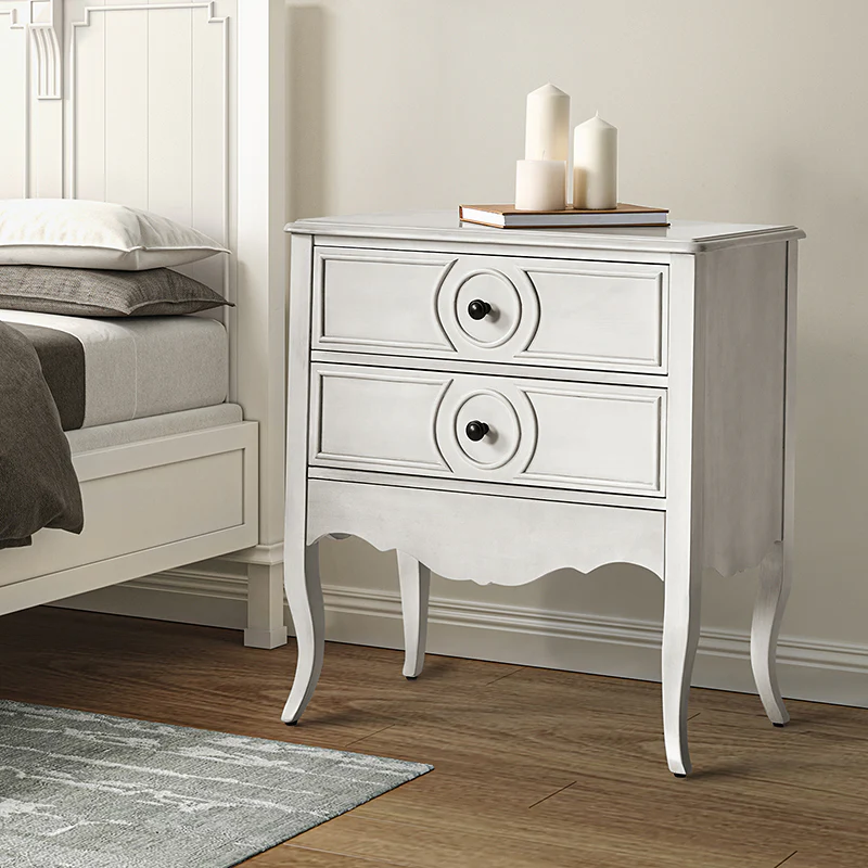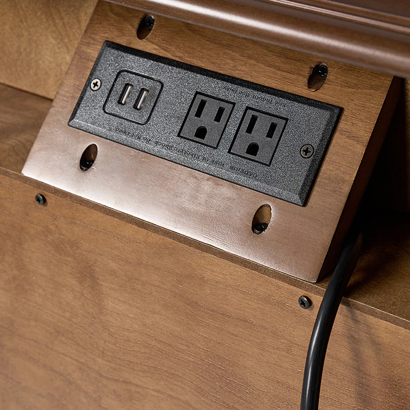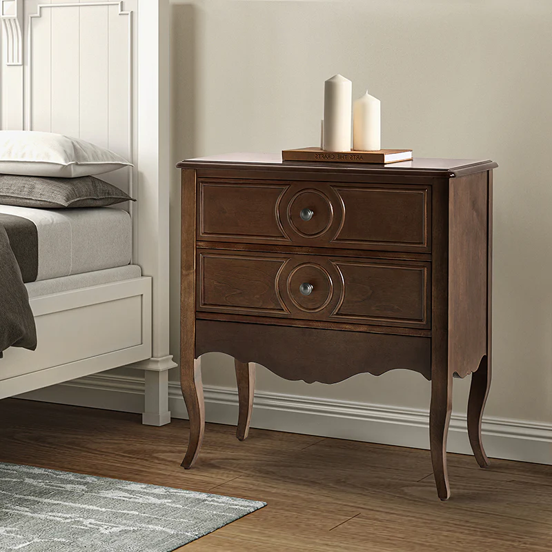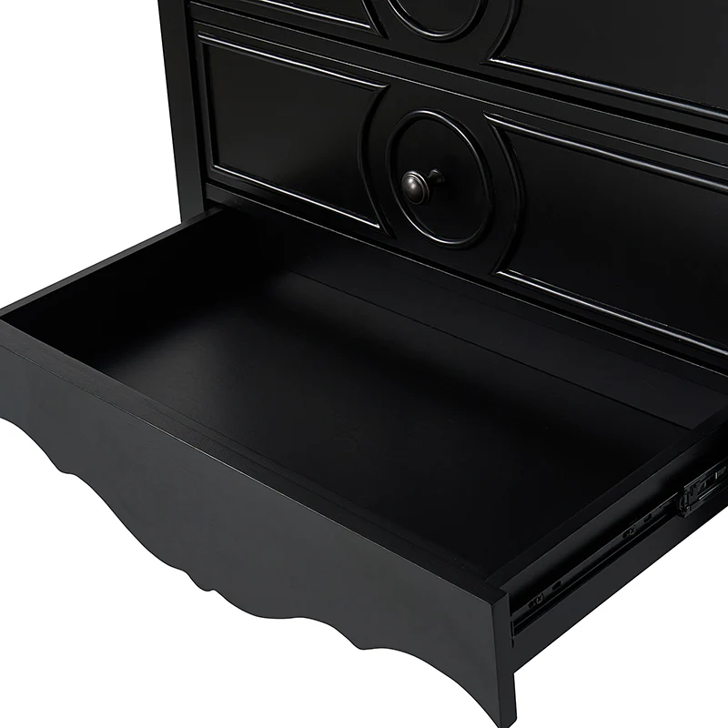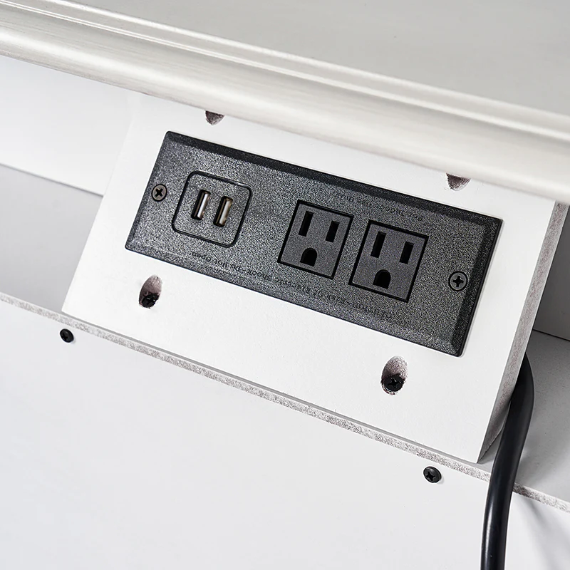 The classic nightstand with a hidden drawer is a blend of classic elegance and functionality. Its design features two visible drawers and a discreetly hidden drawer, providing ample storage space while maintaining a sleek appearance. The top drawer comes with a built-in charging station, offering convenient access to power your devices while keeping them organized. With its classical exterior and high legs, this nightstand exudes timeless charm and sophistication. The wooden trim detail creates a visually appealing framework, adding to its overall aesthetic. Additionally, the adjustable feet ensure stability and durable. This nightstand seamlessly combines traditional craftsmanship with mid-century practicality, making it a perfect addition to any bedroom setting.