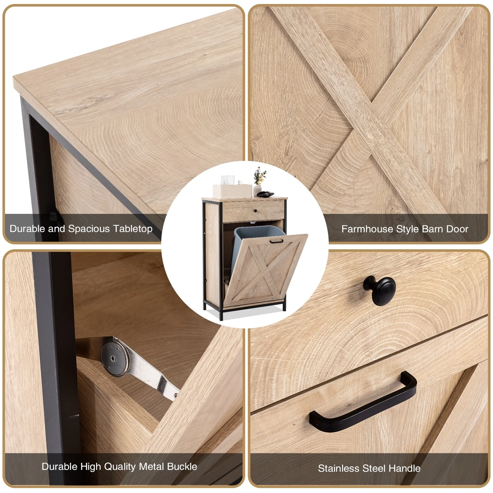 【Farmhouse Design】The retro-colored barn door is subtly combined with a black metal frame, adding a touch of farmhouse flair to your industrial style. This trash cabinet will blend in seamlessly with the rest of your decor.