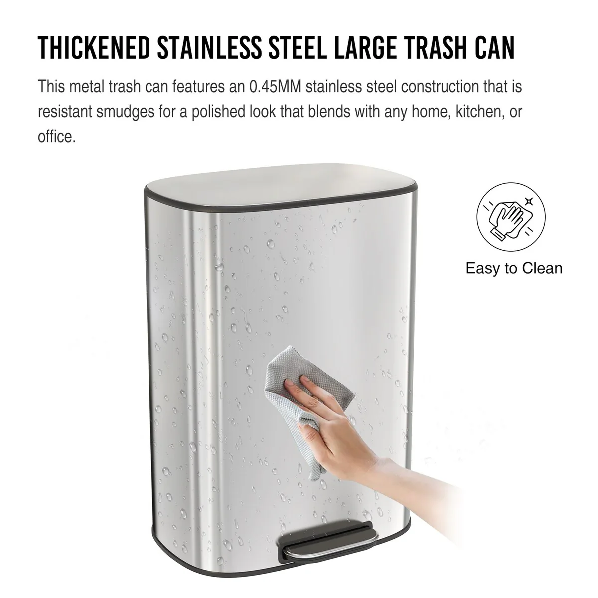 High quality all stainless-steel thickened trash can body by 0.45MM stainless steel material production. Compared to most 0.3MM materials trash can on the market, our stainless steel trash can are less prone to deformation and are stronger in use! High-quality410 stainless steel and ABS construted, our trashcan is build to last!