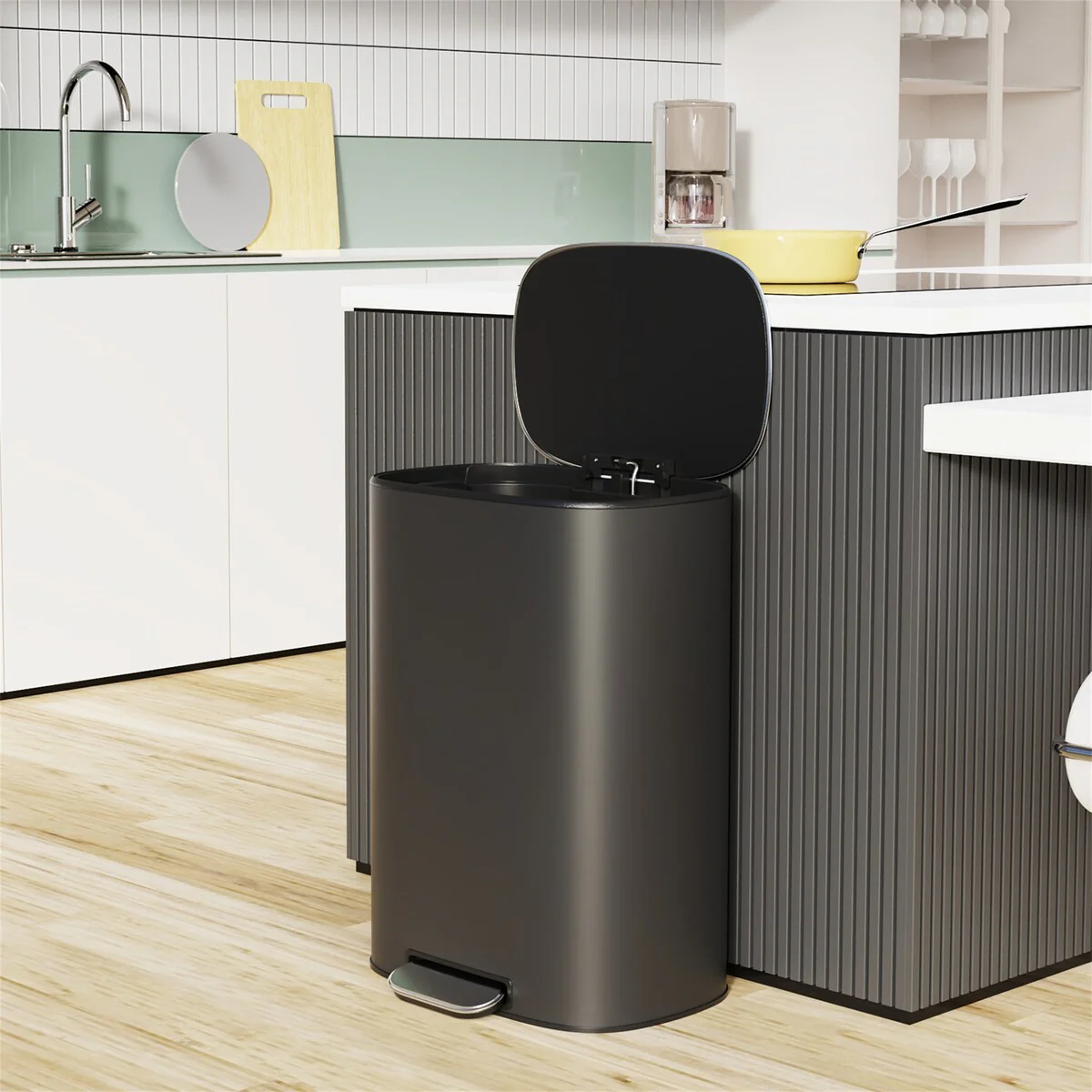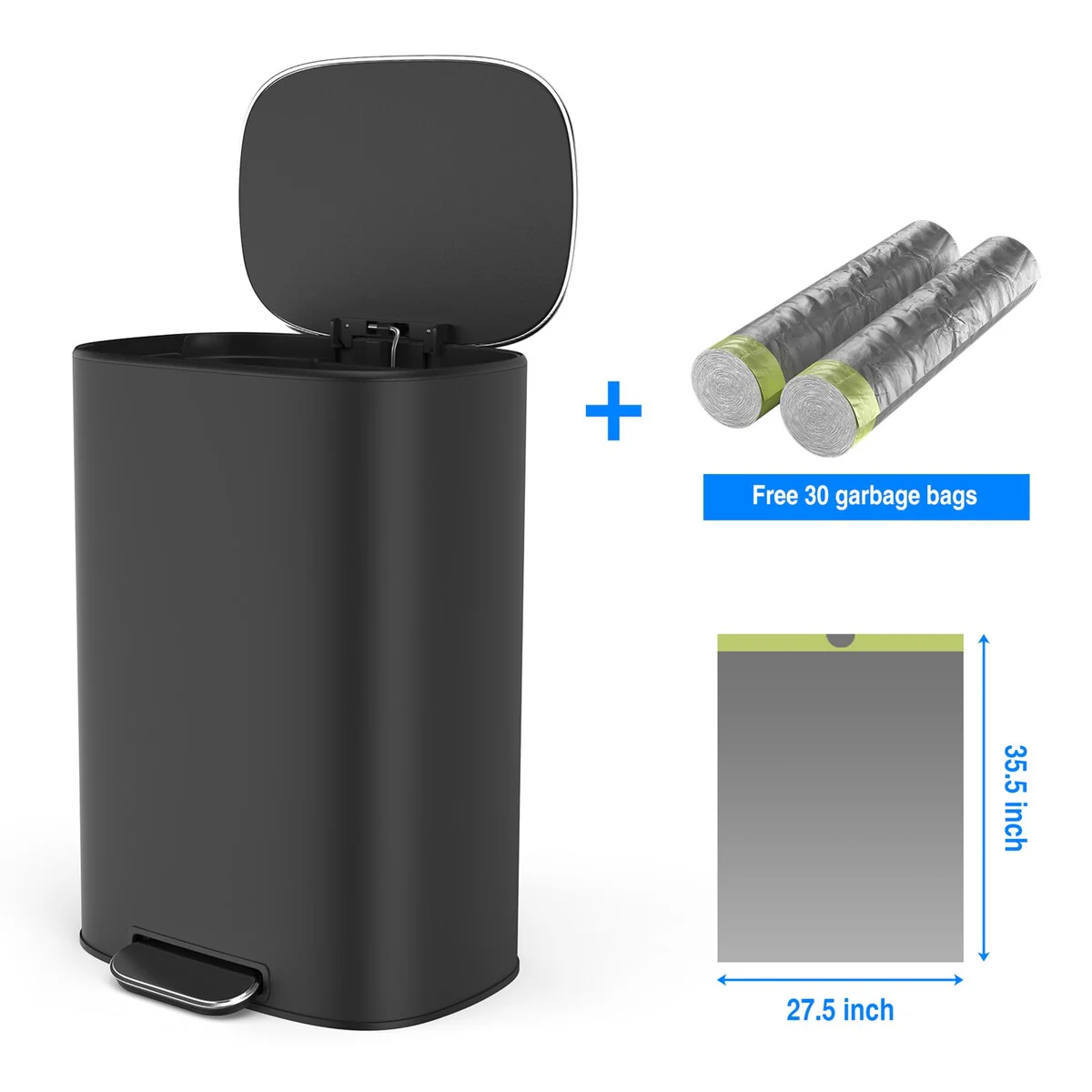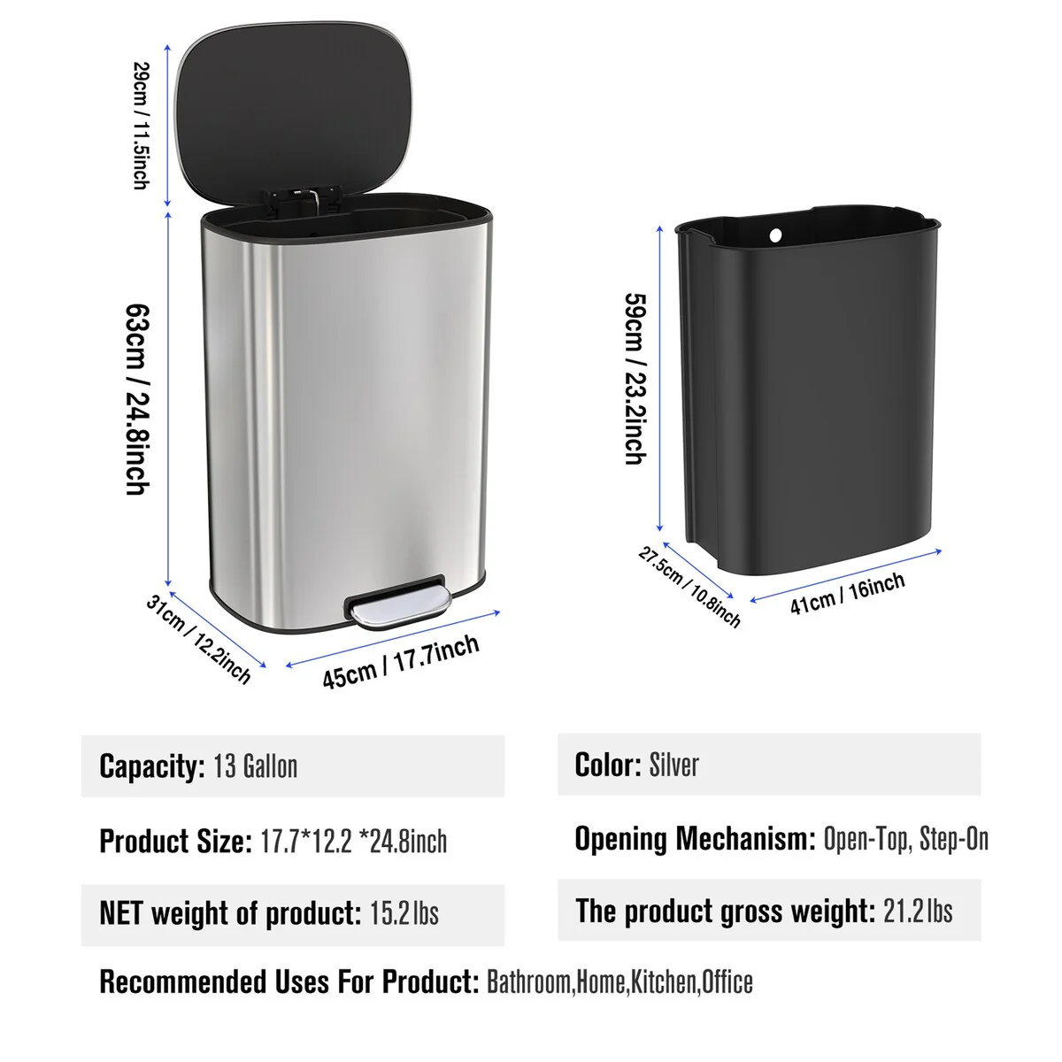 13.2 gallon/50 liter. The huge capacity definitely meets your daily use, this can fits most brands of 13 gallon trash bags. It can be a good helper for your kitchen and make your room clean and tidy. The sophisticated rectangular appearance also makesit suitable for a variety of occasions. It makes a shining impression from the outside.