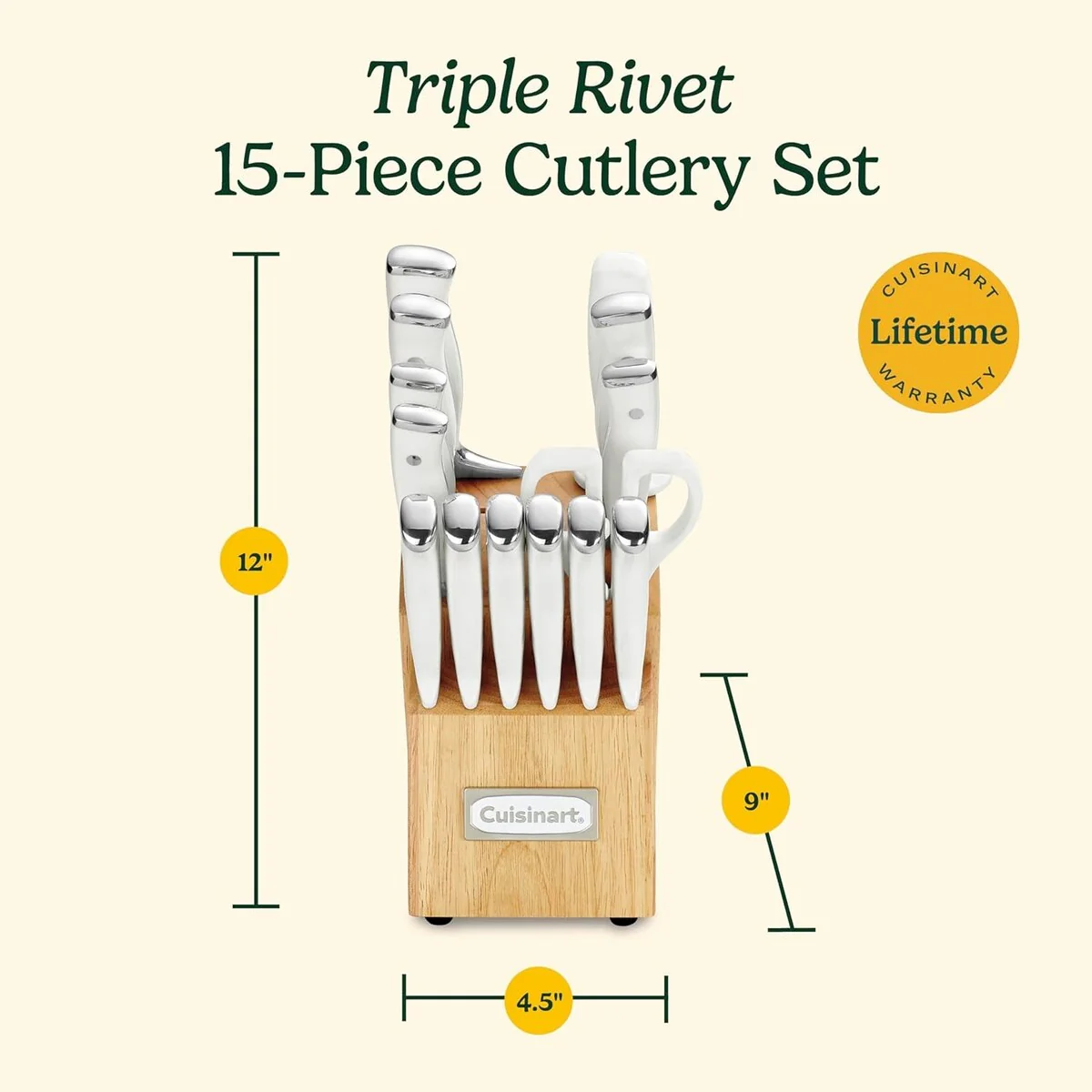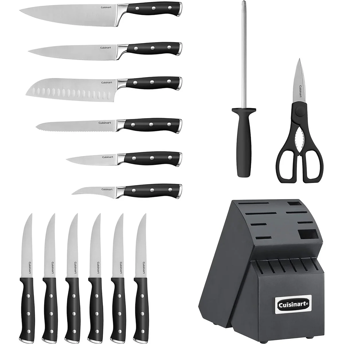 The Classic Forged Triple Rivet Cutlery possesses superior high-carbon stainless steel blades for precision and accuracy.  8-inch Chef Knife, 8-inch Slicing Knife, 7-inch Santoku Knife, 5.5-inch Utility Knife, 3.5-inch Paring Knife, 2.75-inch Bird's Beak Paring Knife, 4.5-inch Steak Knives (6), 8-inch Sharpening Steel, All-Purpose Household Shears and Wooden Block.
