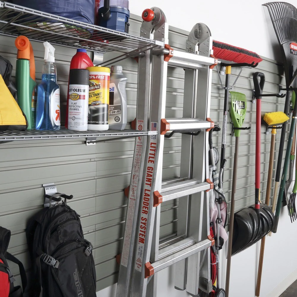 Wall organization is the most efficient way to store and access items in the garage. This Bonus Set includes two boxes of 24 sq. ft. panels, six 4-inch hooks, four 8-inch hooks, one heavy duty dual bracket hook, and four metal bracket shelves.