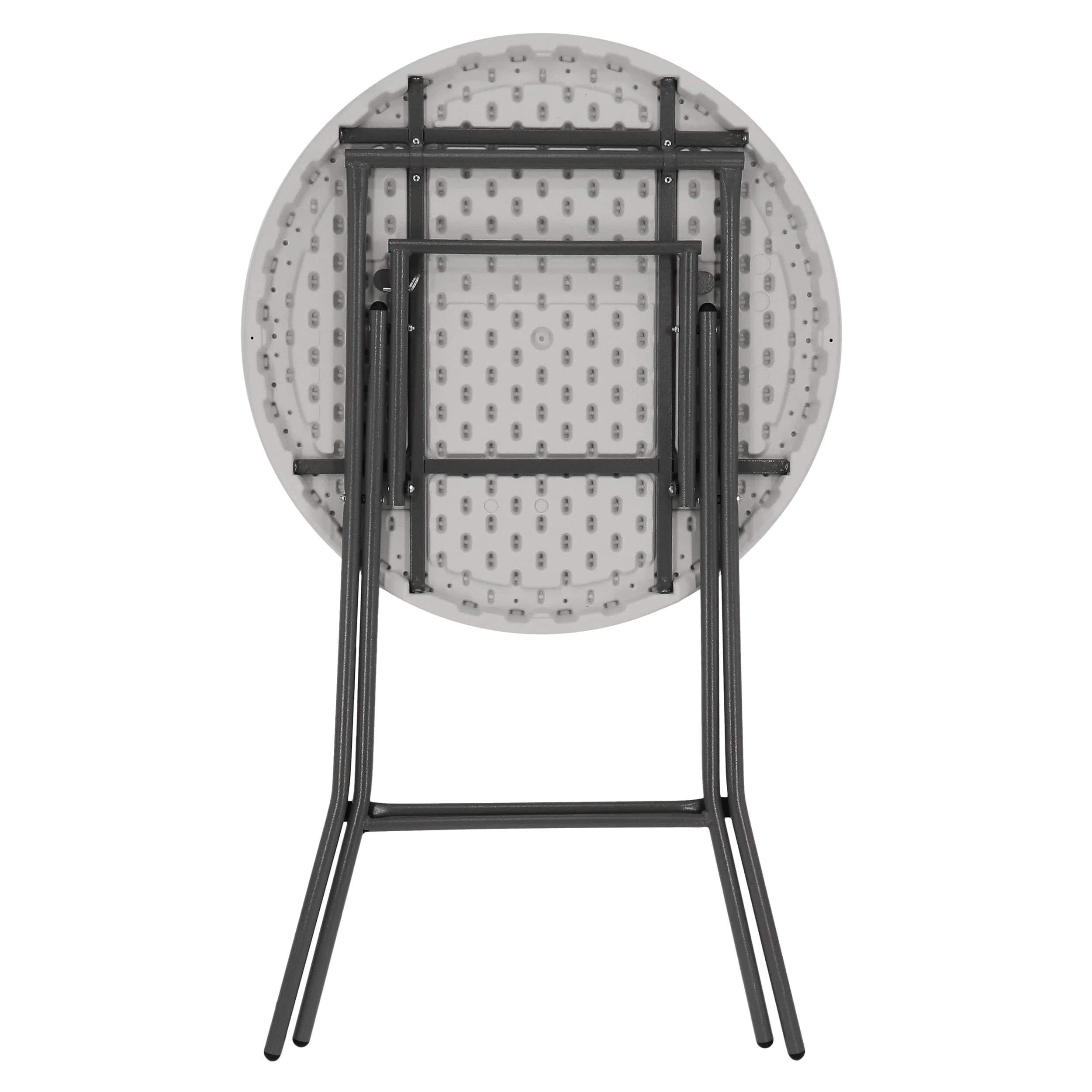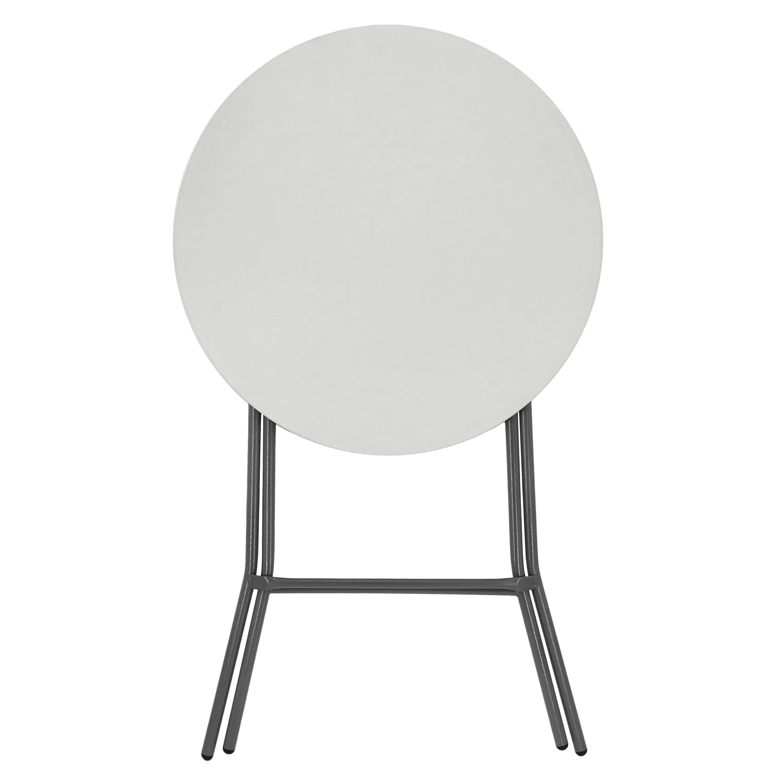 Be ready for any occasion with this Elama 31 Inch Plastic Round Folding Bar Table in White. Pop out this table at anytime, easily fold it out for quick use and a locking ring keeps the table safely open. Nonslip feet won't scratch your floors or patio while keeping the table in place. The plastic material with metal legs is a breeze to clean up, perfect for serving food and using outside. When you're done, simply pull the ring located on the inside leg and fold it flat to store it away for next time. Invite friends and family over for a cocktail party since this table is the perfect size and shape for enjoying drinks, or use it to serve food and cake at a birthday party or wedding!