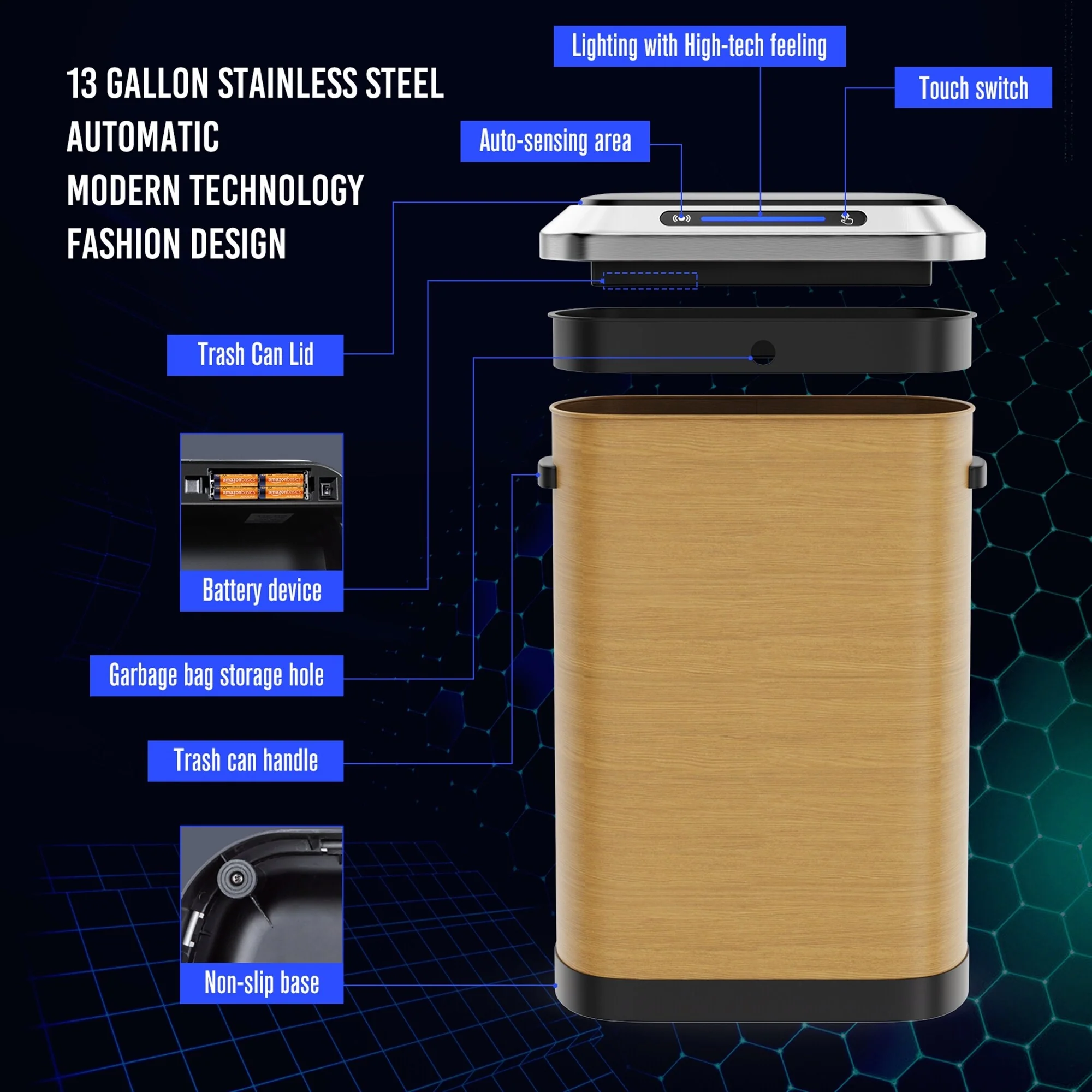 ★This product is a motion sensor trash can. Need to install 4 AA batteries(not included). When an object approaches the trash can, hands-free operation lid opens within moment when in range of the sensor, and the lid will automatically close after staying for 5 seconds(Closure process indicated by countdown beam).