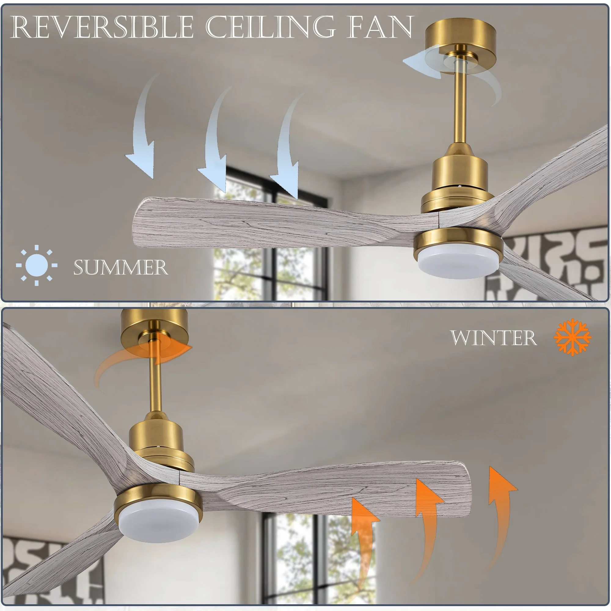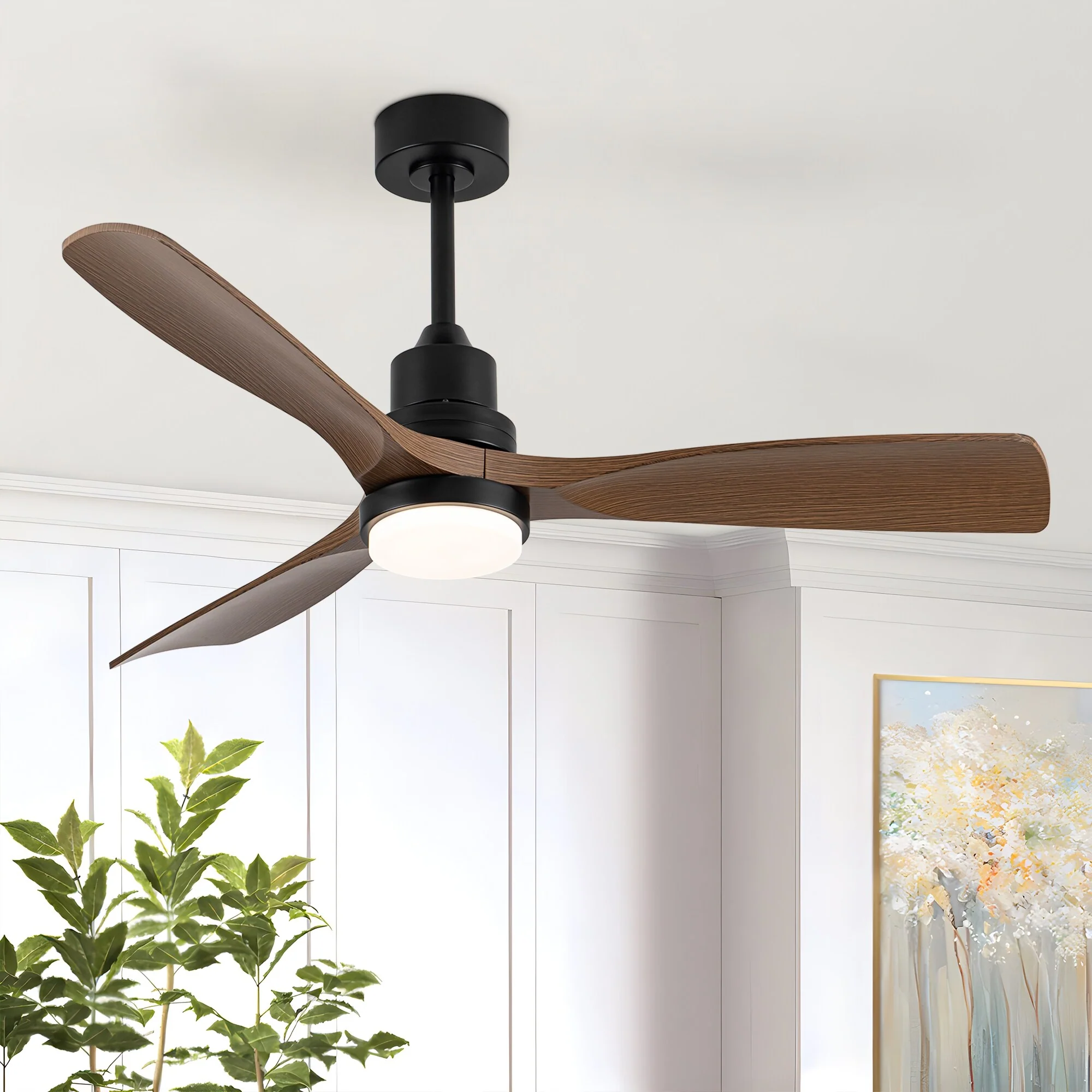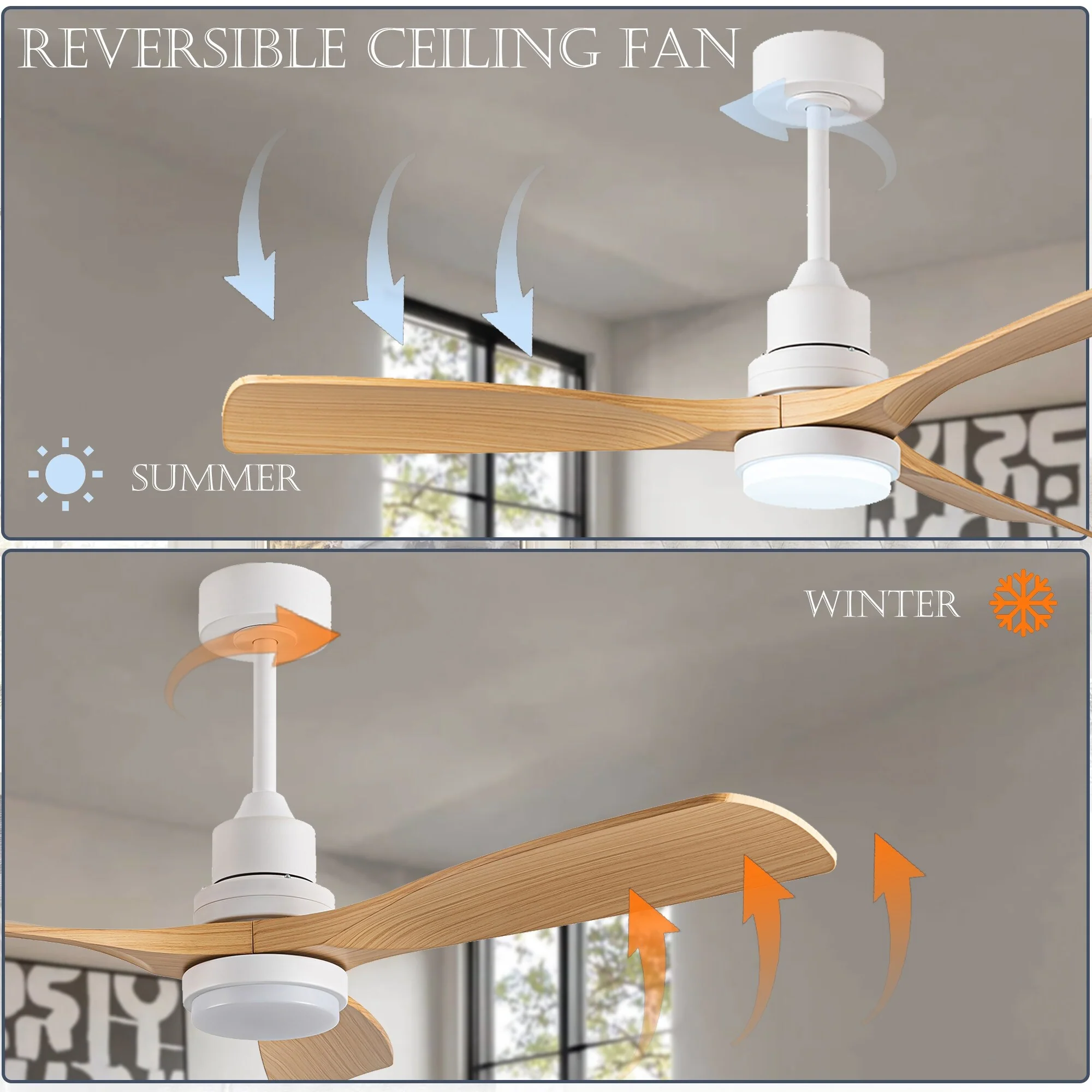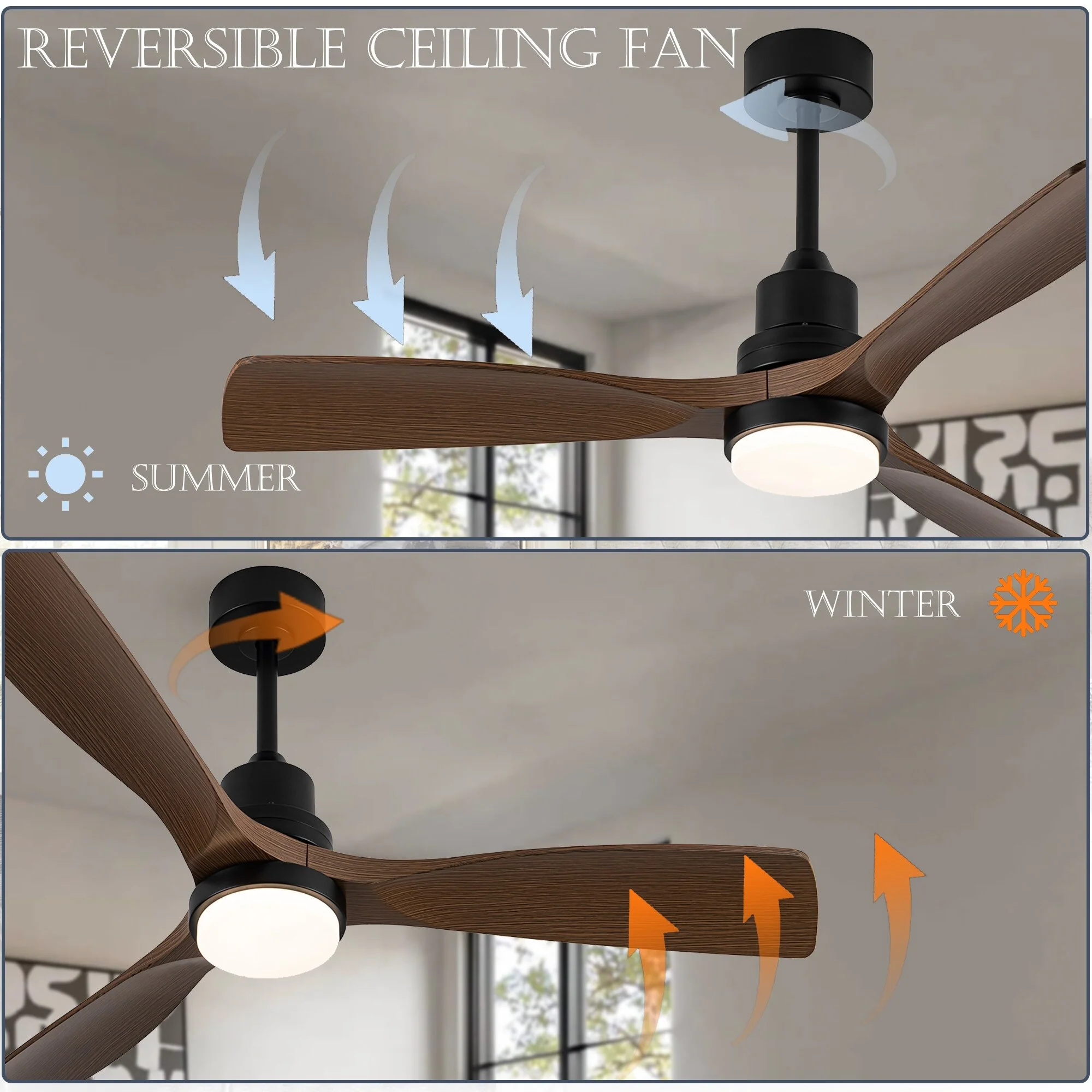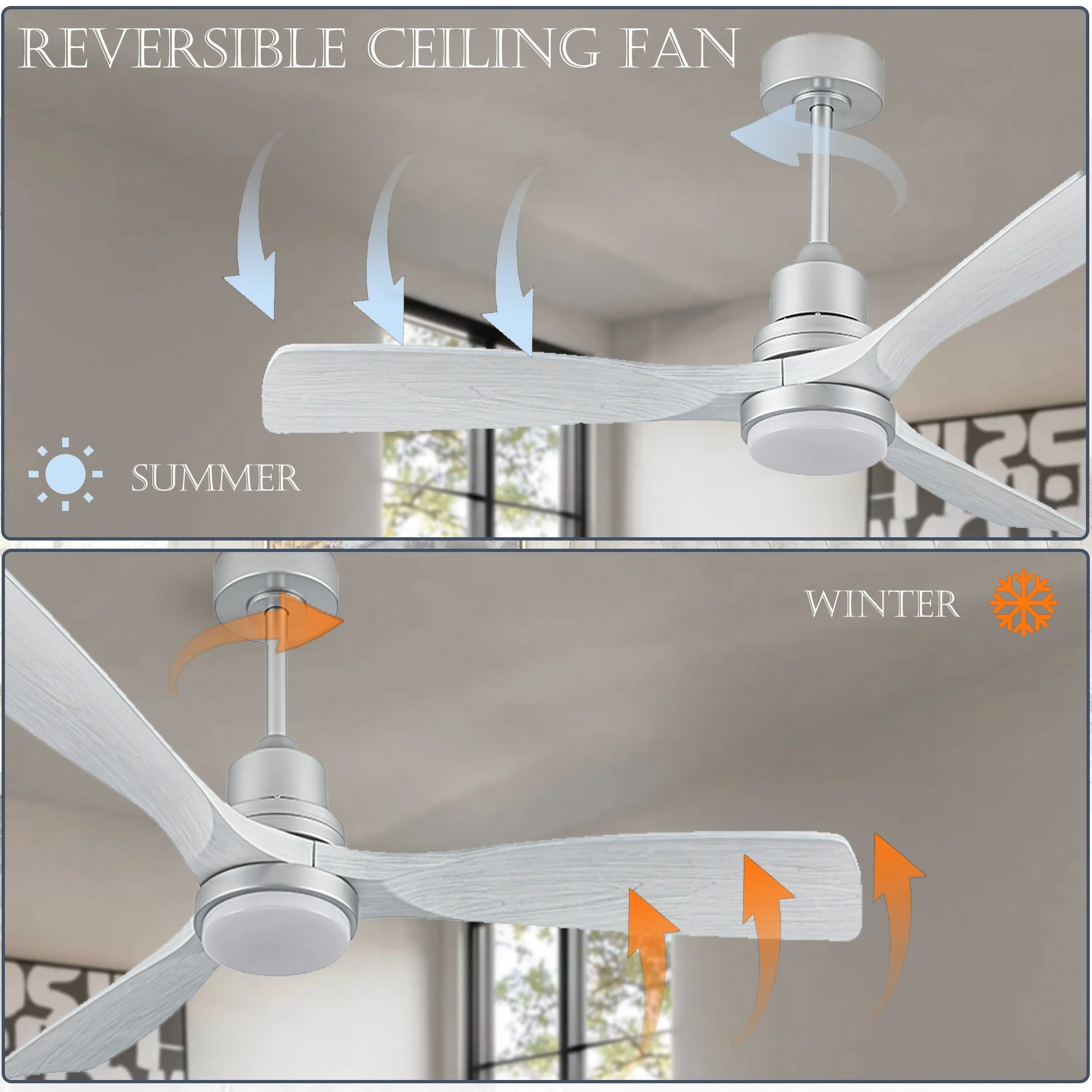 Ceiling Fan with LED light for your unique experience, creates a chic and vintage style for your home. 52" 3-blades of ABS wood-like with various classic color options. Reversible DC motor, smooth air circulation, enjoy the cool breeze four seasons. With 3 replaceable booms of different lengths to suit the ceiling height. LED light for three-color variable and remote control. Modern and rustic fusion styles, create a timeless classic. Simple lines match various decorated rooms.