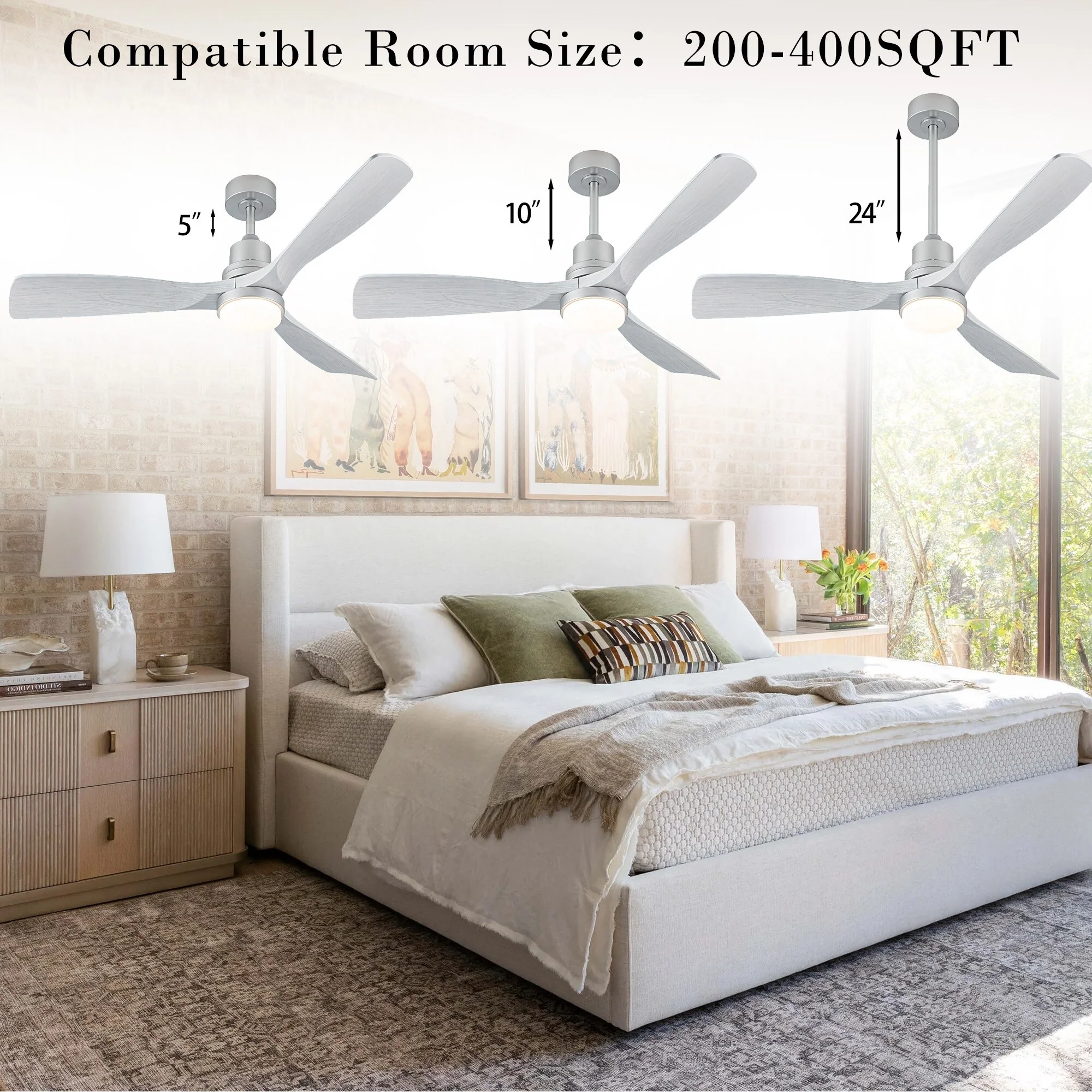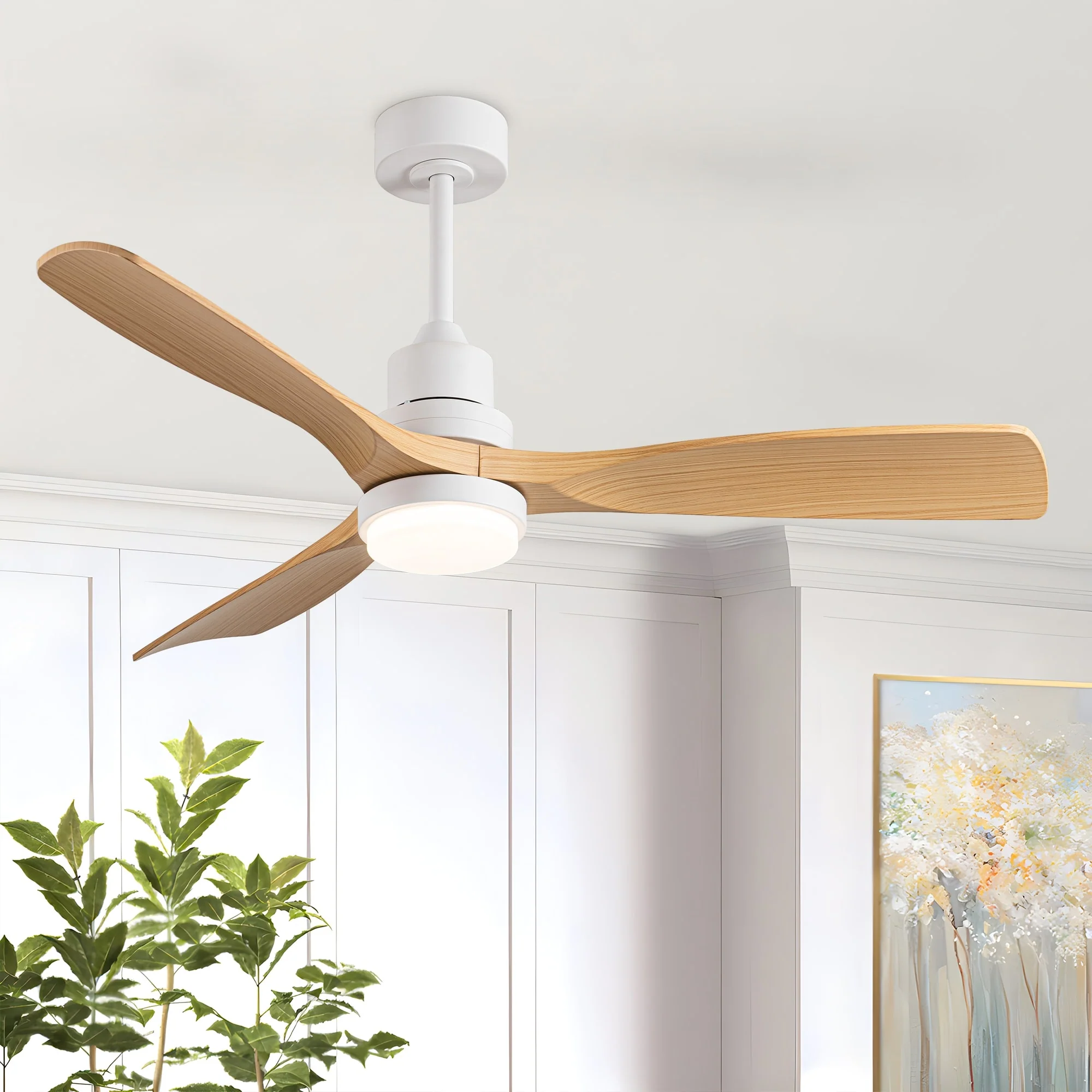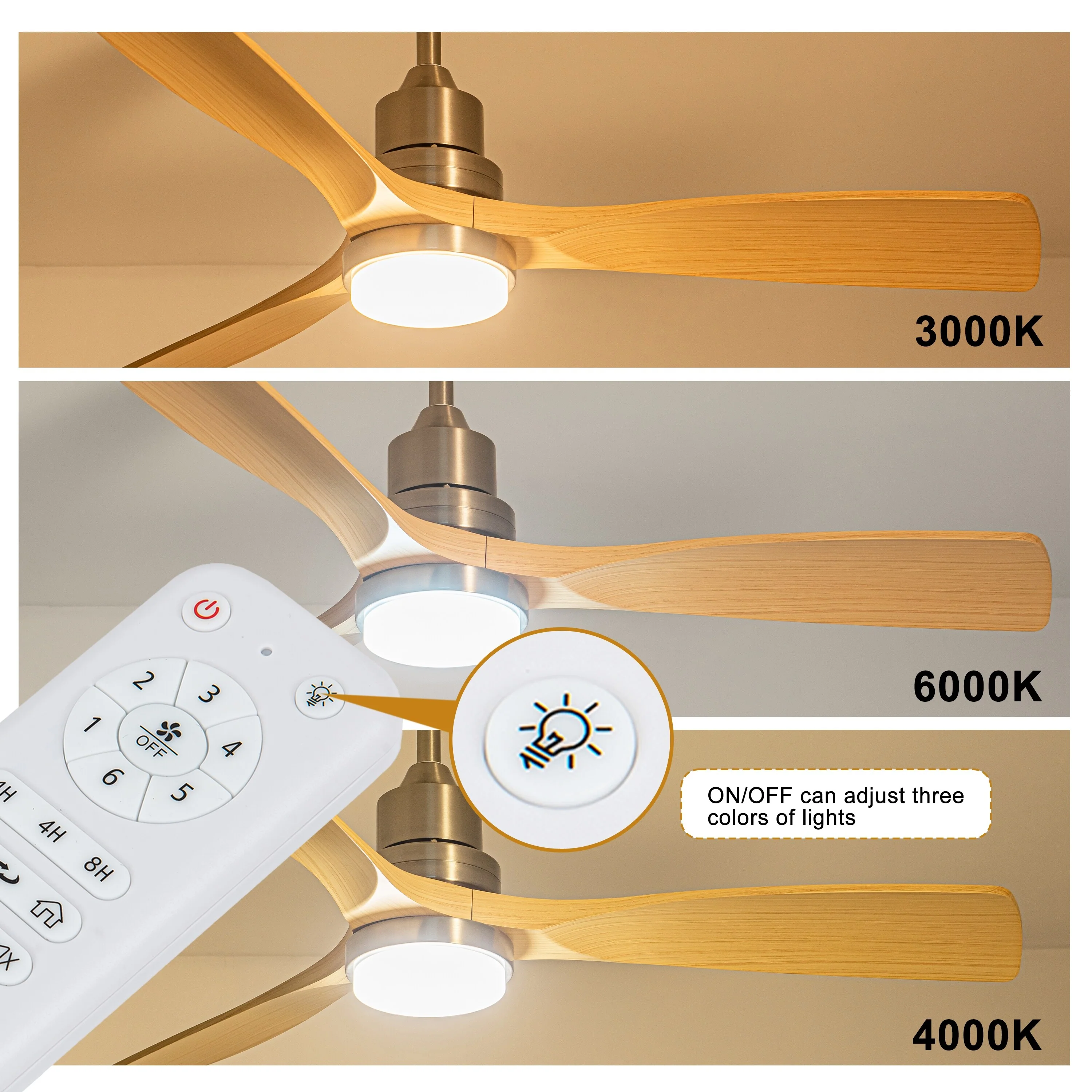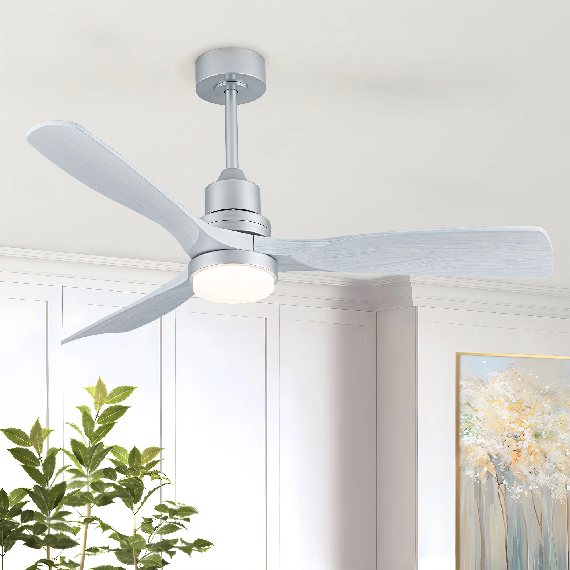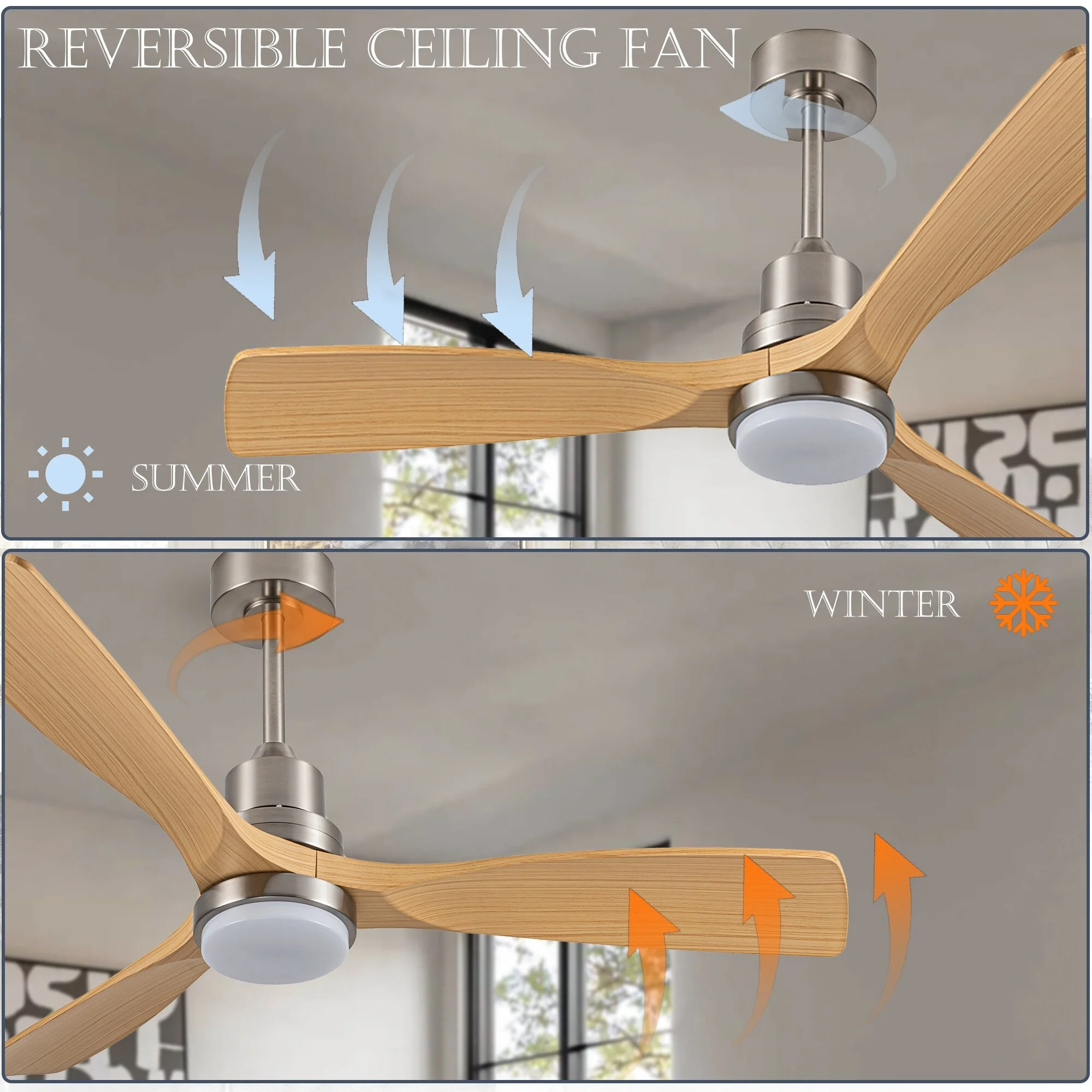 Ceiling Fan with LED light for your unique experience, creates a chic and vintage style for your home. 52" 3-blades of ABS wood-like with various classic color options. Reversible DC motor, smooth air circulation, enjoy the cool breeze four seasons. With 3 replaceable booms of different lengths to suit the ceiling height. LED light for three-color variable and remote control. Modern and rustic fusion styles, create a timeless classic. Simple lines match various decorated rooms.