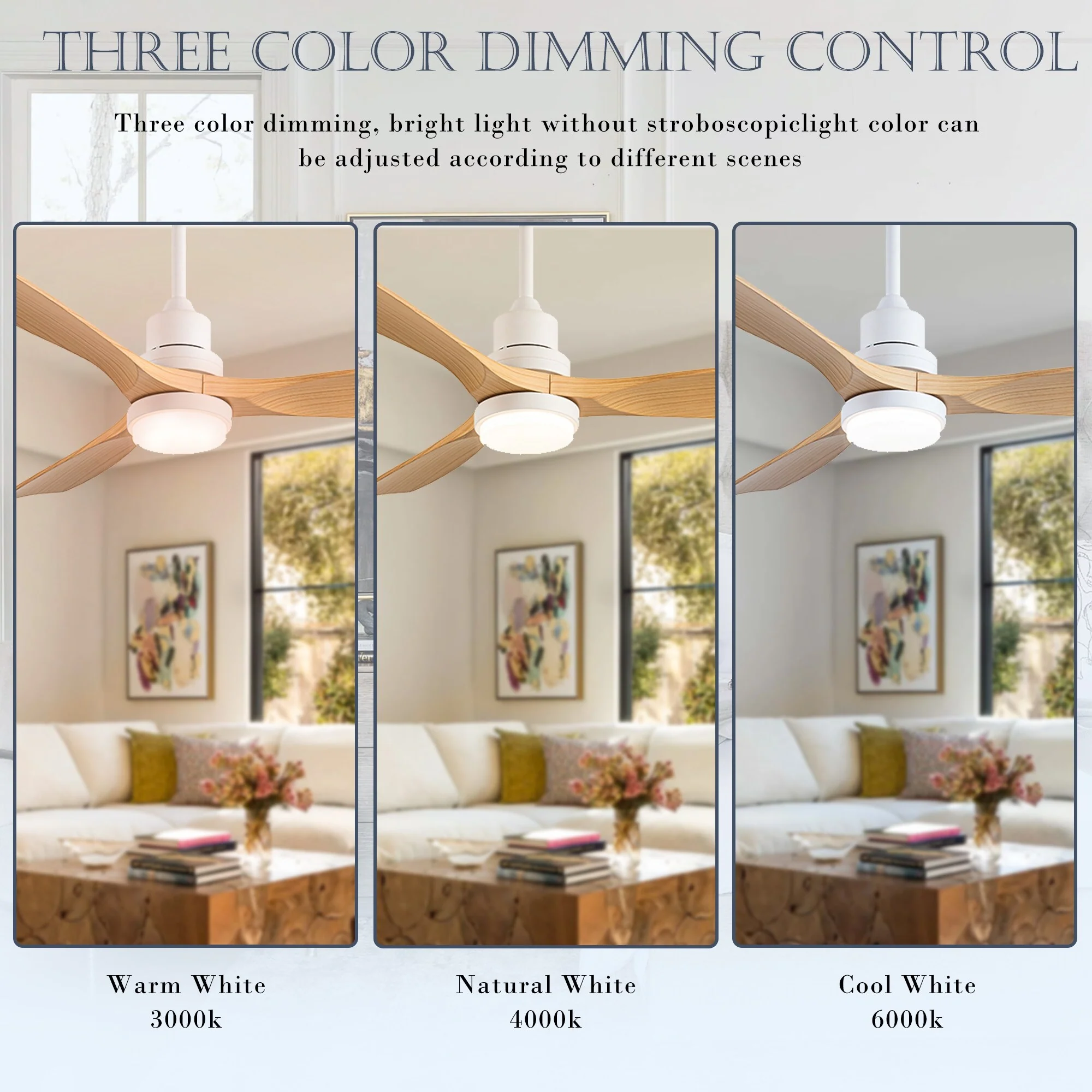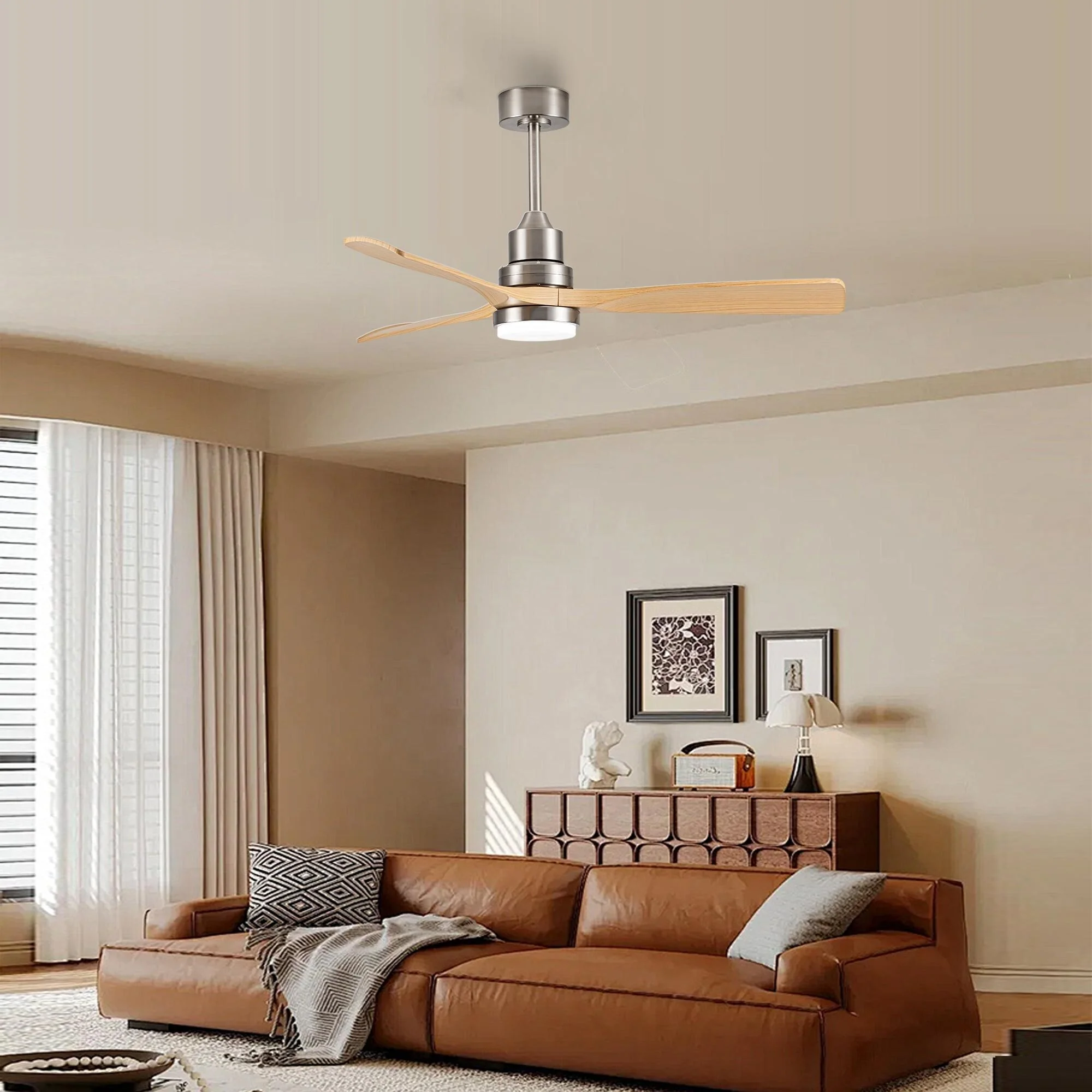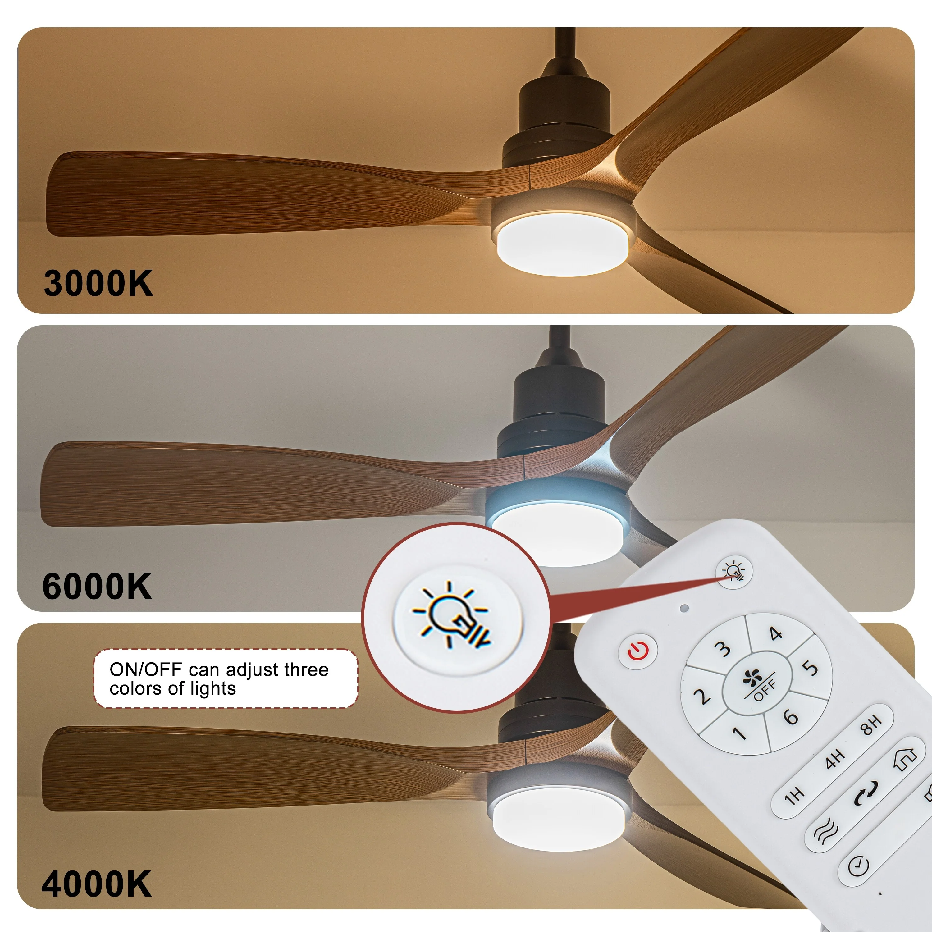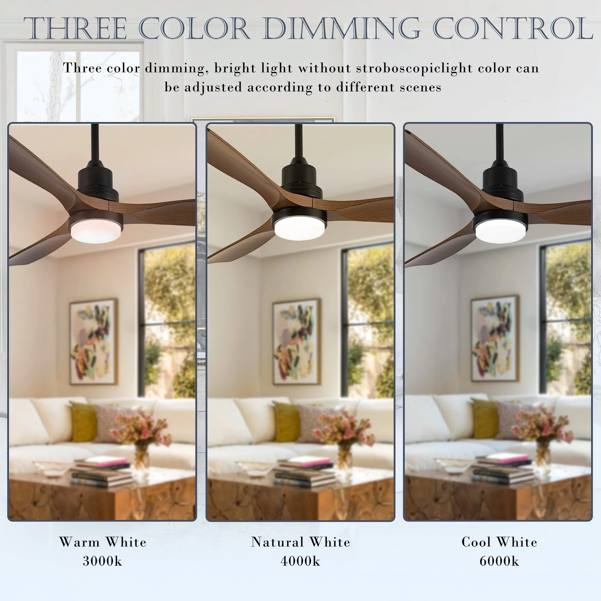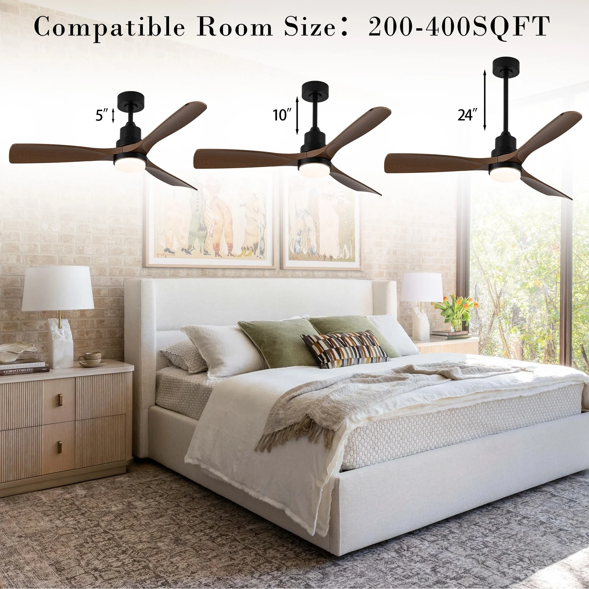 Ceiling Fan with LED light for your unique experience, creates a chic and vintage style for your home. 52" 3-blades of ABS wood-like with various classic color options. Reversible DC motor, smooth air circulation, enjoy the cool breeze four seasons. With 3 replaceable booms of different lengths to suit the ceiling height. LED light for three-color variable and remote control. Modern and rustic fusion styles, create a timeless classic. Simple lines match various decorated rooms.