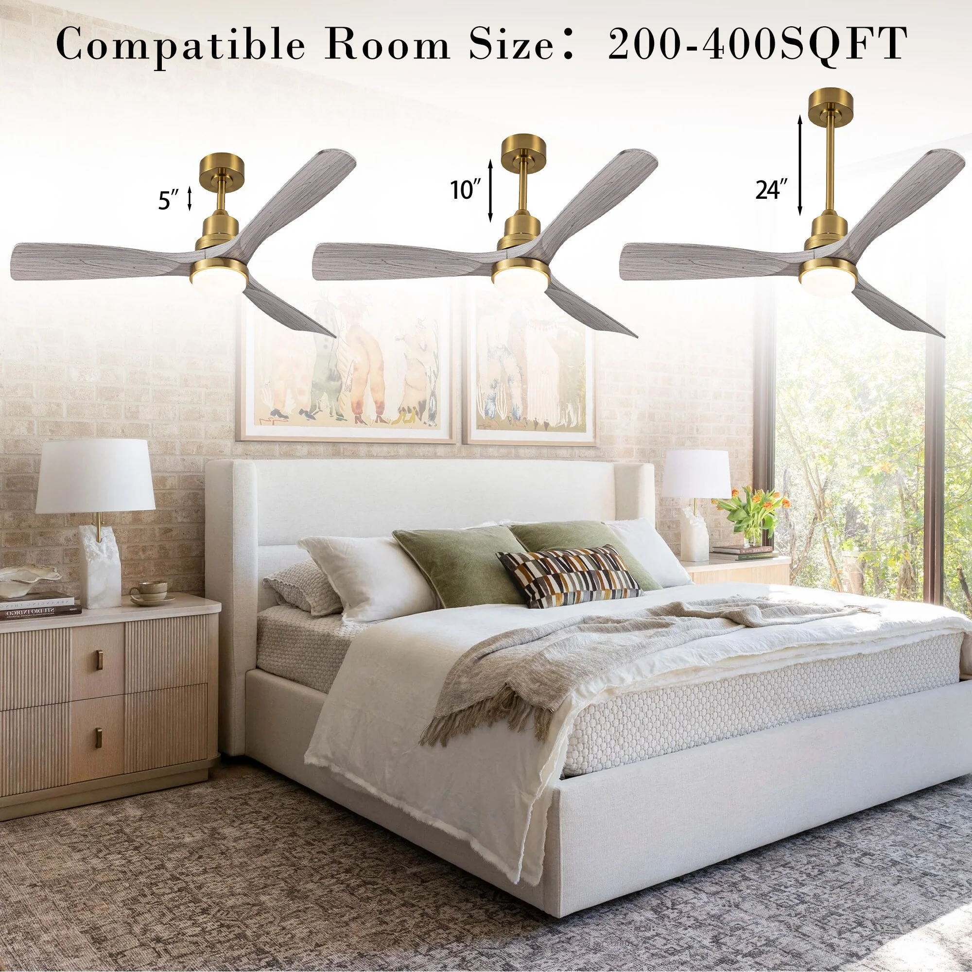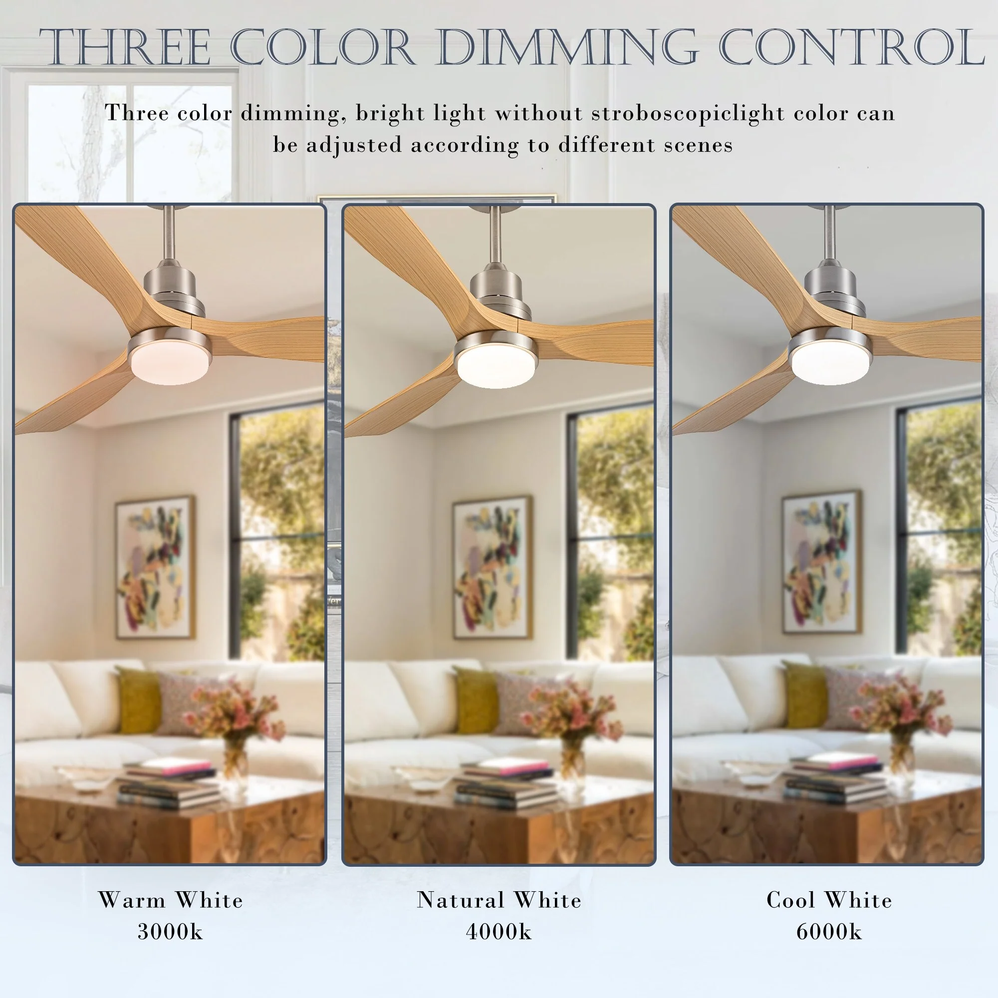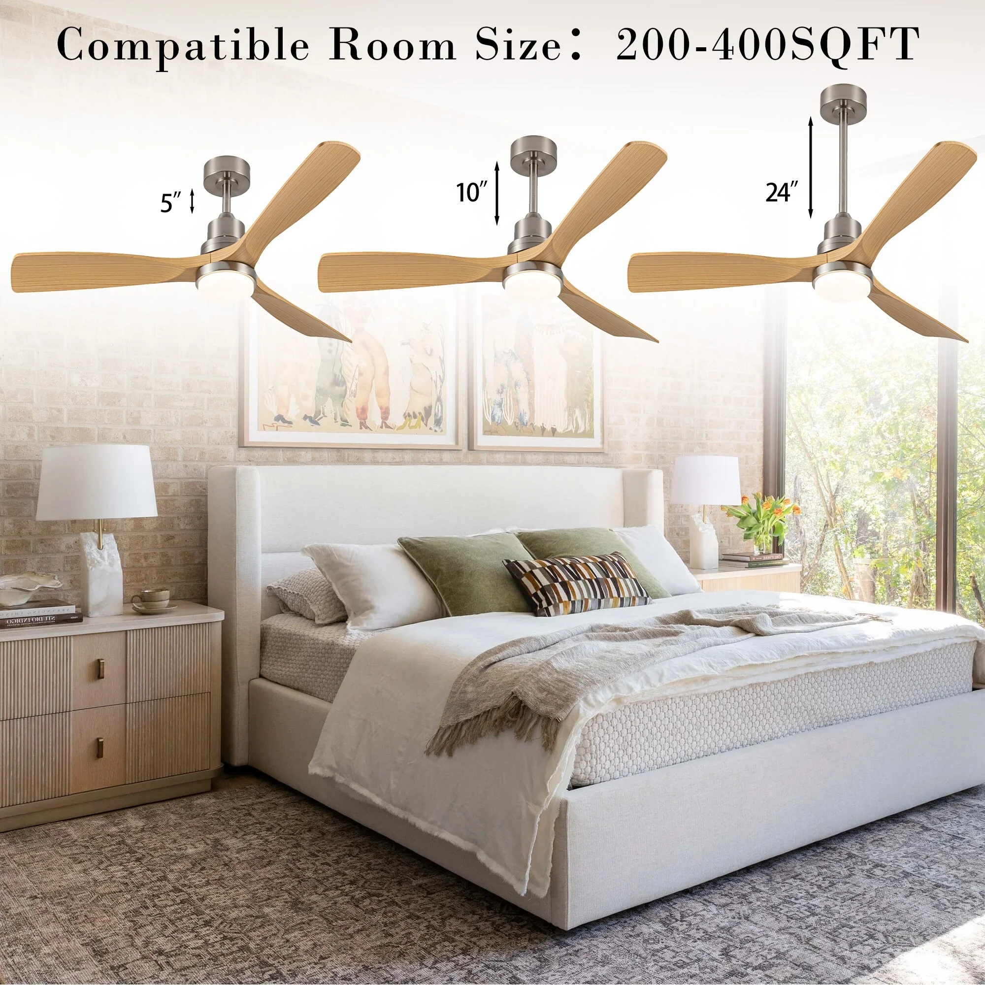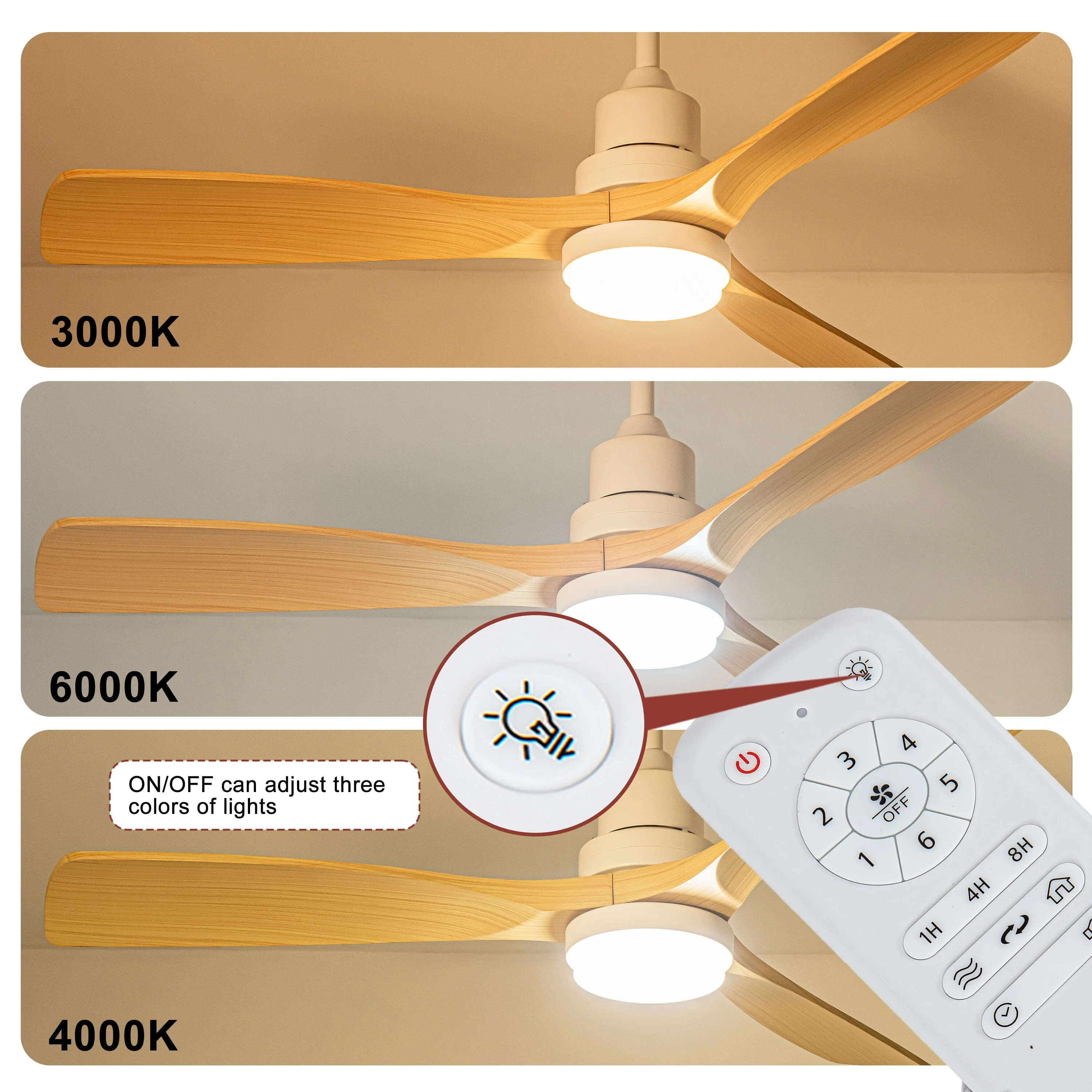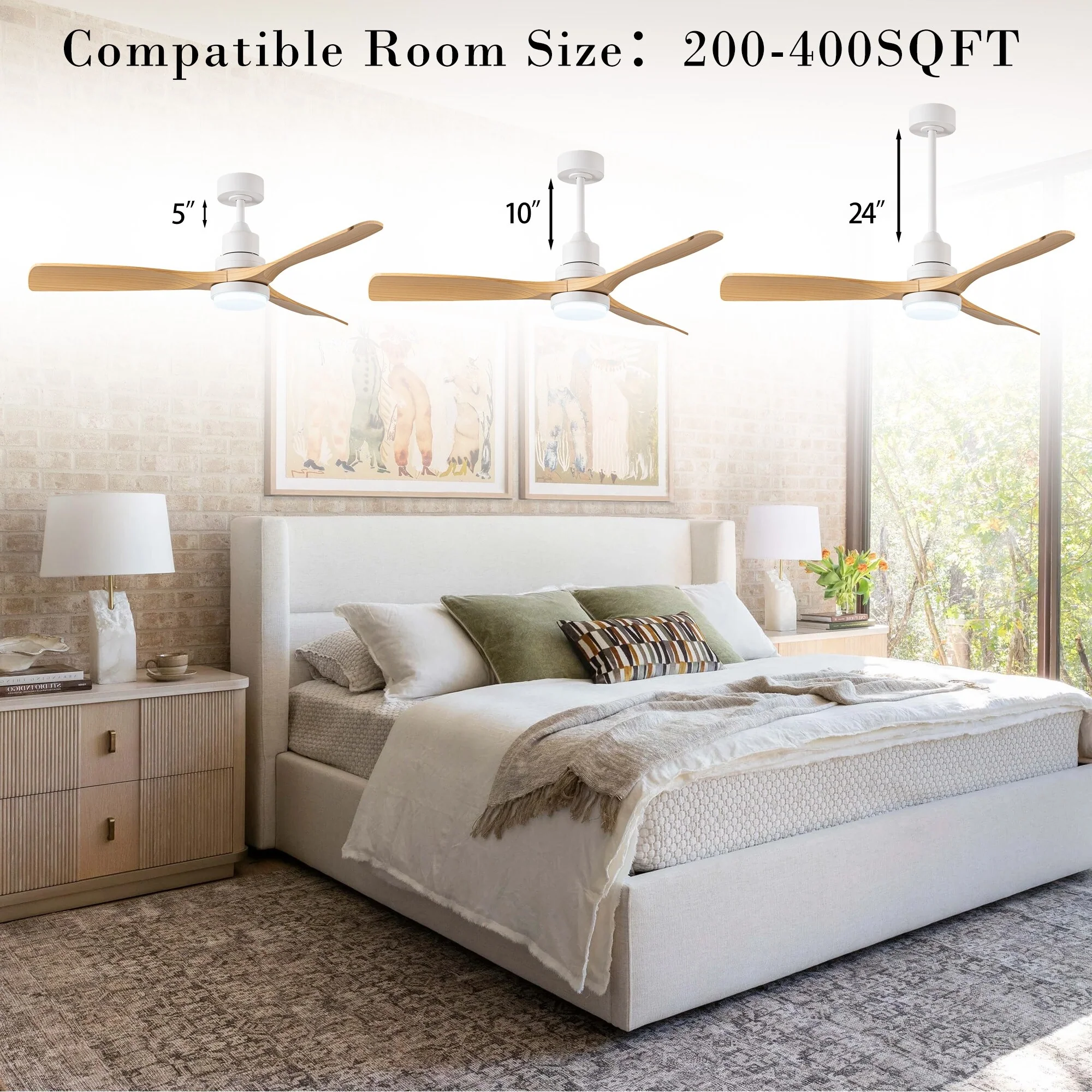 Ceiling Fan with LED light for your unique experience, creates a chic and vintage style for your home. 52" 3-blades of ABS wood-like with various classic color options. Reversible DC motor, smooth air circulation, enjoy the cool breeze four seasons. With 3 replaceable booms of different lengths to suit the ceiling height. LED light for three-color variable and remote control. Modern and rustic fusion styles, create a timeless classic. Simple lines match various decorated rooms.