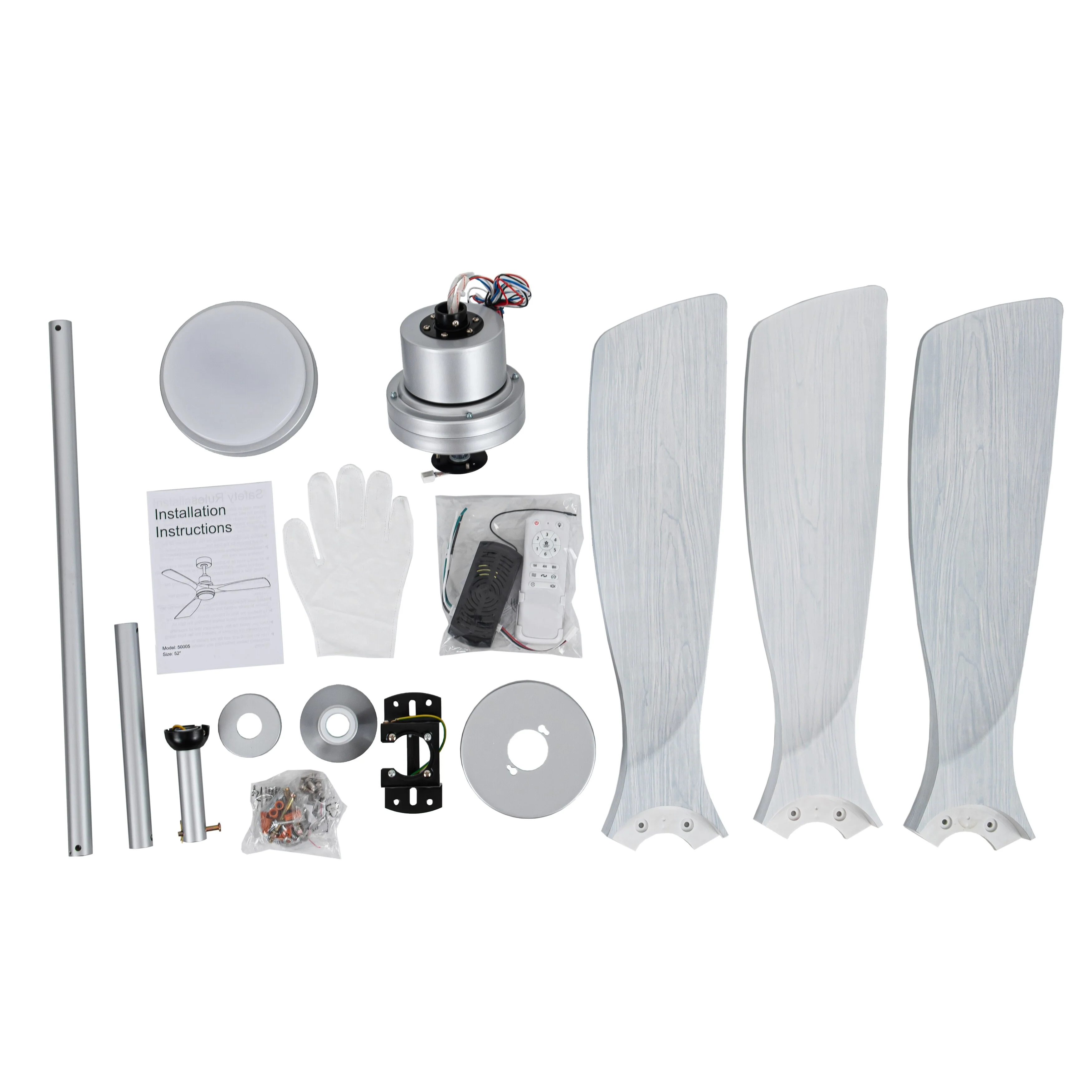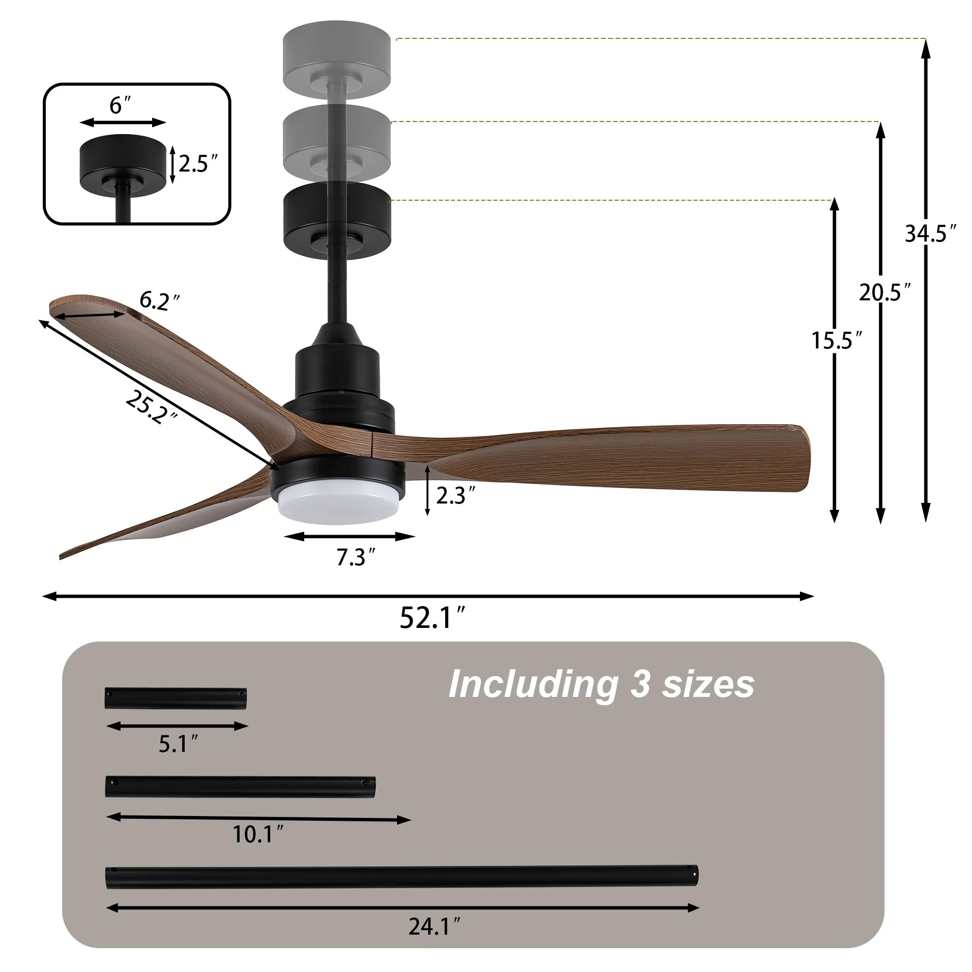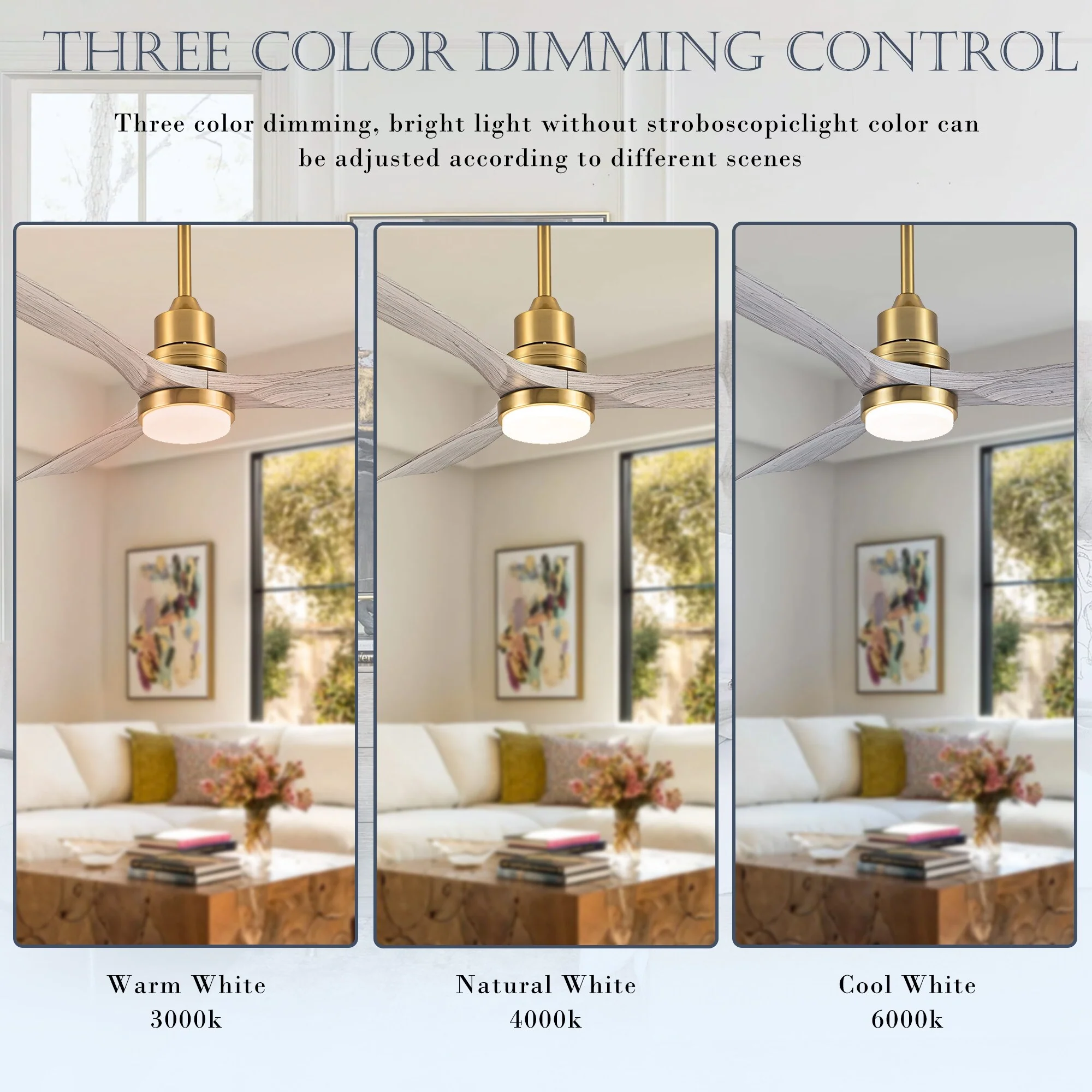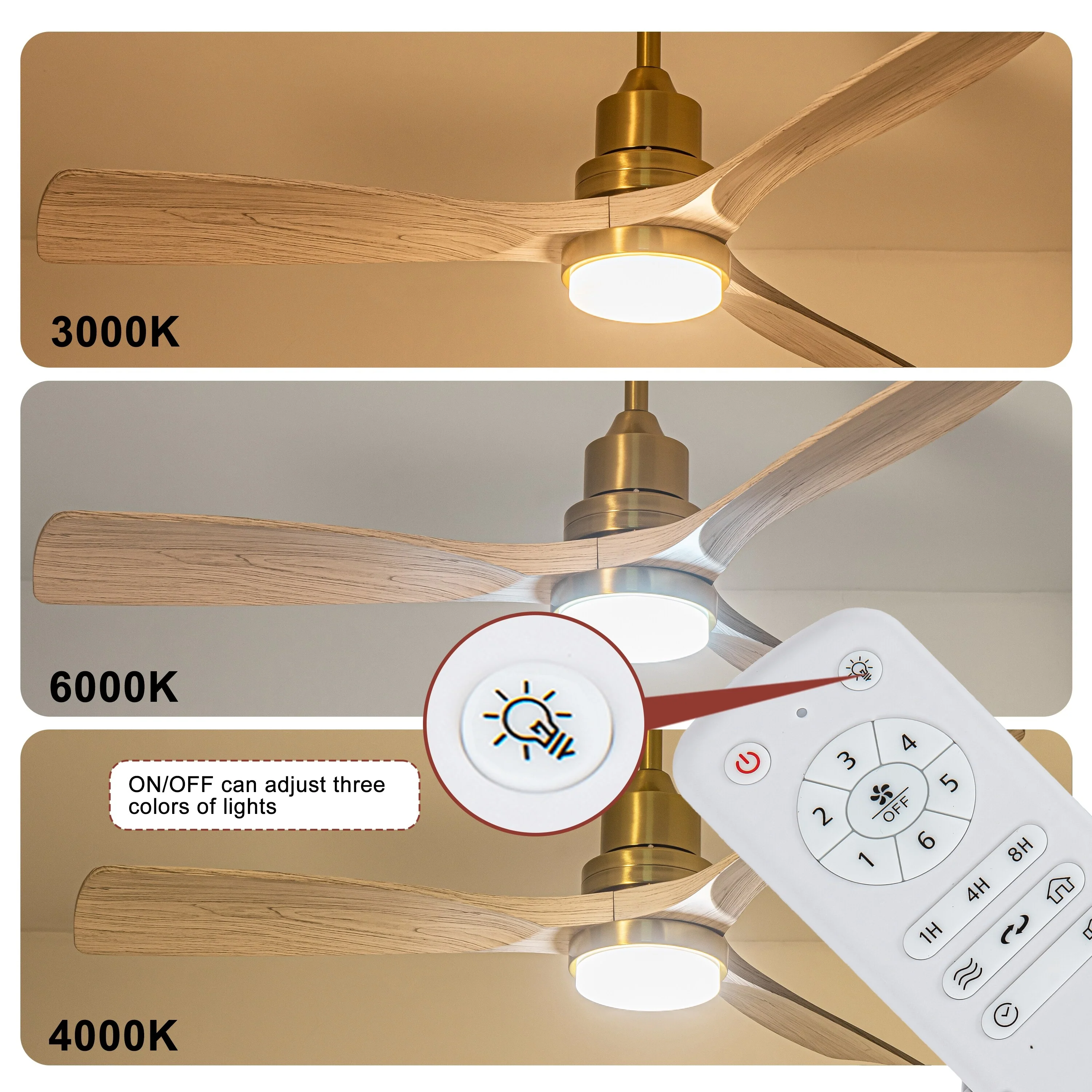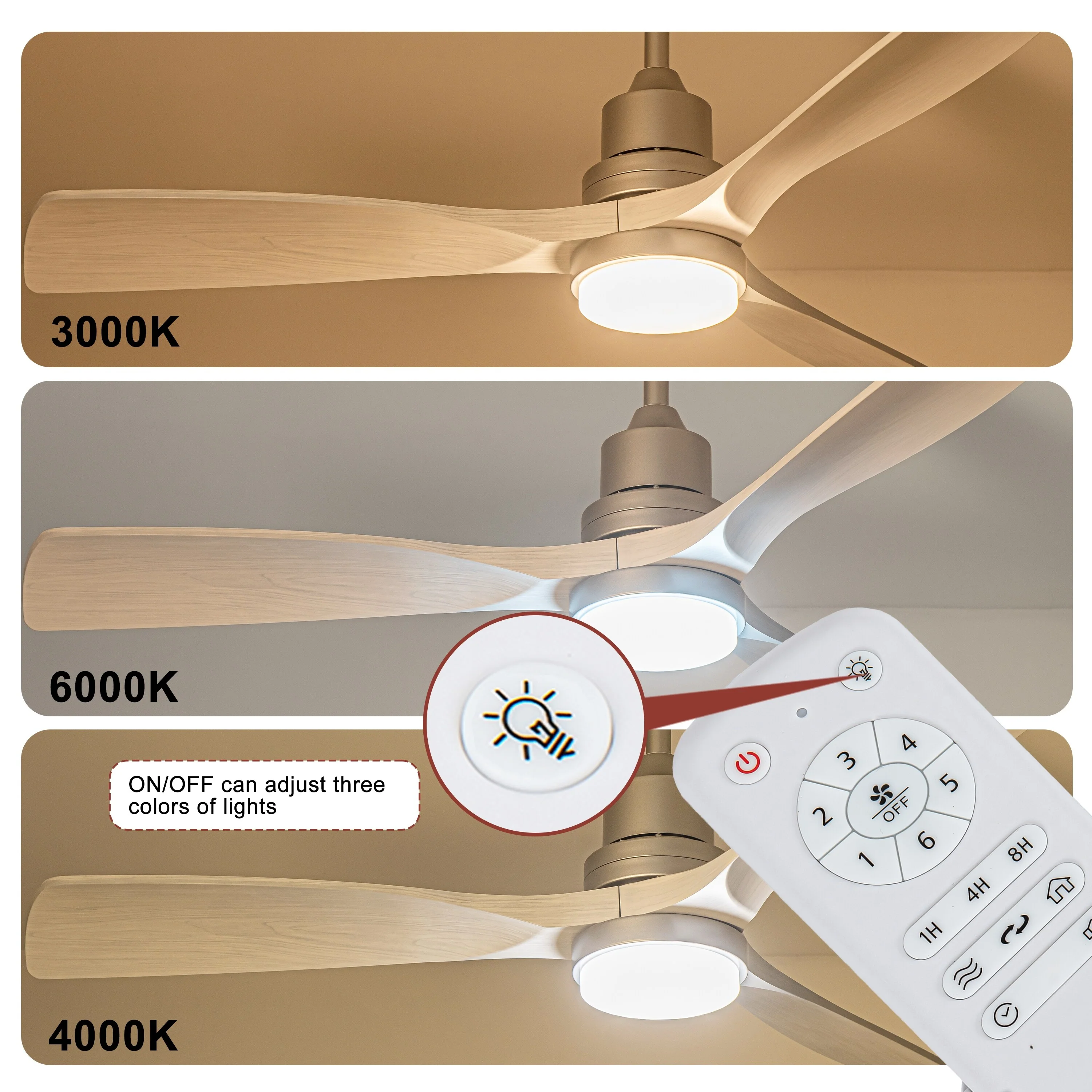 Ceiling Fan with LED light for your unique experience, creates a chic and vintage style for your home. 52" 3-blades of ABS wood-like with various classic color options. Reversible DC motor, smooth air circulation, enjoy the cool breeze four seasons. With 3 replaceable booms of different lengths to suit the ceiling height. LED light for three-color variable and remote control. Modern and rustic fusion styles, create a timeless classic. Simple lines match various decorated rooms.