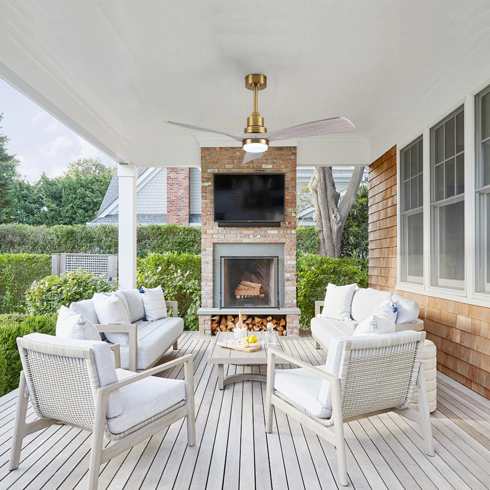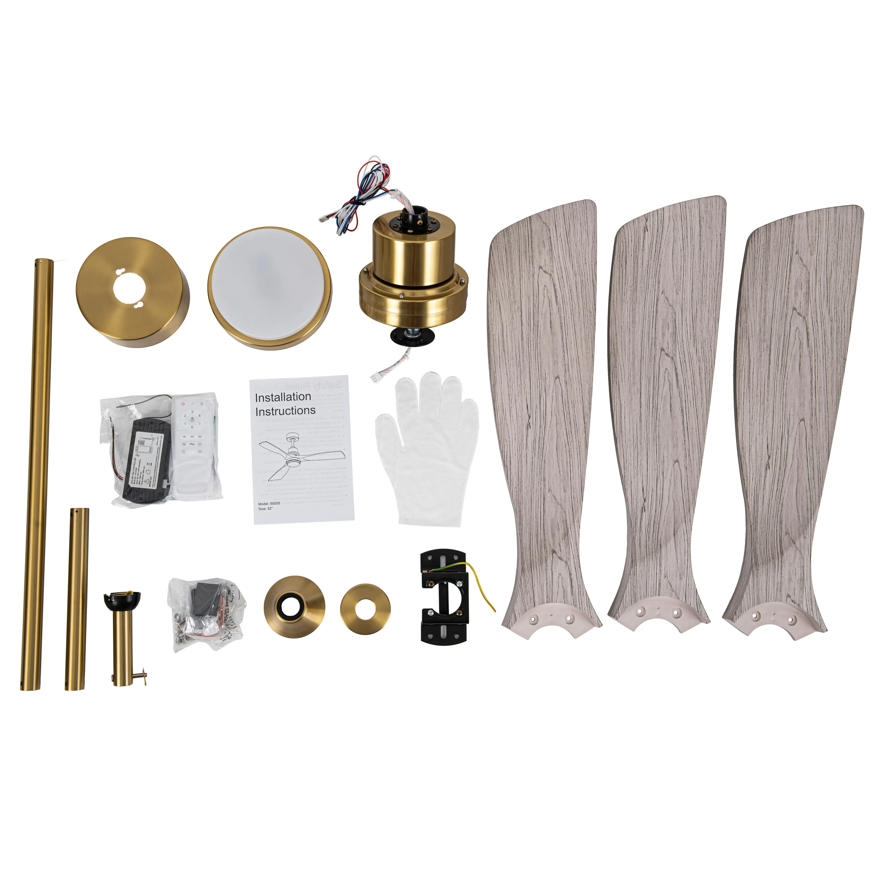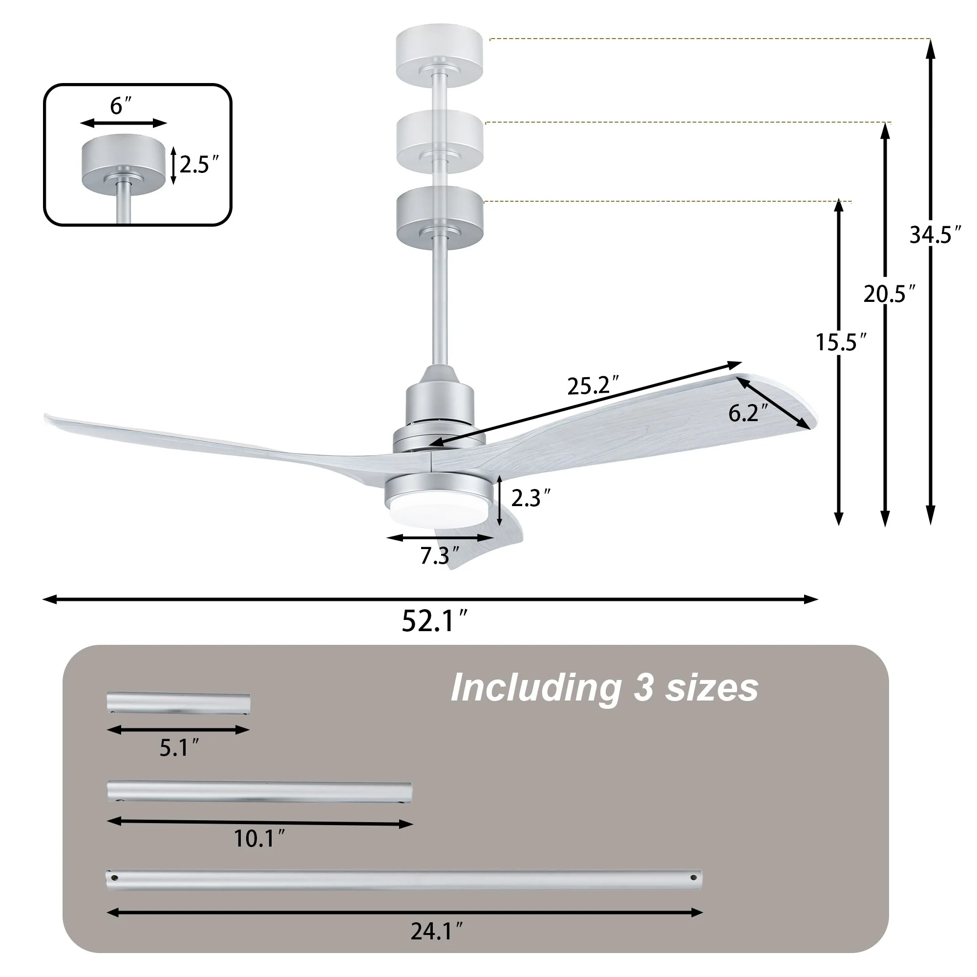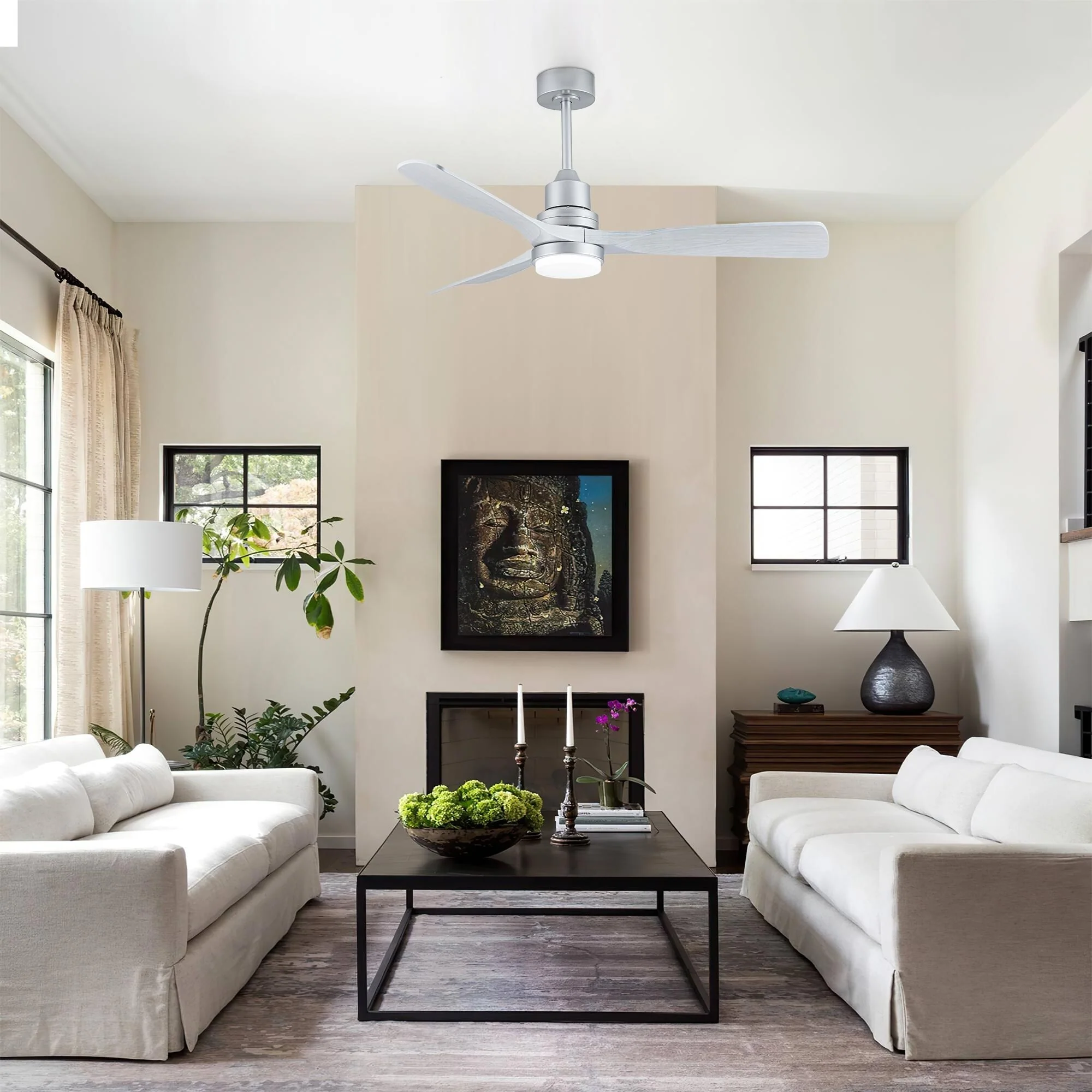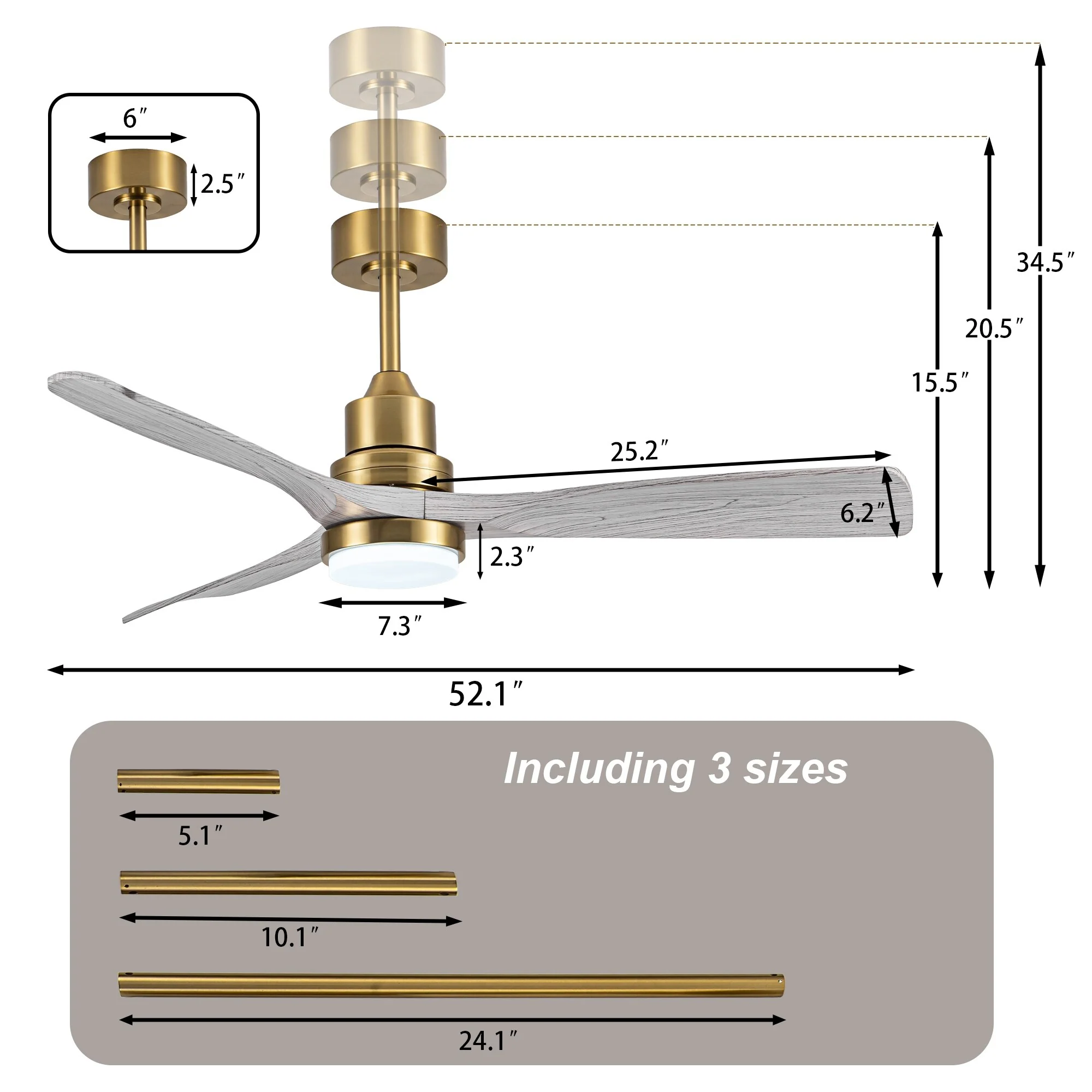 Ceiling Fan with LED light for your unique experience, creates a chic and vintage style for your home. 52" 3-blades of ABS wood-like with various classic color options. Reversible DC motor, smooth air circulation, enjoy the cool breeze four seasons. With 3 replaceable booms of different lengths to suit the ceiling height. LED light for three-color variable and remote control. Modern and rustic fusion styles, create a timeless classic. Simple lines match various decorated rooms.