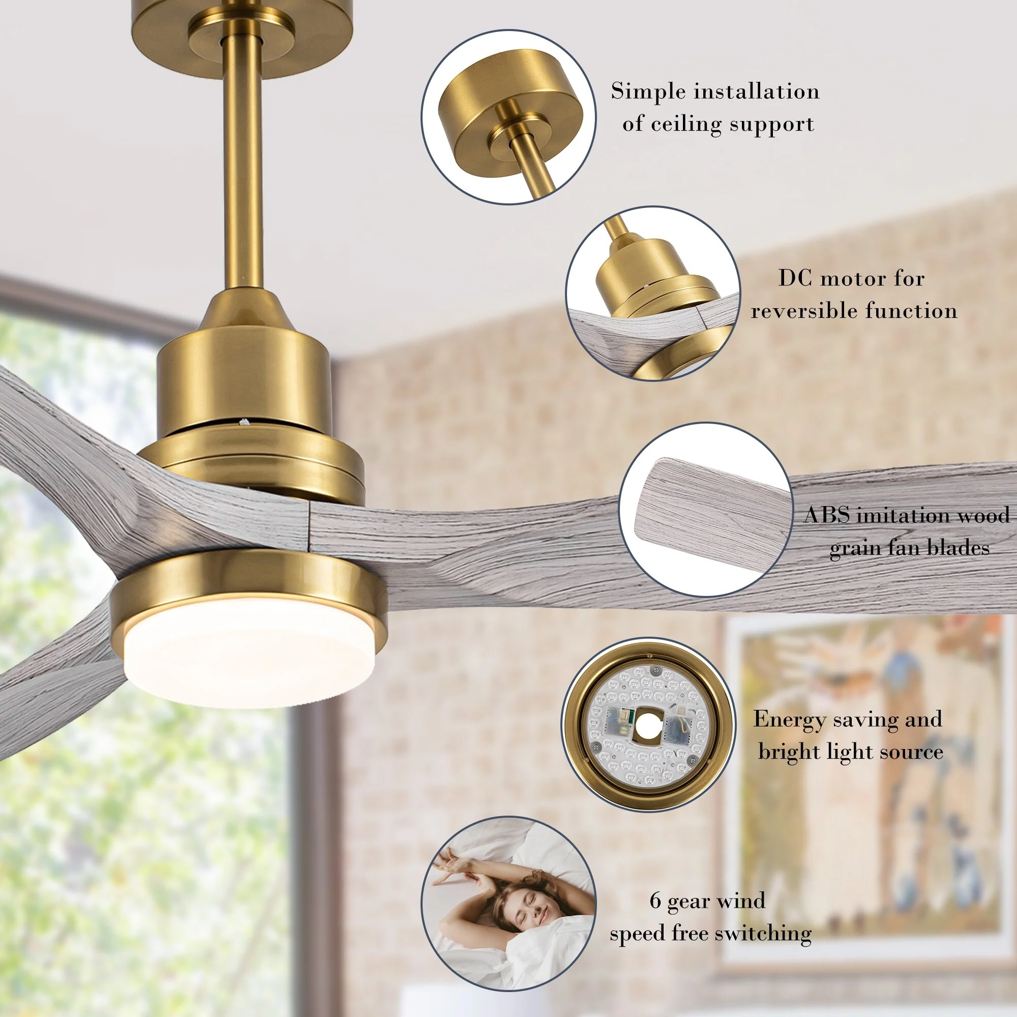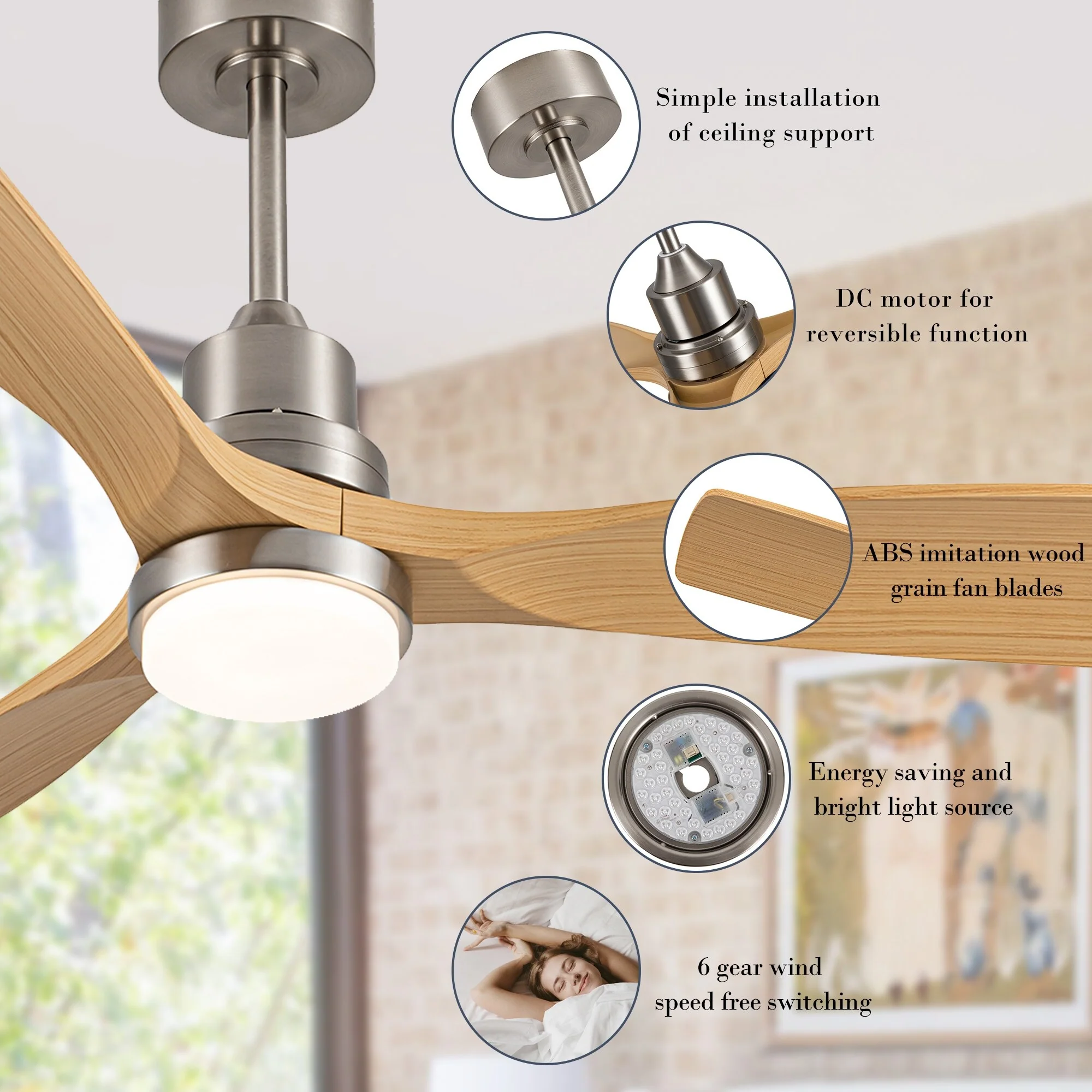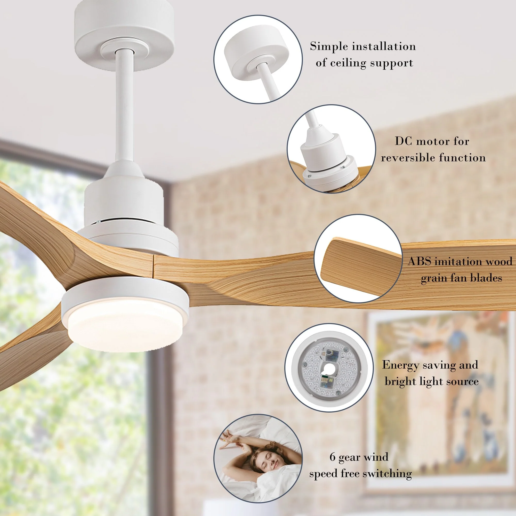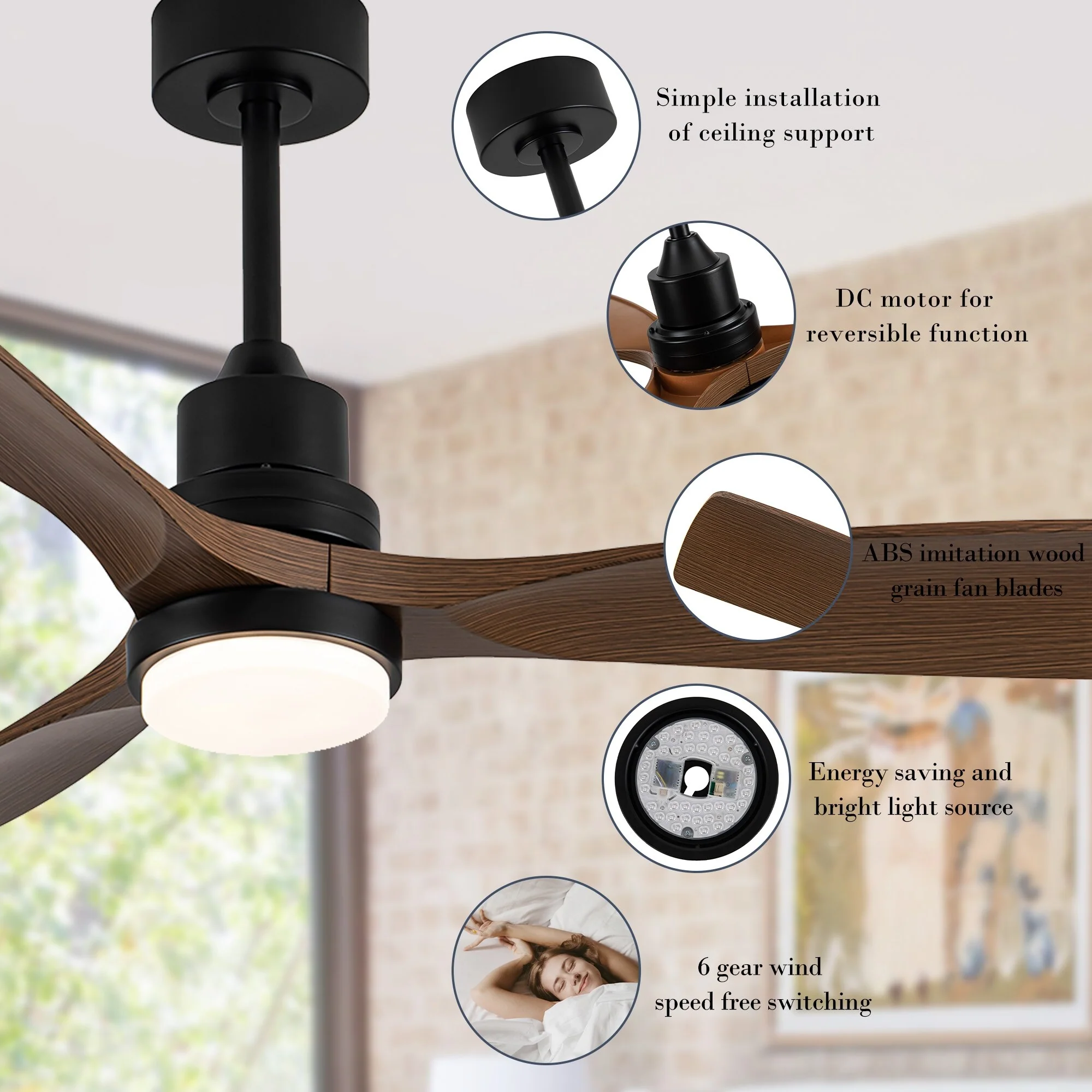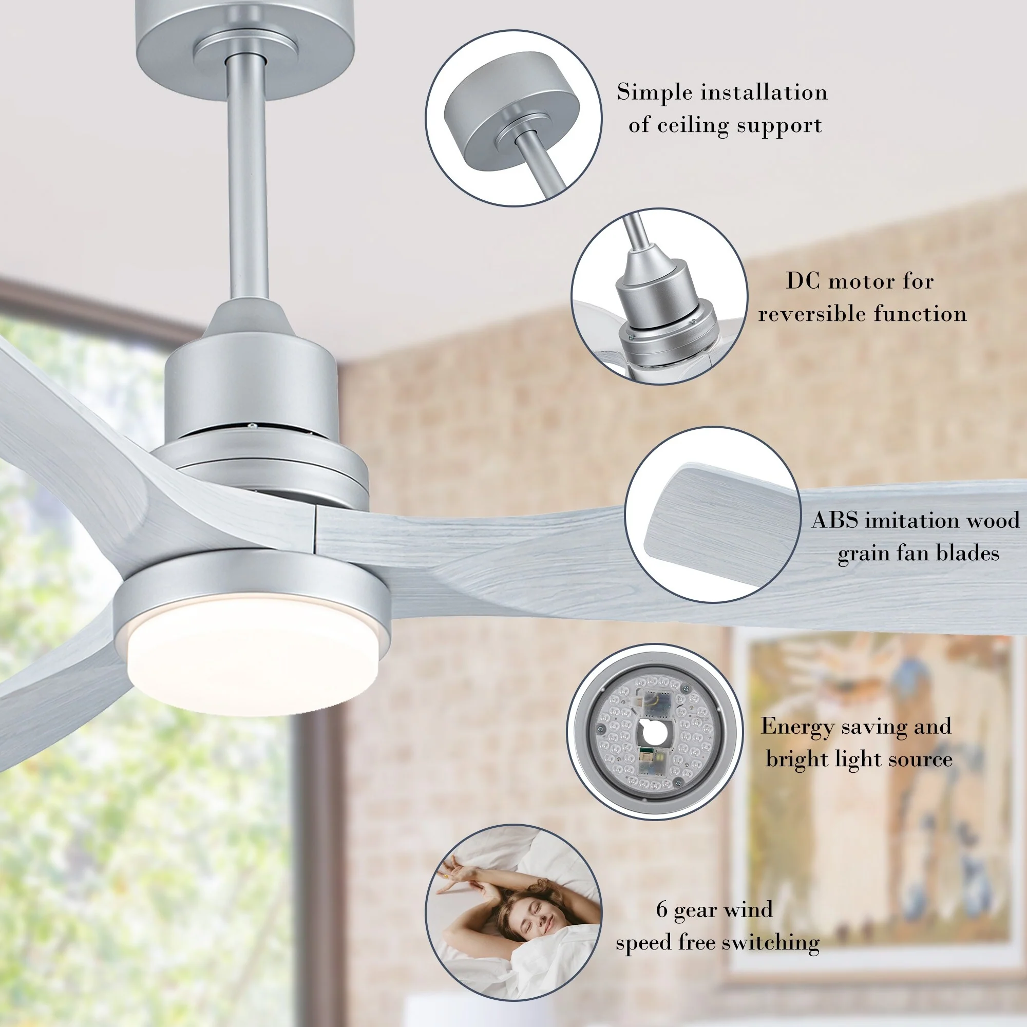 - DC motor for reversible function, according to different seasons to adjust the direction of fan rotation.