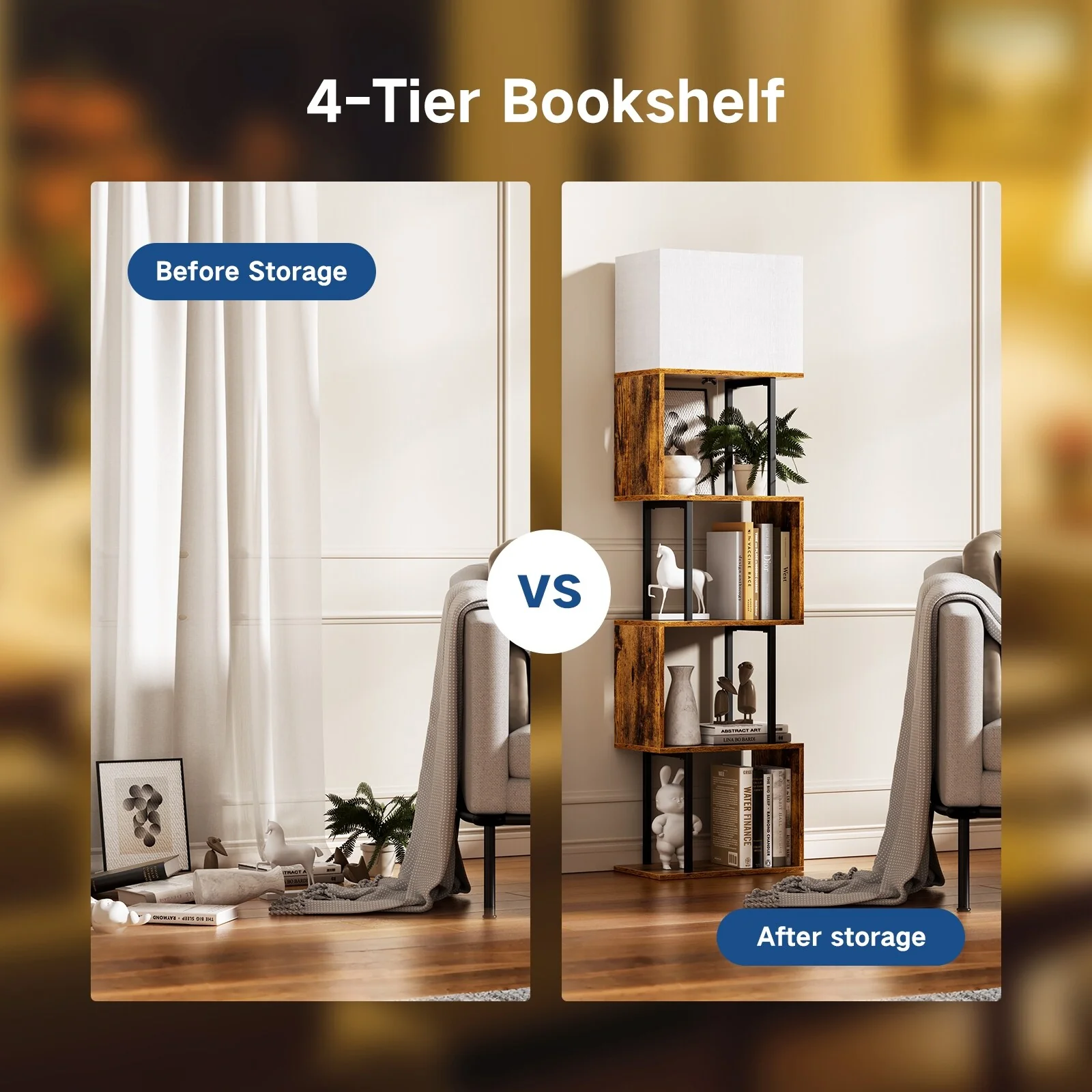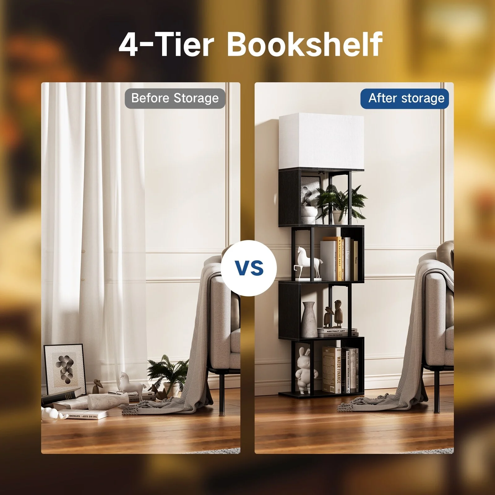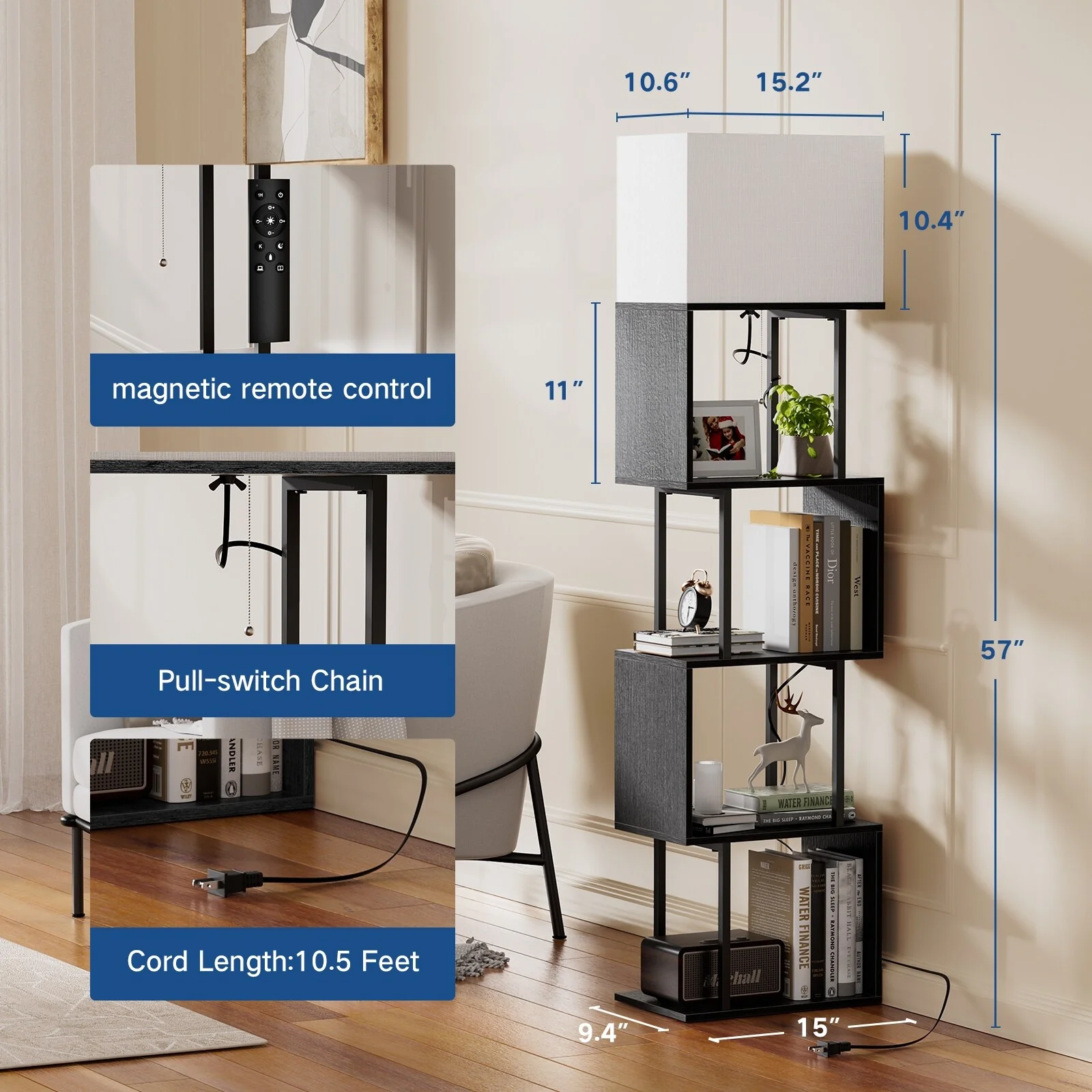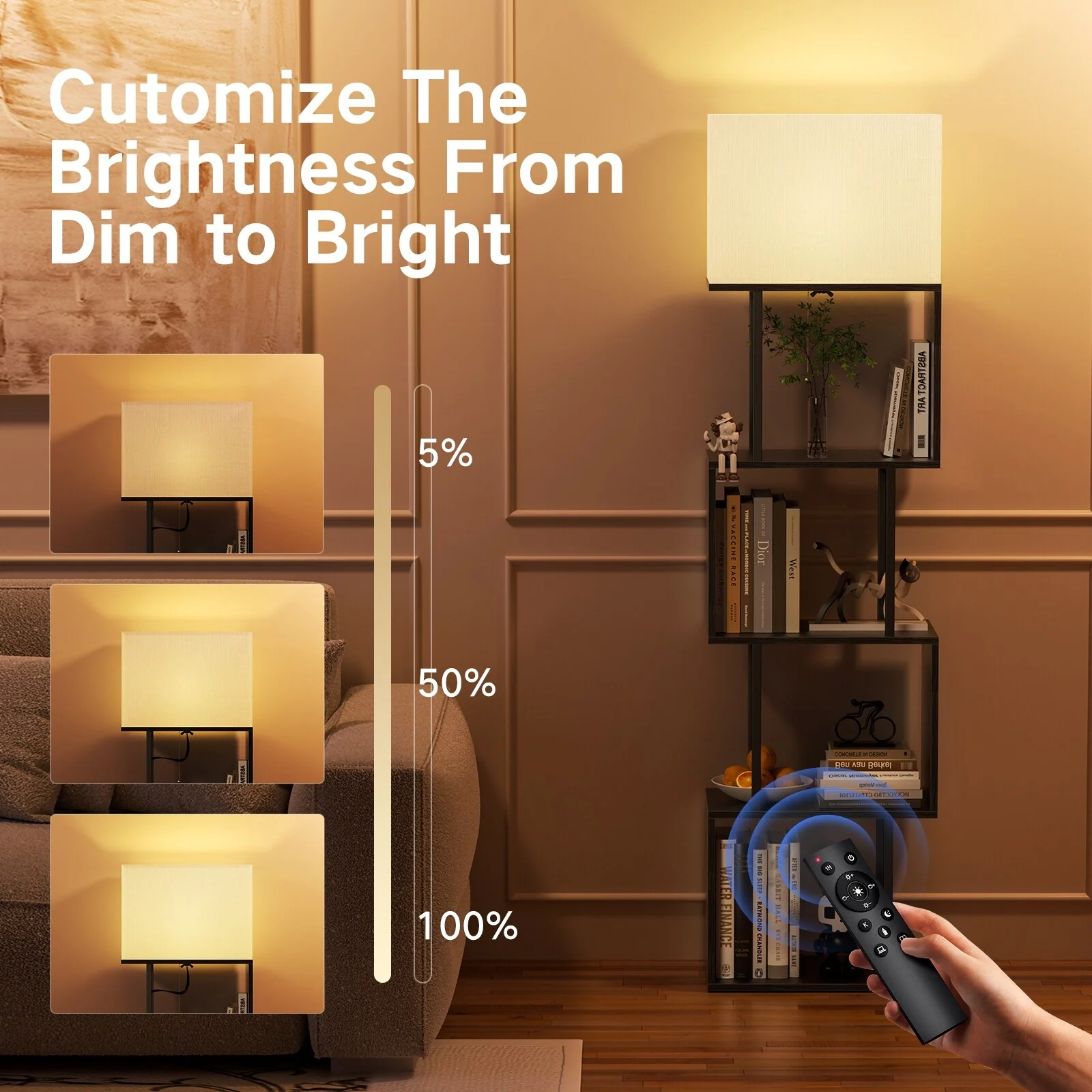 Decor your home with a stylish bookcase with lighting. Its allure will captivate, enticing the bookworm residing within you to select a book from the shelf. The included eye-friendly light is perfect for reading. Each time you enter the room, you'll relish the warm and tranquil moments of reading on the sofa. This unique contemporary design, with a free-standing bookcase that's durable, offers 4 tiers of storage for a plethora of books, while also adding a touch of style and appeal to your space. Constructed with black metal frame and premium P2 medium density fiberboard, it's water-resistant, durable, easy to clean, and features anti-falling devices to ensure stability and safety even when fully loaded with books. This multifunctional open bookcase not only displays clearly but is also user-friendly. The design with LED lights and remote control makes it versatile, serving as a bookcase, floor lamp, display stand, corner wall rack, standalone shelf unit, plant stand, and more, awaiting your exploration!