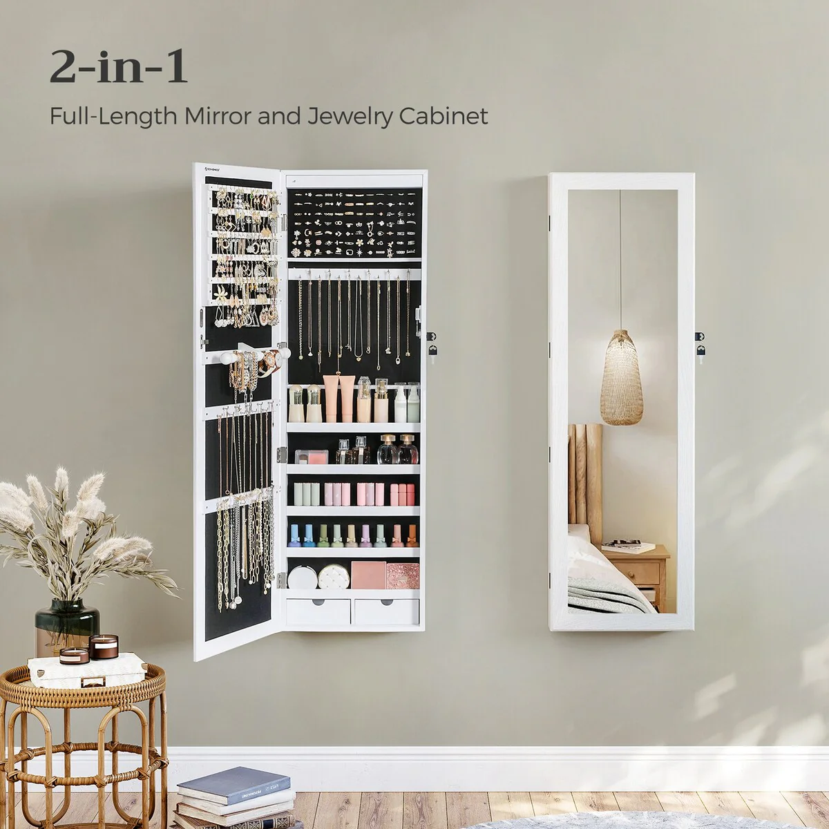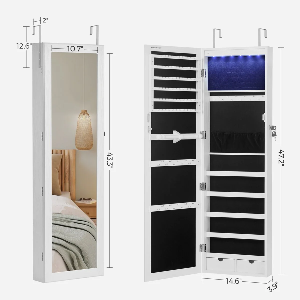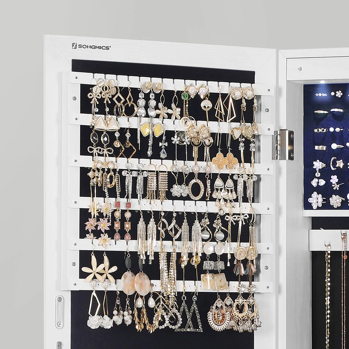 - [Specialized Jewelry Cabinet] You deserve this well-constructed and designed jewelry cabinet from SONGMICS. The solid MDF body is for long-term use and the full-length mirror is framed to avoid leaving fingerprints on it every time you use the cabinet