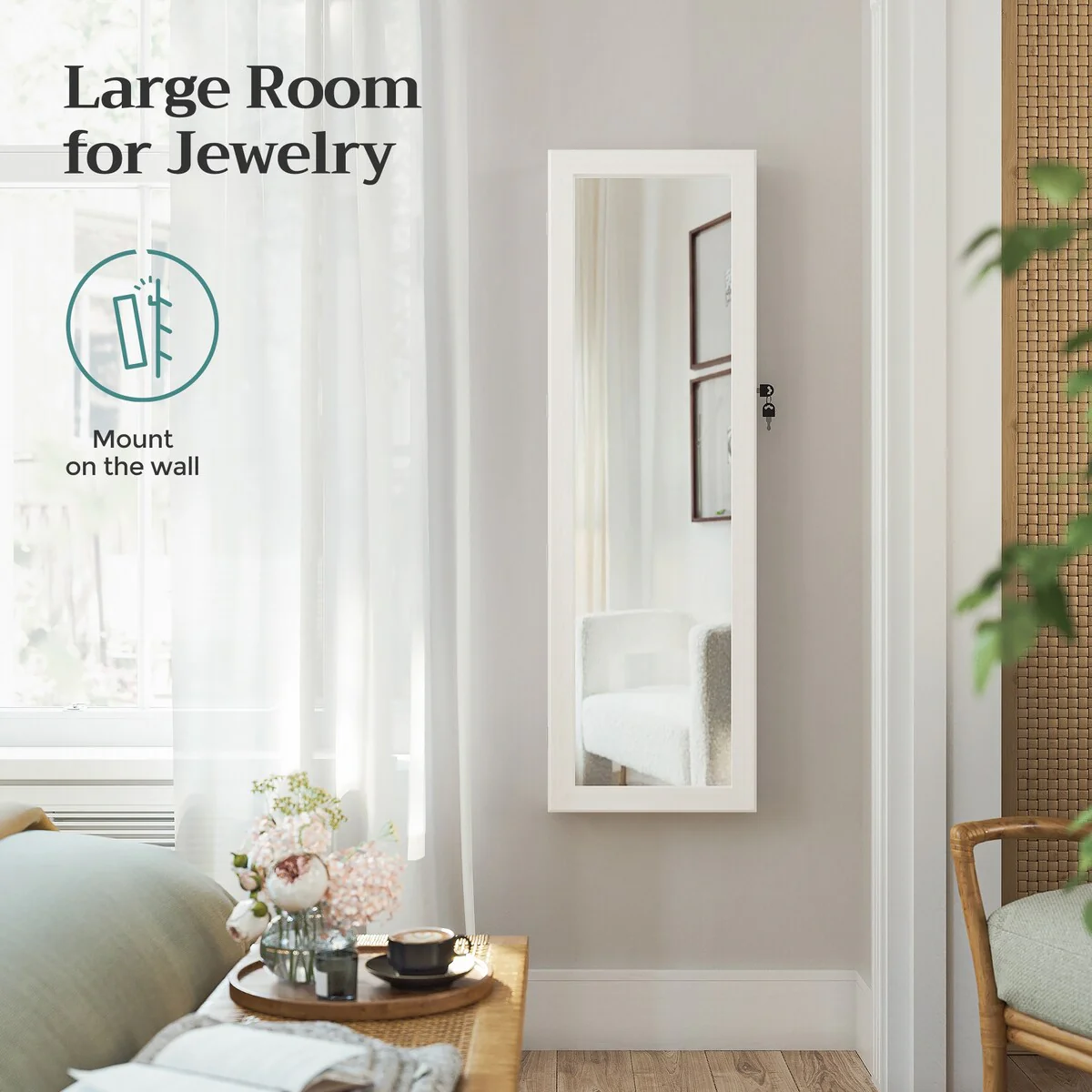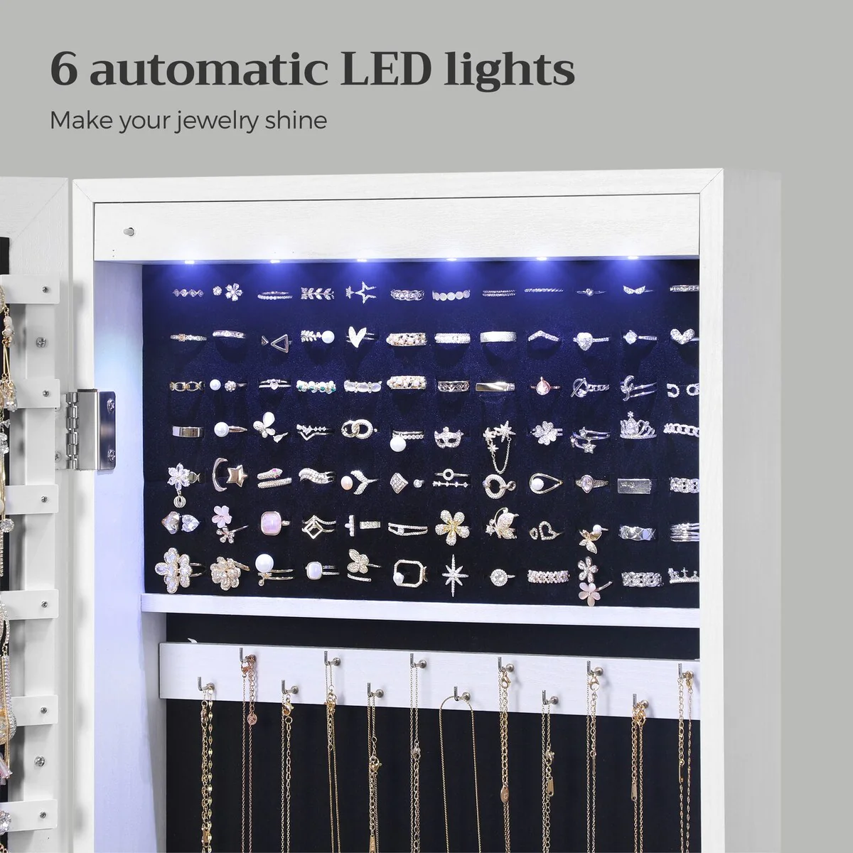- [Auto LED Lights] The 6 LED lights inside the cabinet emit cozy, soft lighting when you open the cabinet door, helping you pick out the right jewelry easily without waking up your loved one (the LED lights are powered by 3 AAA batteries, not included)