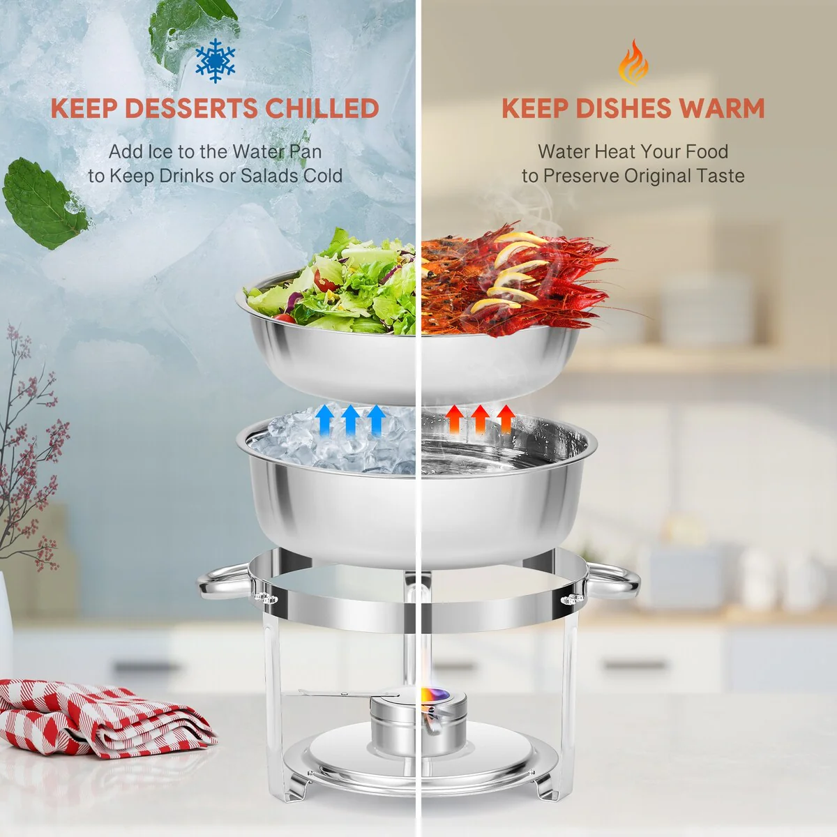 Get ready to wow every guest at your table with our chafing dish buffet set. With its generous 6 qt. capacity, it keeps the food flowing and the party going strong. But that's not all—this chafing dish set does double duty by keeping your dishes warm and your desserts or drinks chilled. Crafted from sturdy stainless steel, our buffet chafer set makes cleanup a breeze and keeps your culinary creations safe for all to enjoy. Plus, the clear glass lid allows you to sneak a peek at the mouthwatering dishes inside. Whether it's a wedding, a party, or just a fun get-together, this round chafing dish set has got you covered!