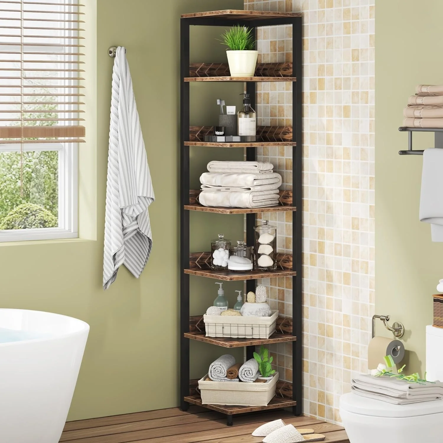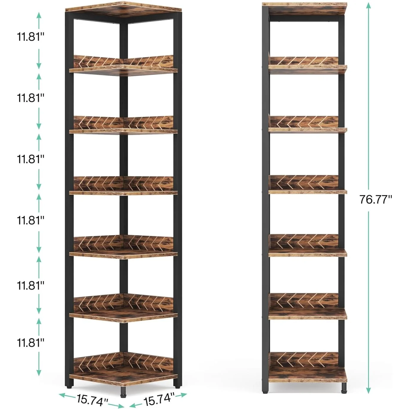 SPACE-SAVING DESIGN: With the dimensions of 15.75" W X 15.75" D X 76.77" H, this corner bookshelf makes full use of any limited small spaces or corner spaces, turning unused spaces into storage. Maximize the storage space of small space without taking up too much spaces. This storage shelf fits anywhere easily, like living room, kitchen, bathroom, and more.