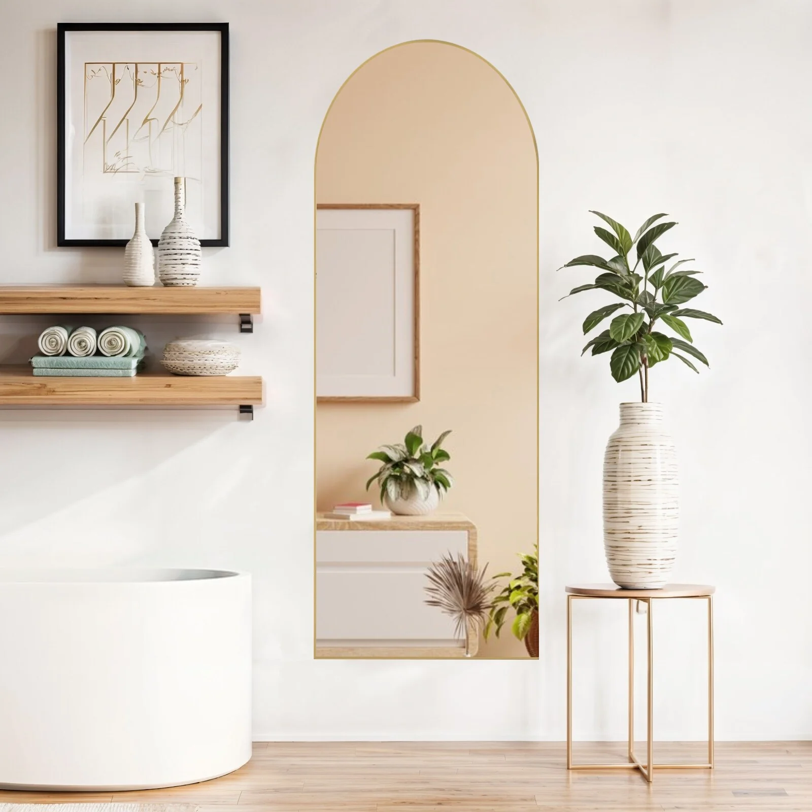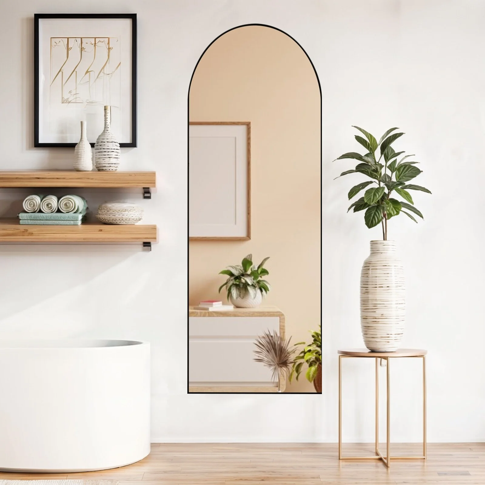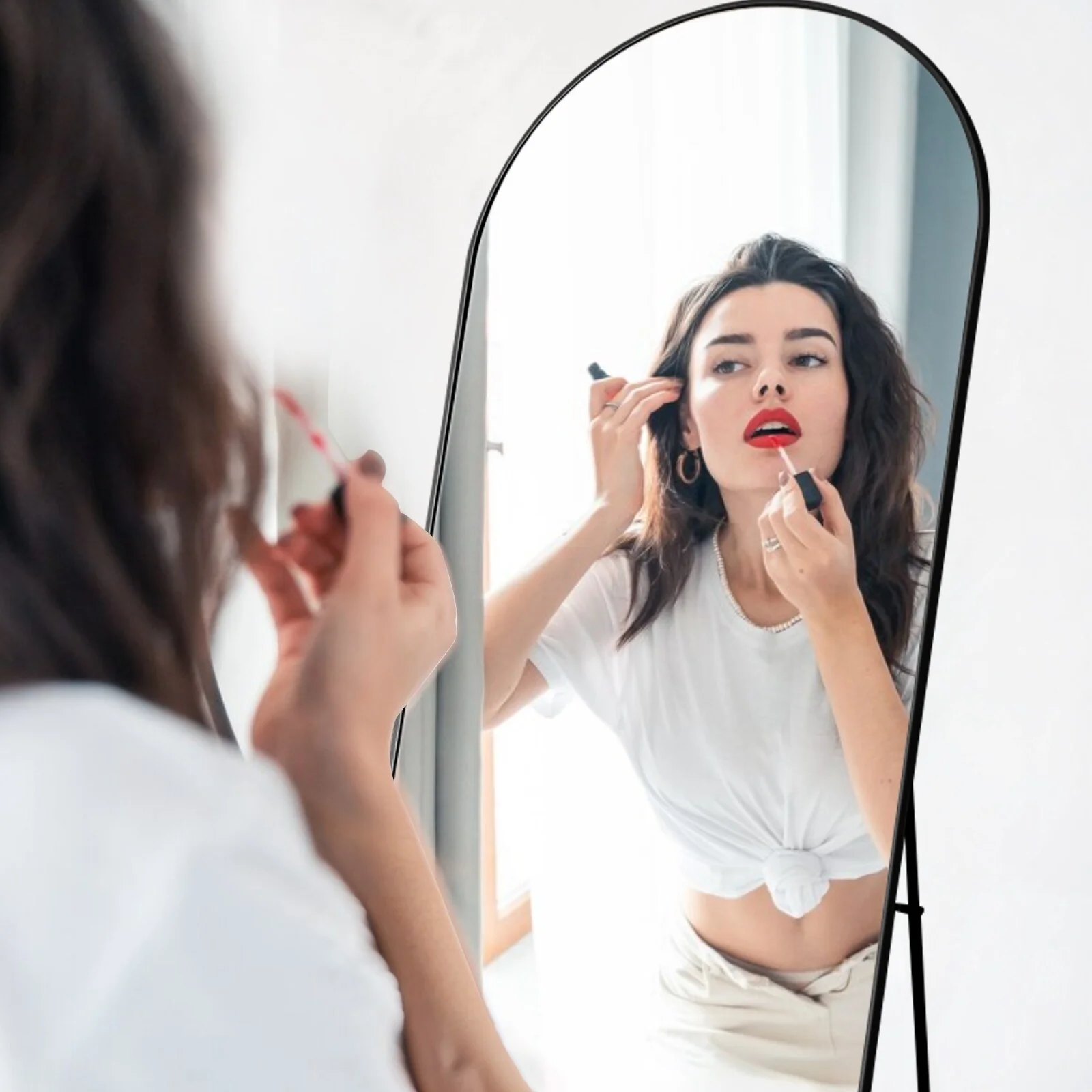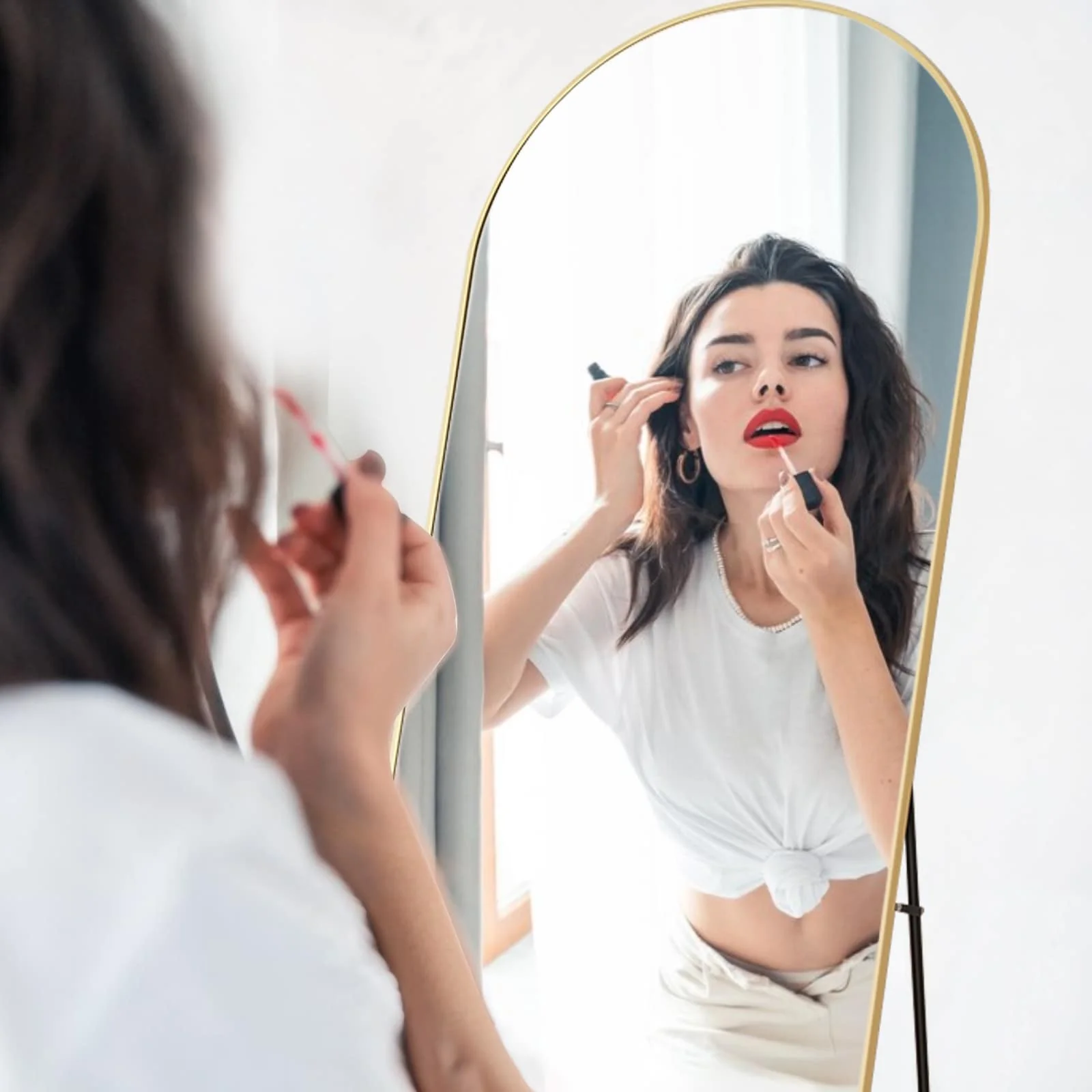 - VERSATILE AND SPACE-SAVING: This mirror requires no assembly and comes with a standing holder, allowing it to be placed anywhere in your home. It can also be leaned against a wall or vertically hung for space-saving purposes. It is a versatile piece suitable for various settings such as bedrooms, living rooms, cloakrooms, home gyms, corridors, and clothing shops.