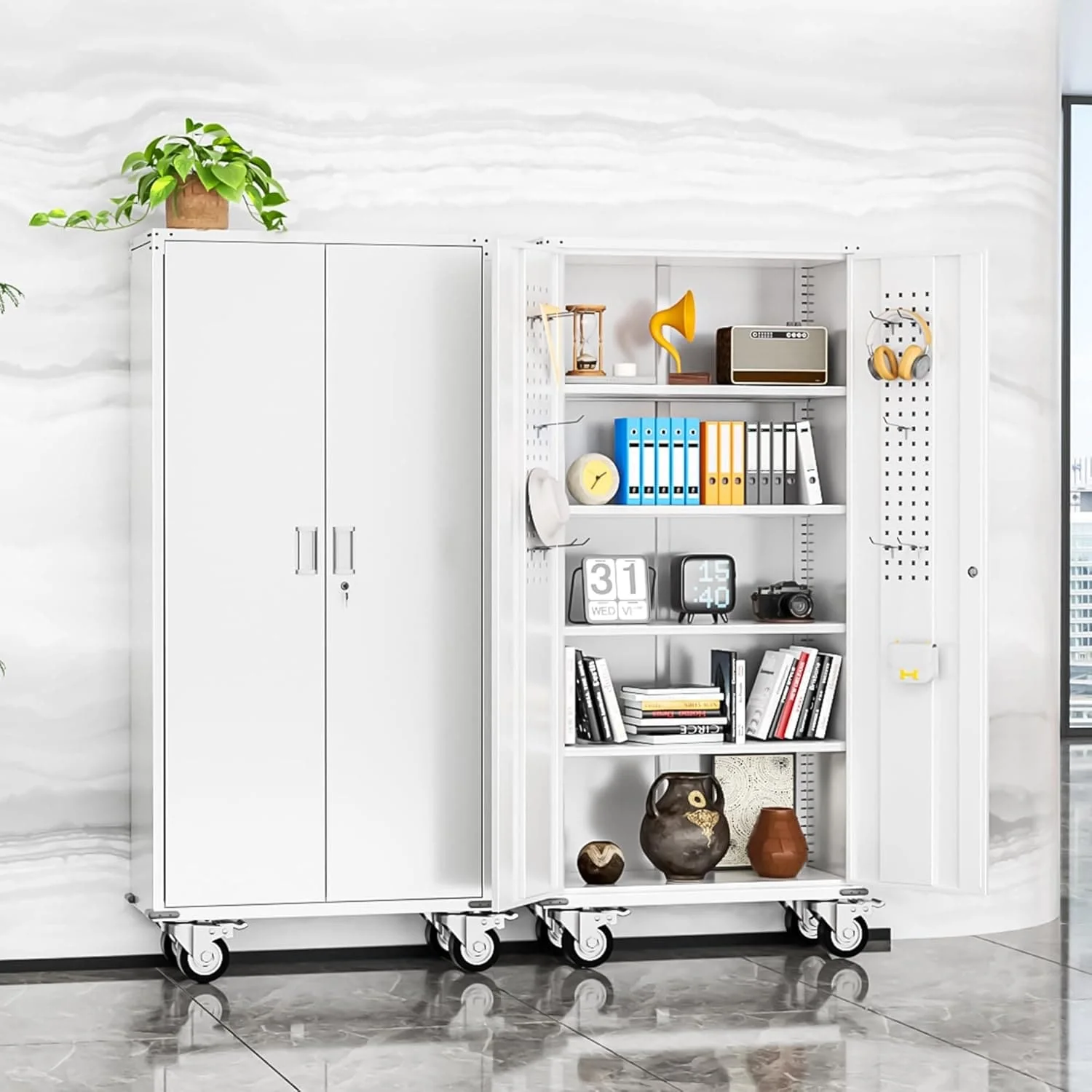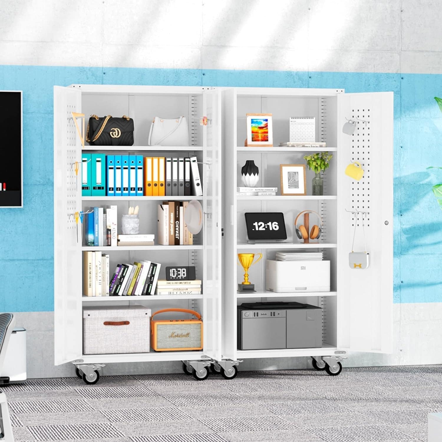 75" metal storage rolling cabinet has a large capacity to store your belongings. Equipped with 2 locking hinged doors and 4 Adjustable Shelves. Garage steel cabinet the best choice to keep your personal items and documents safe in any garage, home, office, utility room, laundry room.
