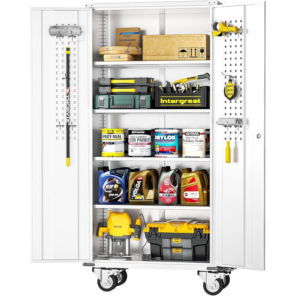 - 75'' heavy duty metal cabinet equipped with large area pegboard and 4 adjustable shelves