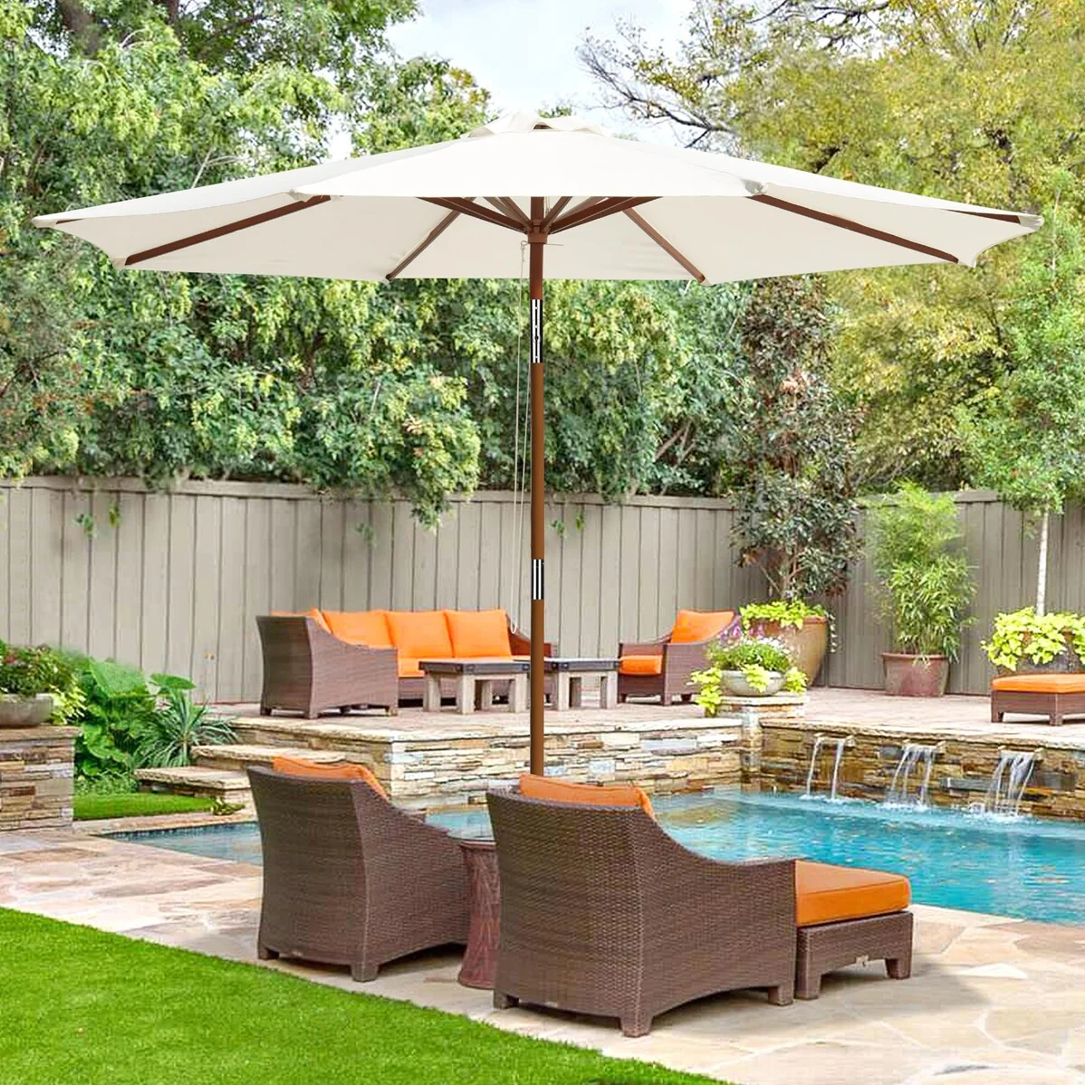 • Elegant Wooden Frame: Constructed with a classic wooden pole and ribs, adding a touch of natural elegance and timeless style to any patio or garden.