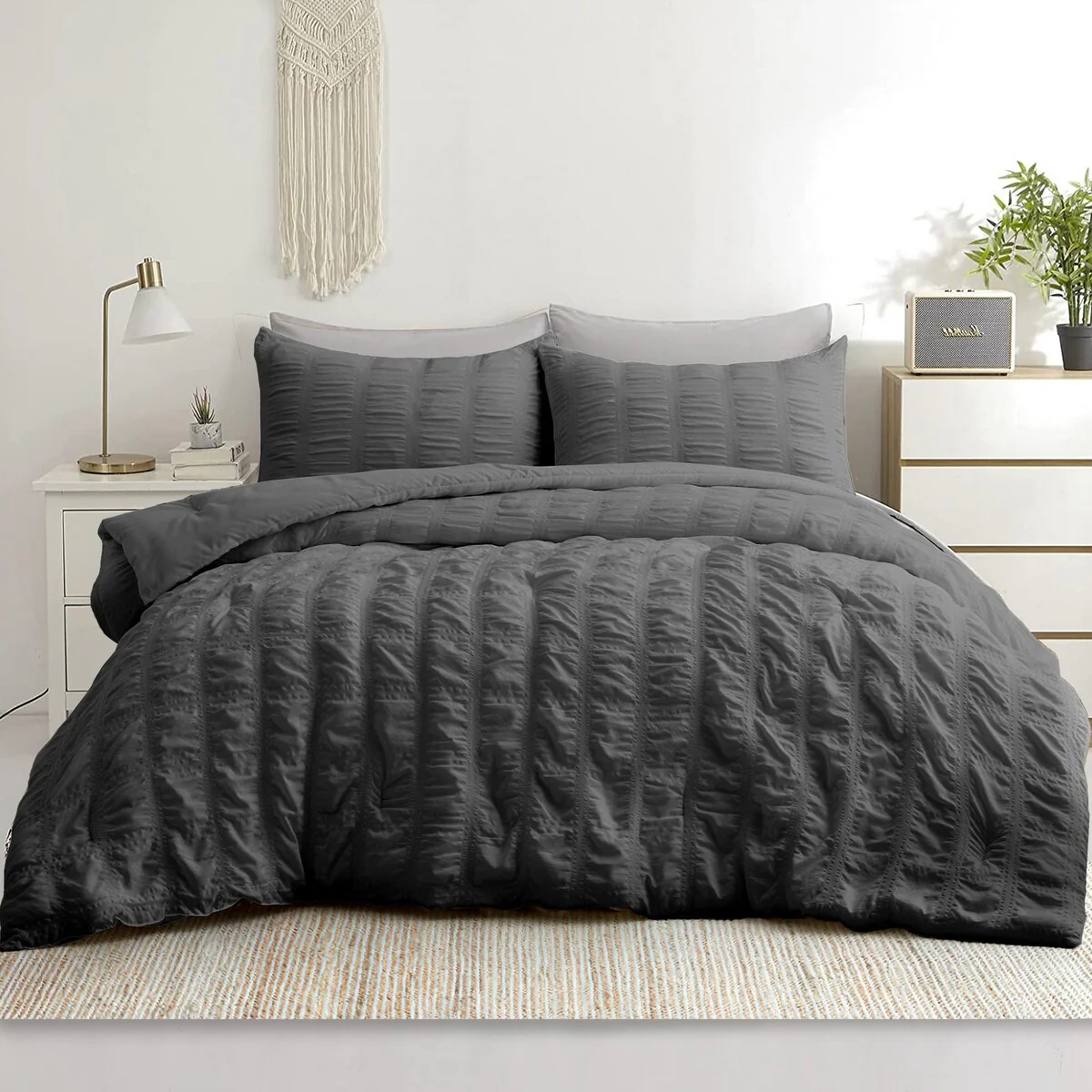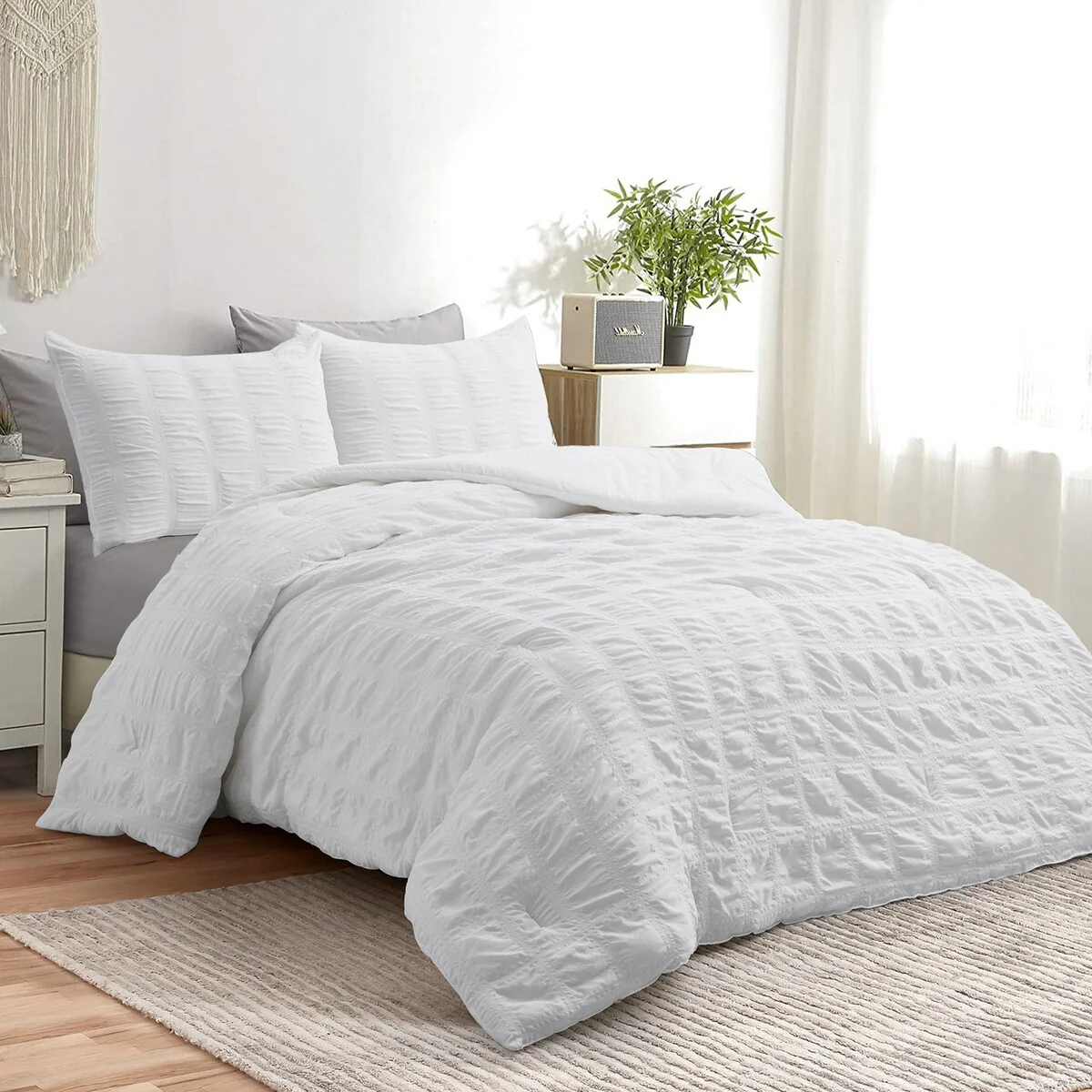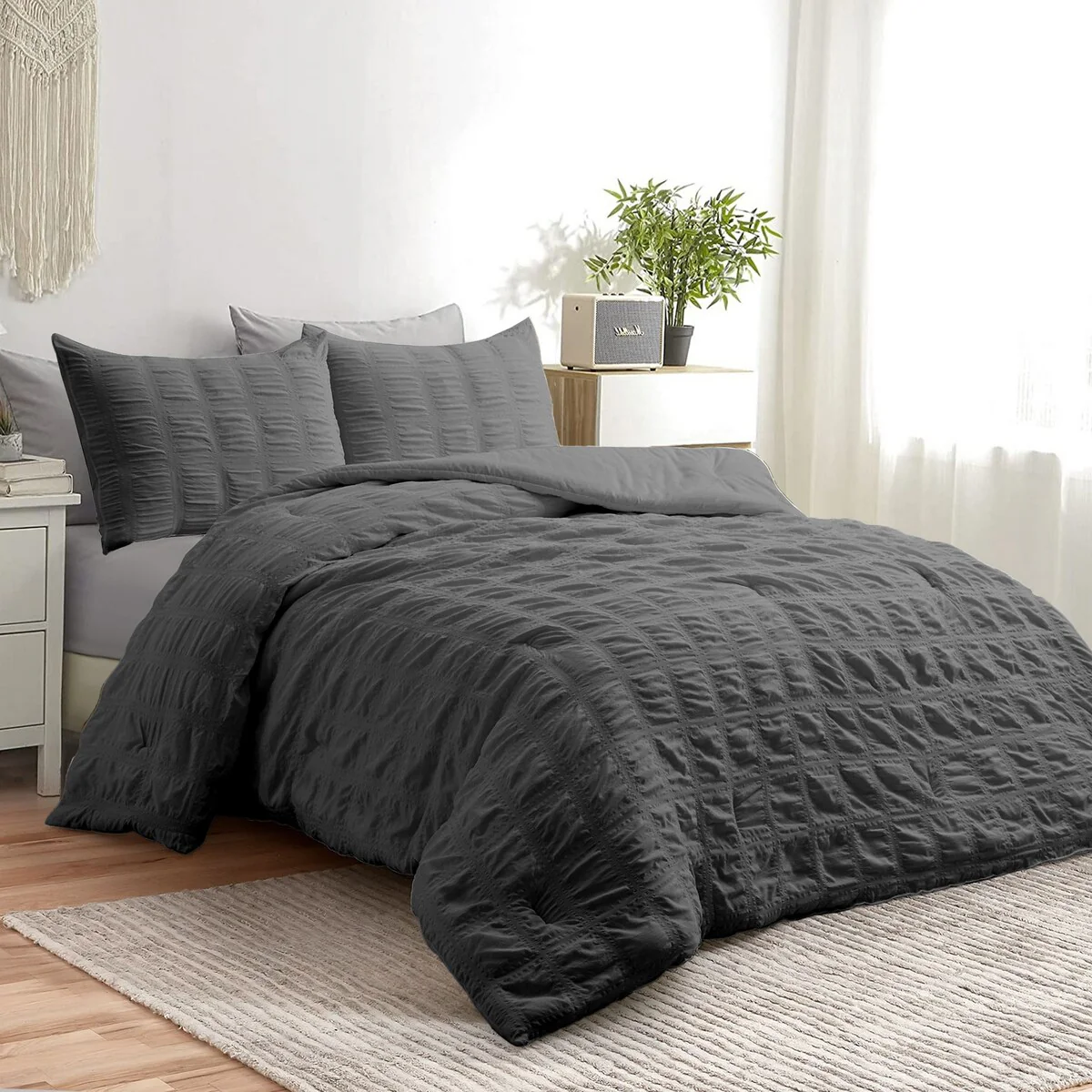 Enhance your bedroom decor with the All-Season Bubble Ruched Down Alternative Comforter Set by PeaceNest. Crafted from 100% polyester, this comforter set showcases a stunning bubble ruched design that adds texture and elegance to your sleep space. Filled with 100% polyester, it offers a medium weight that provides year-round warmth and comfort, perfect for any season. The included corner ties ensure your duvet stays securely in place, preventing it from shifting or bunching up during the night. With a hypoallergenic face and fill, this comforter set is ideal for those with allergies or sensitivities, promoting a restful and allergen-free sleep environment. Cleaning and maintaining this comforter set is a breeze as it is machine washable, allowing for easy care and convenience. Transform your bedroom into a luxurious sanctuary with the All-Season Bubble Ruched Down Alternative Comforter Set and enjoy the perfect blend of style and comfort.