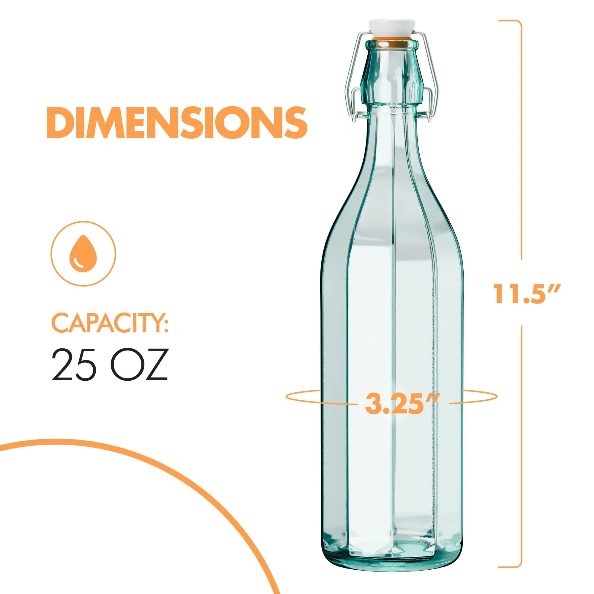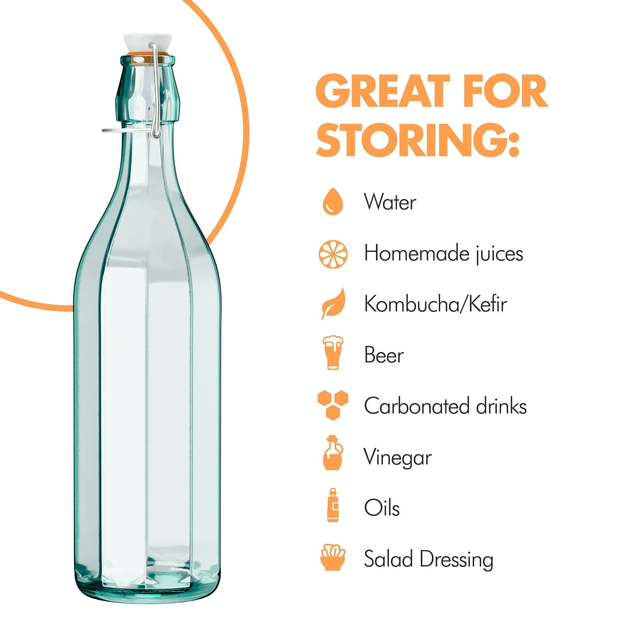 • Swing Top Glass Bottles - With a 25 Oz capacity each, these eco-friendly glass bottles with lids are excellent for storing various liquids such as water, homemade juices, kombucha, kefir, beer, carbonated drinks, vinegar, oils, salad dressing, and more.