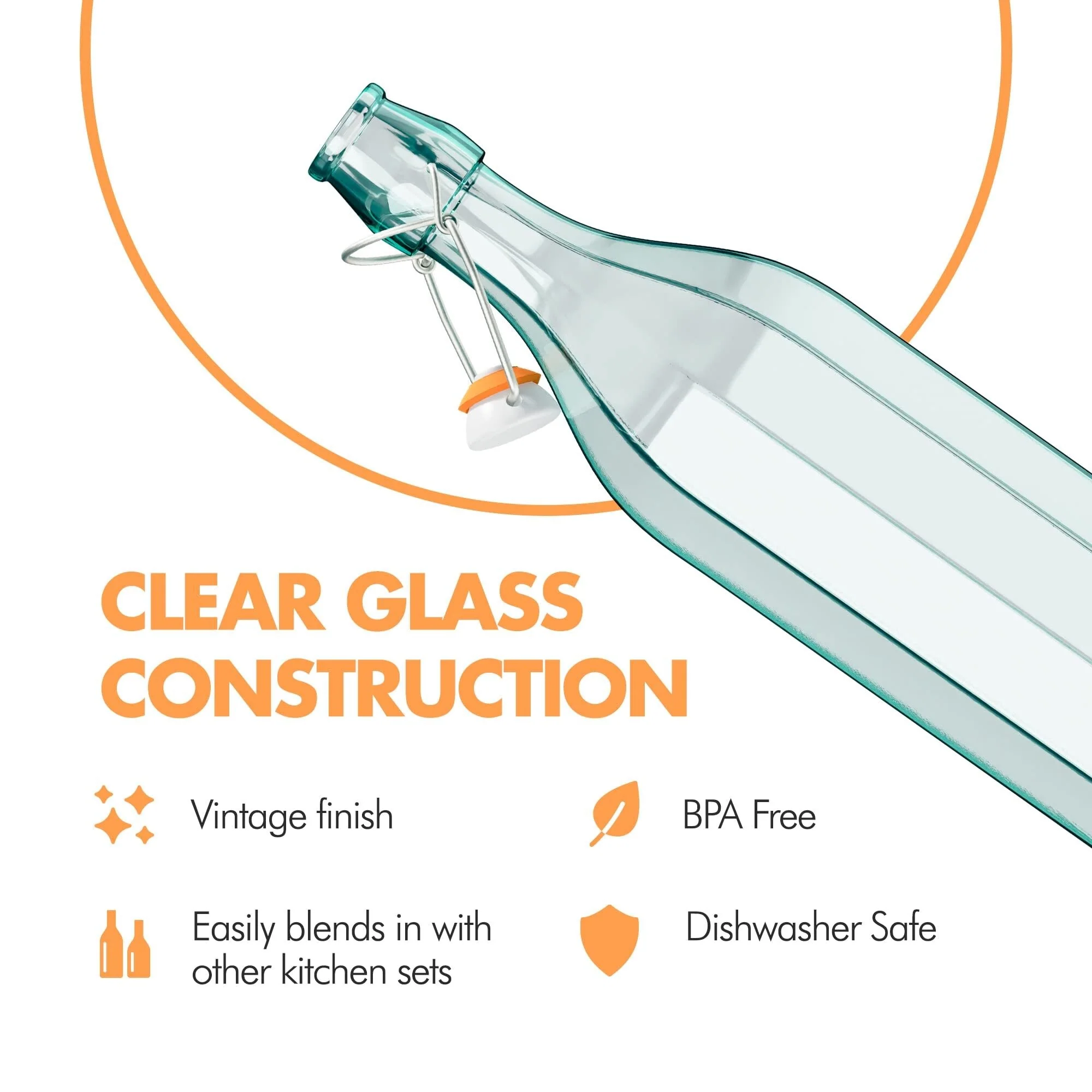 • Clear Glass - Made in Italy, our bottles with stoppers feature a vintage finish and a clear glass construction that easily blends in with any aesthetic and will complement your other kitchen sets. This also allows you to easily view the contents of the bottle.