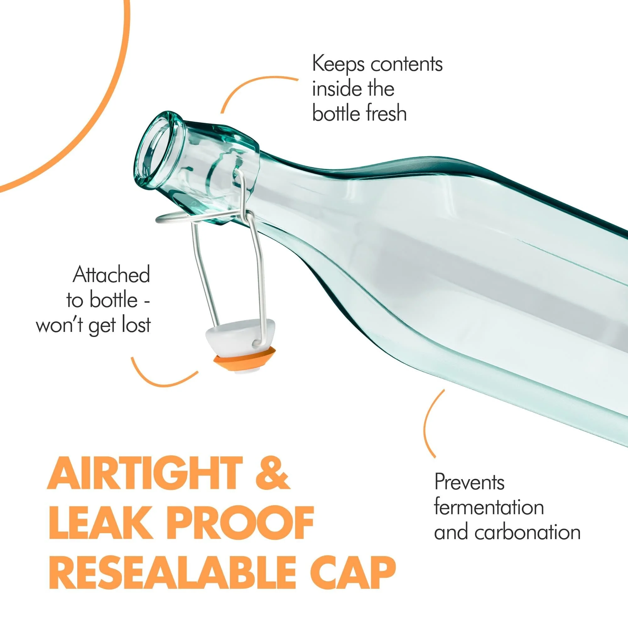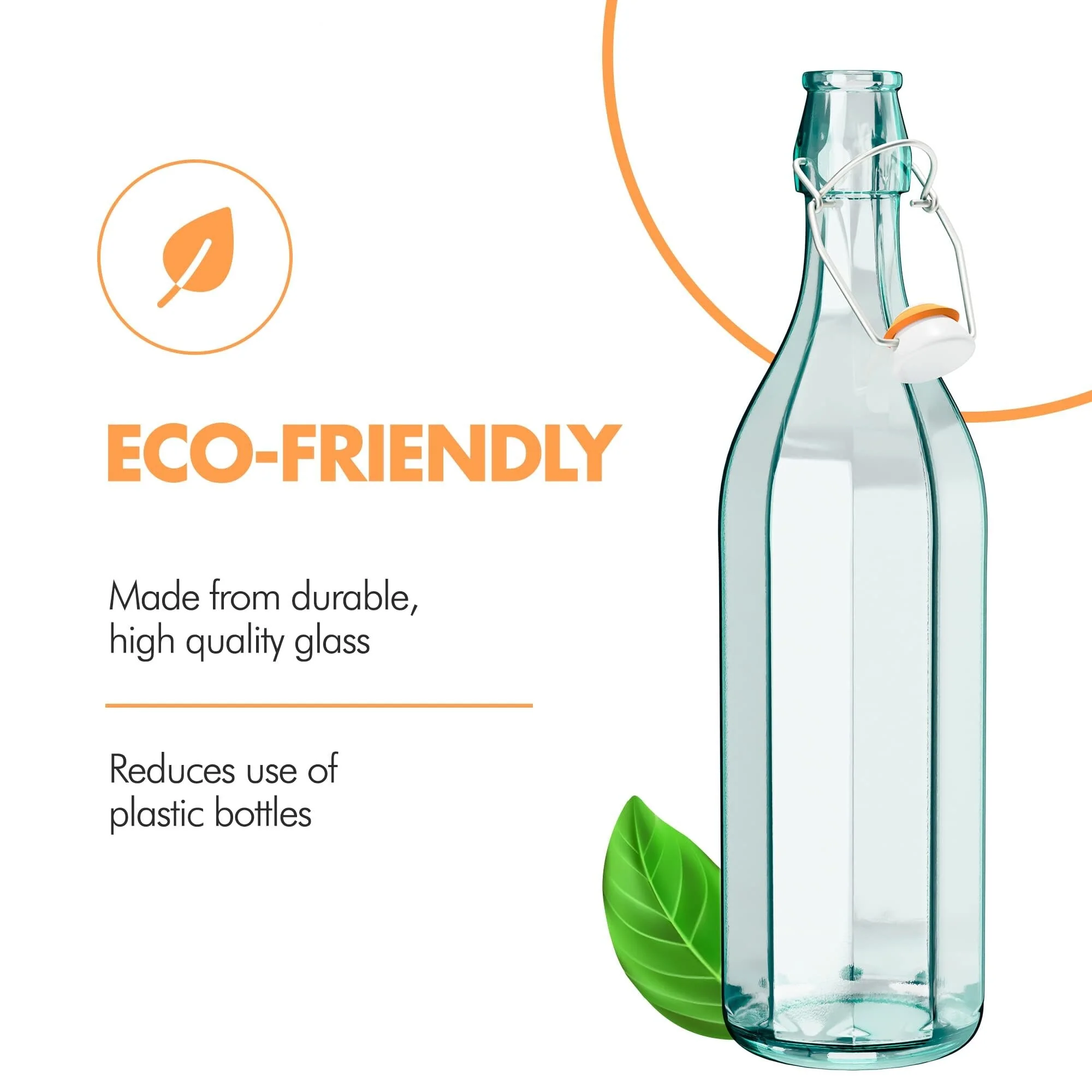• Premium Construction - Made from high quality green recycled glass, these pop top bottles are super durable and built to last for a long time. Unlike plastic, our flip top bottles do not discolor or absorb smell. They're also BPA-free and dishwasher safe.