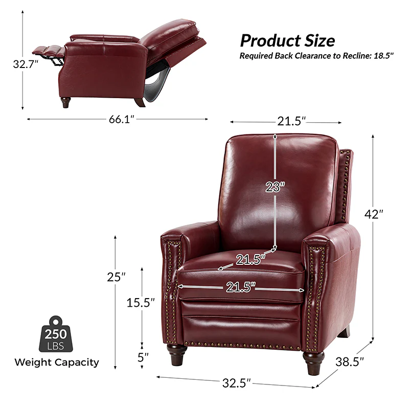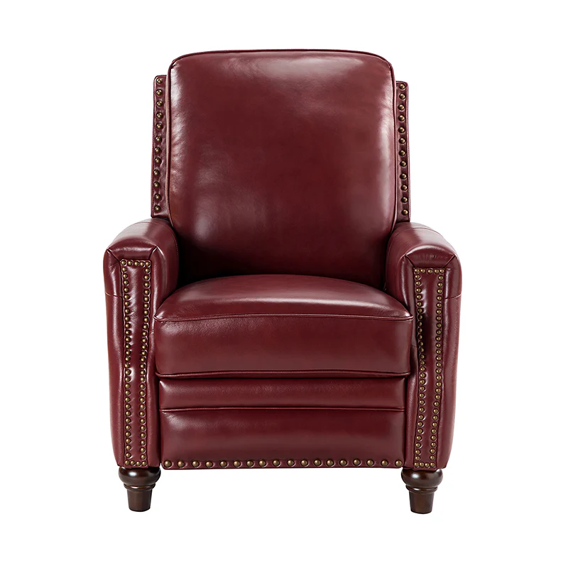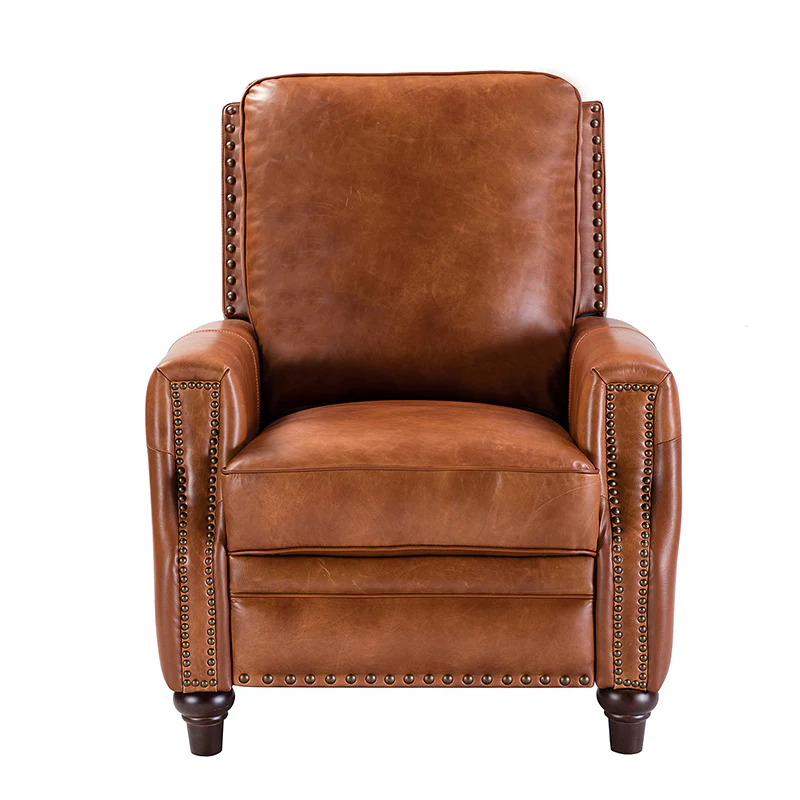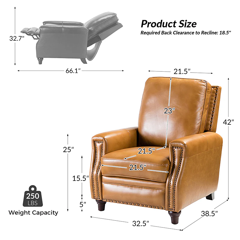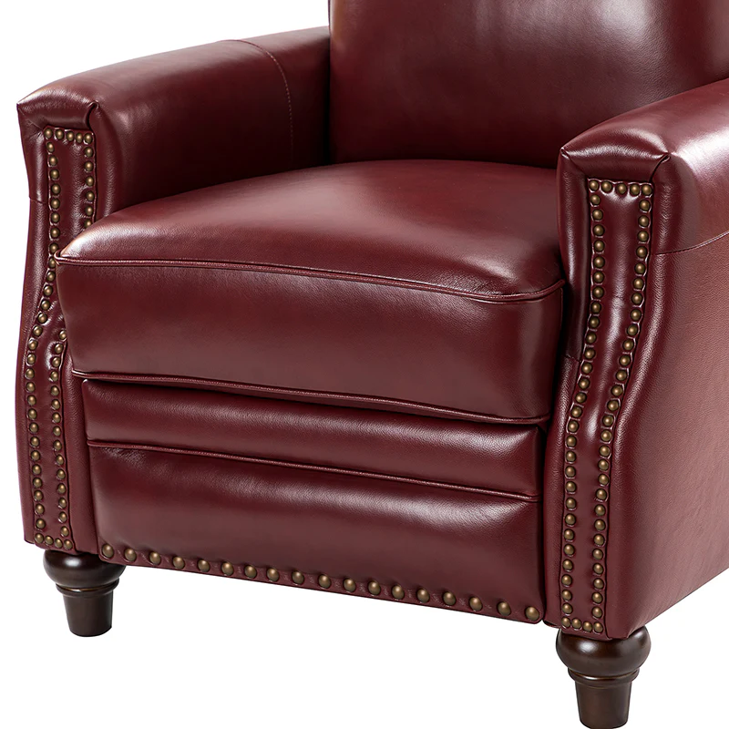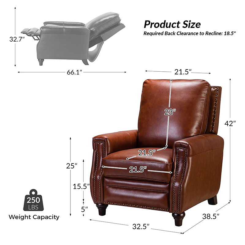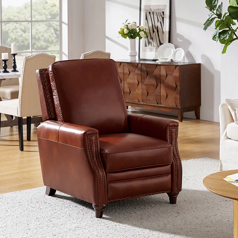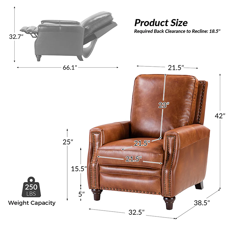Whether you need to round out your living room look or accent the master suite, this cigar recliner is the perfect spot to unwind. This genuine leather chair exudes luxury and comfort whether upright or reclining. The smooth leather adds sophistication, combining style with relaxation.The recliner chair is made of high-quality cowhide, easy to clean and maintain, you can easily clean with a dry or damp lint-free cloth. Humanization design with comfortable backrest for different using of reading books, watching TV, and sleeping, provide extreme comfort for your neck, back, and lumbar. The recliner can be perfectly matched with any decoration, offers a fashion air of sophistication to your home.