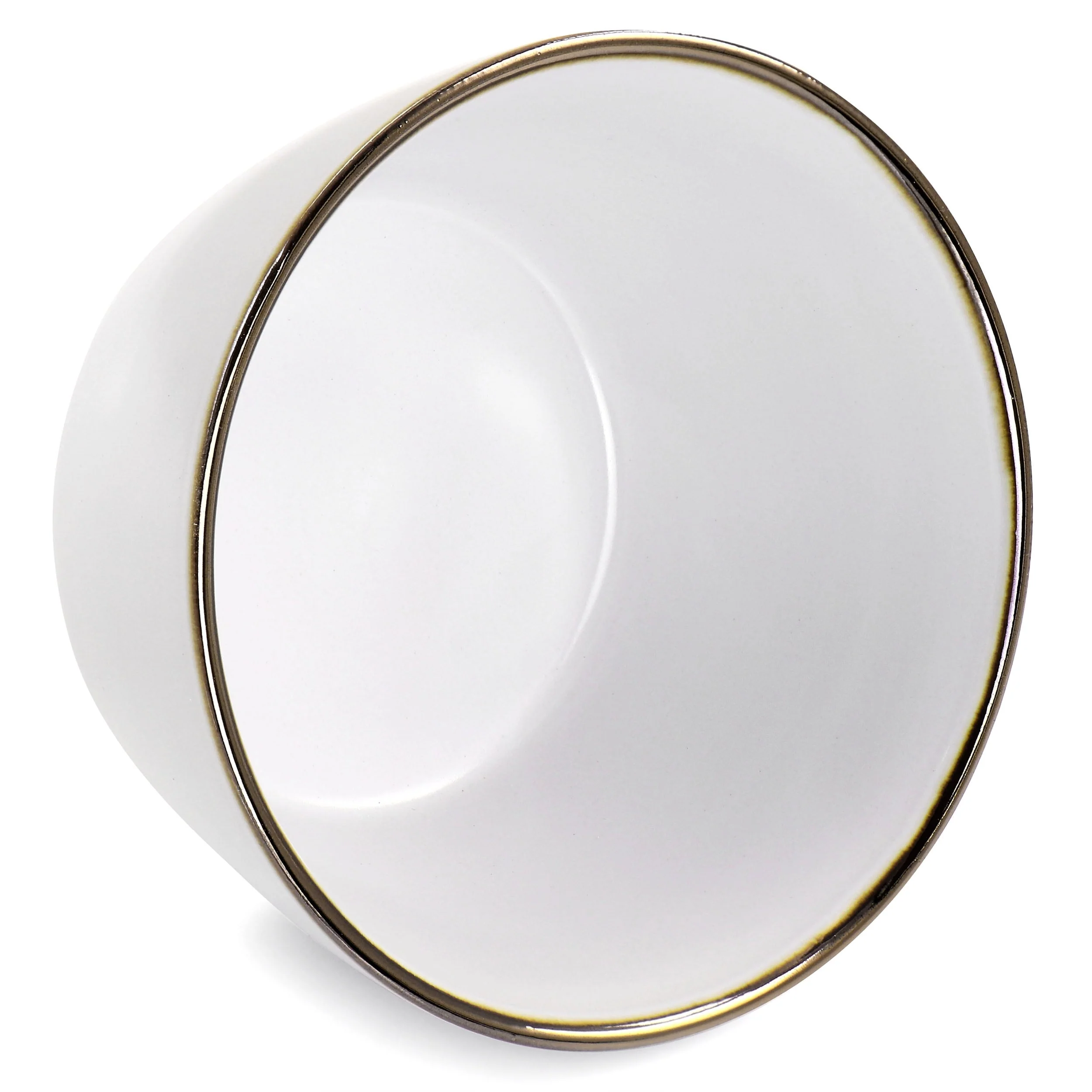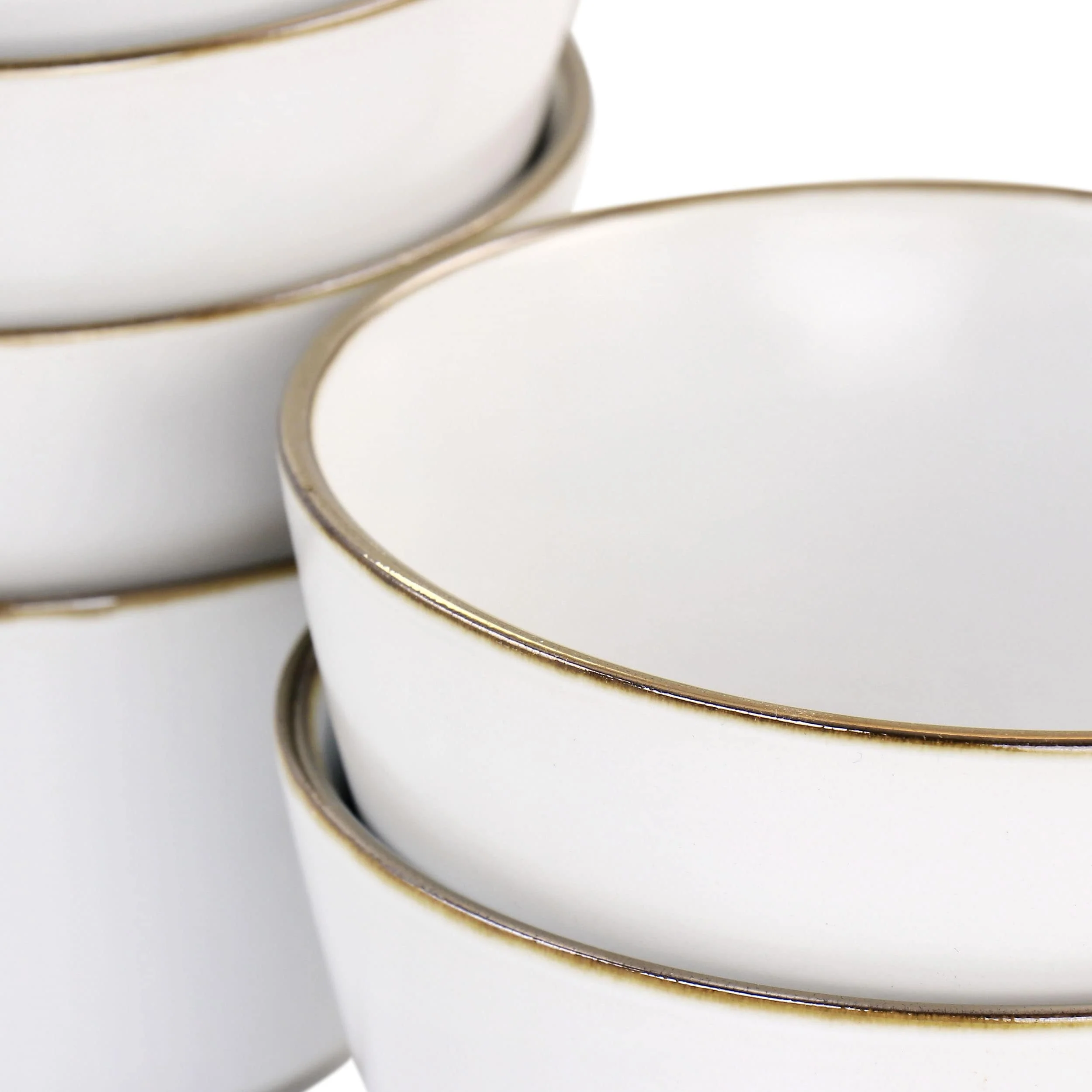 Add a beautiful accent to your dining table with the Arthur 6 Piece Bowl Set in sophisticated Matte White with Gold Rim Trim. Each piece is creatively crafted with a unique flat base and trimmed in gold. Beautifully finished off with a thin elegant gold rim, this set is a statement piece. Constructed of Stoneware, these bowls are ideal for special occasion gatherings and sturdy for every day use. Each bowl is microwave safe for quick reheating and dishwasher safe for easy cleaning. Mix an match with new pieces and pieces you've collected over the years. Item Dimensions: 12.00" x 7.50" x 2.00"Item Weight: 7.00lbs