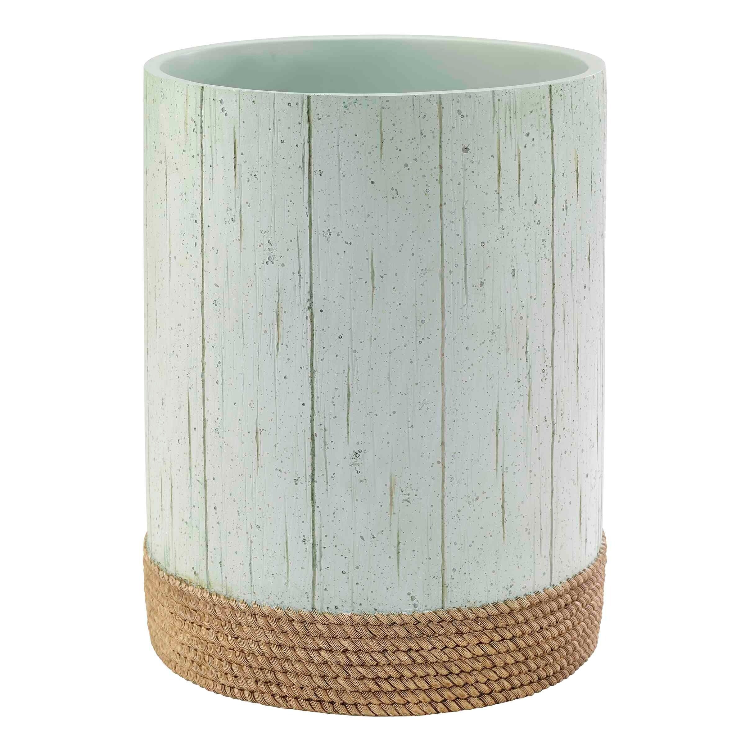 The Avanti Beachcomber Wastebasket sports a starfish and coral motif in off-white, beige and teal and "Welcome to the Shore" on an aqua clapboard background. It's finished with a rope border at the bottom. Crafted in durable hand-painted resin for easy care and long life.
